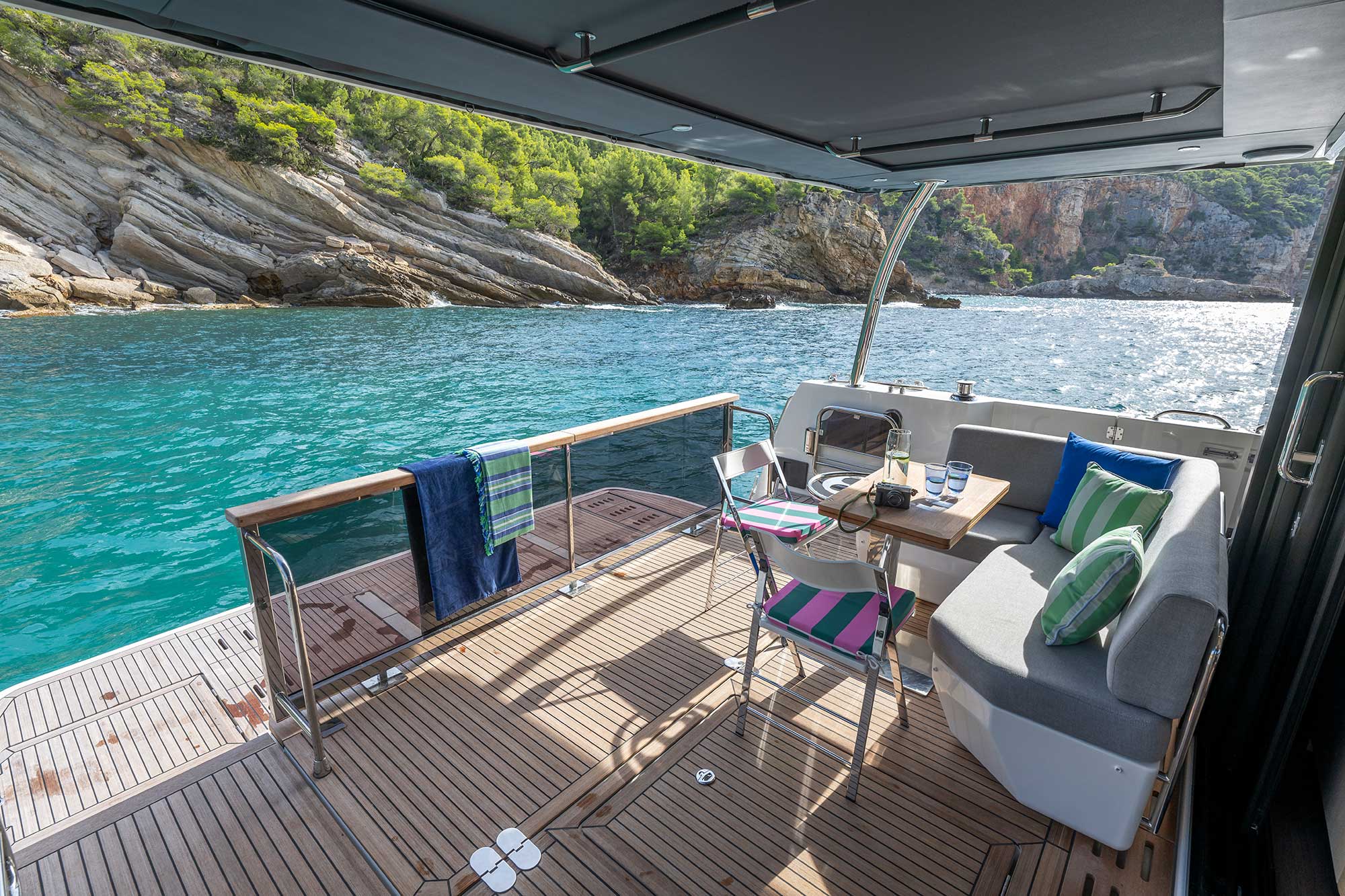 The innovative Swift Trawler 54 passagemaker includes a stunning cockpit and a spacious flybridge, all with soft seating and luxury touches. It offers a terrace to the sea. The stern boasts a 400 kg tender lift, ample storage for kayaks and paddleboards and a hydraulic swim platform with adaptive dinghy chocks. On the foredeck, the U-shaped seating area with an inset table easily converts into a huge sunpad, with dedicated fender stowage underneath.