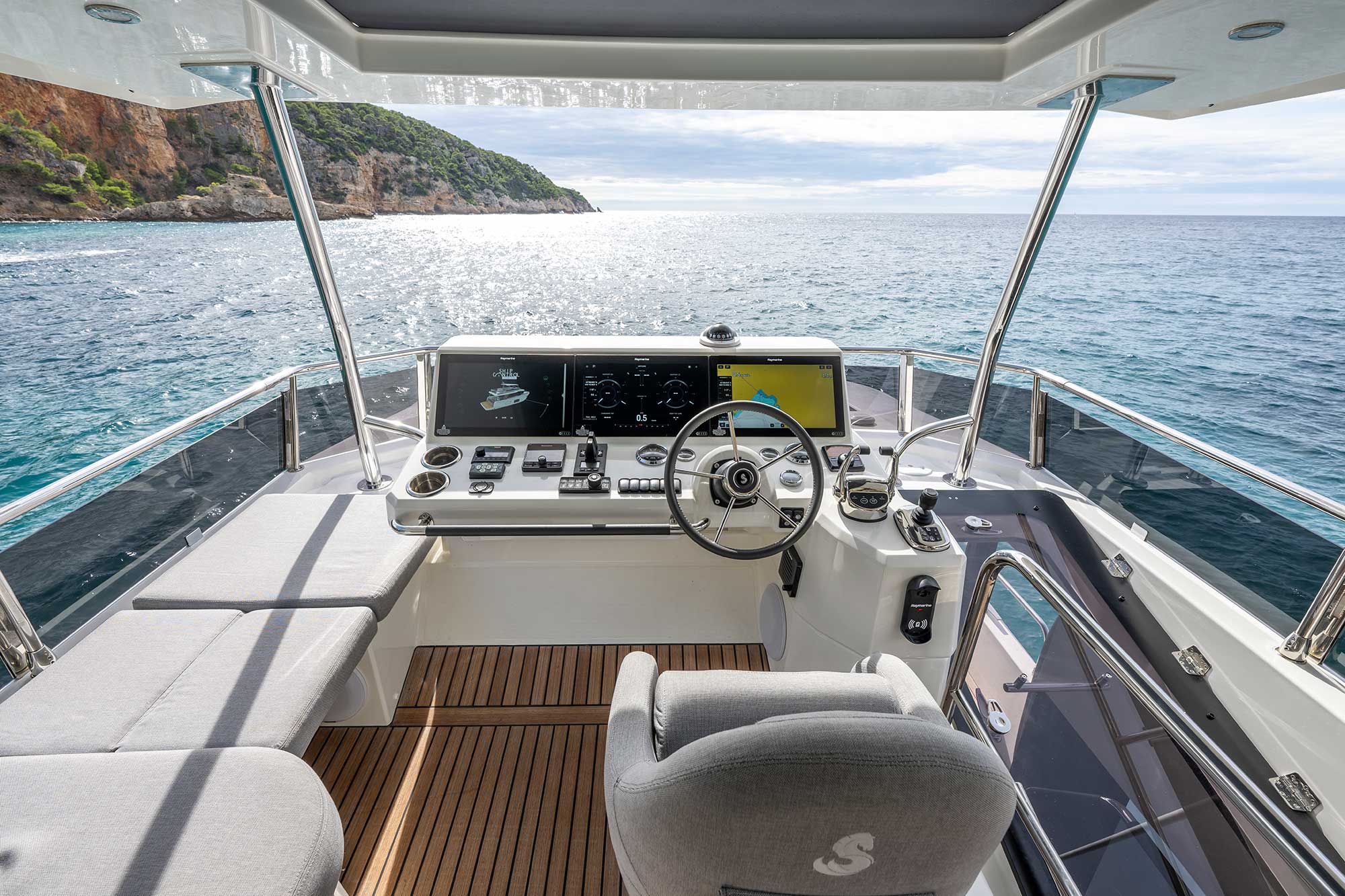 The gentle “S” sheerline line that rises towards the bow gives the hull a purposeful, timeless stance. The clean low profile flybridge above the continuous glass superstructure gives an overall lightness while retaining all the strength needed for a true passagemaker.