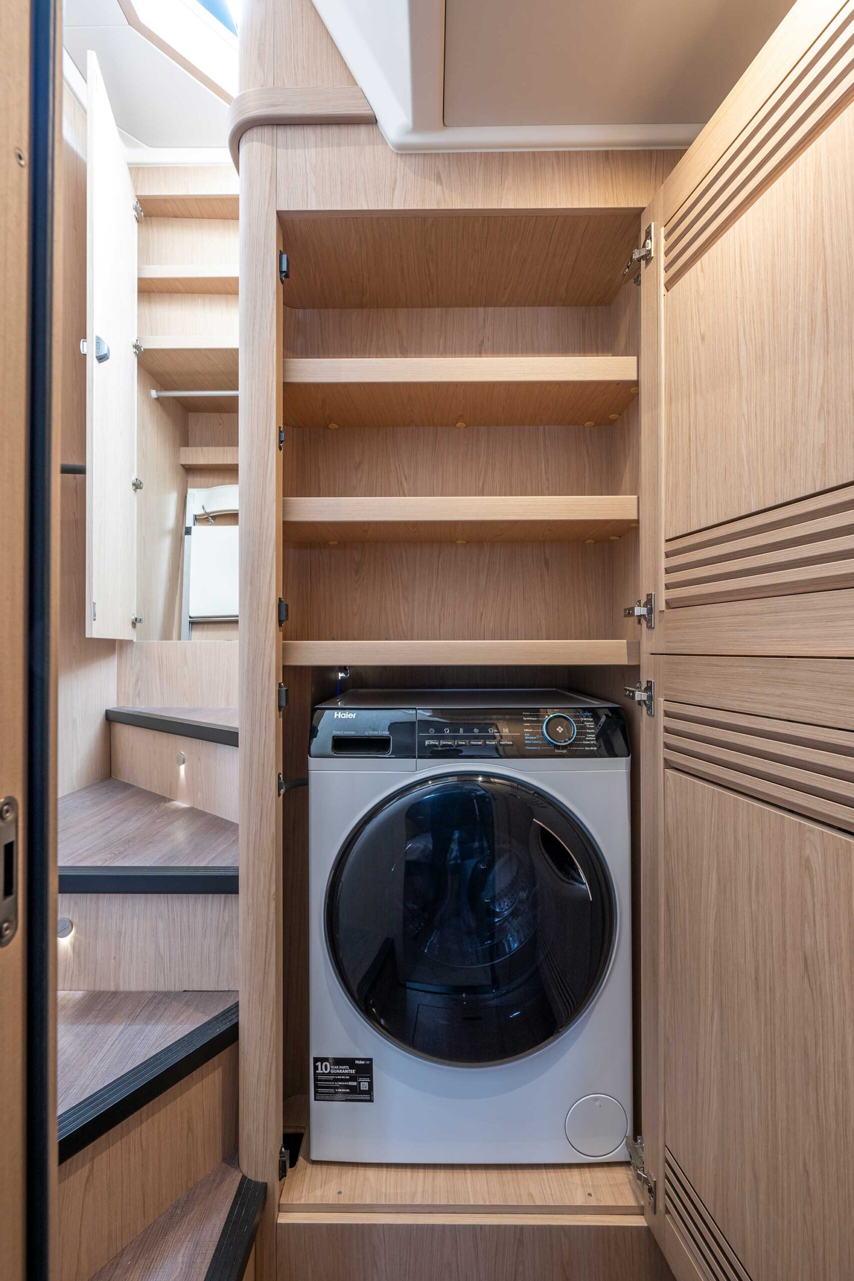 The visually stunning interior environment boasts a well-appointed galley with a raised passagemaker dinette, a large saloon and an attractive “architectural” flybridge stair. Built with six berths, with the option for an additional single crew berth, the layout is perfect for long family cruises. The separate shower cubicles feature Corian flooring with the addition of a rain shower in the ensuite of the full beam aft owner cabin.
