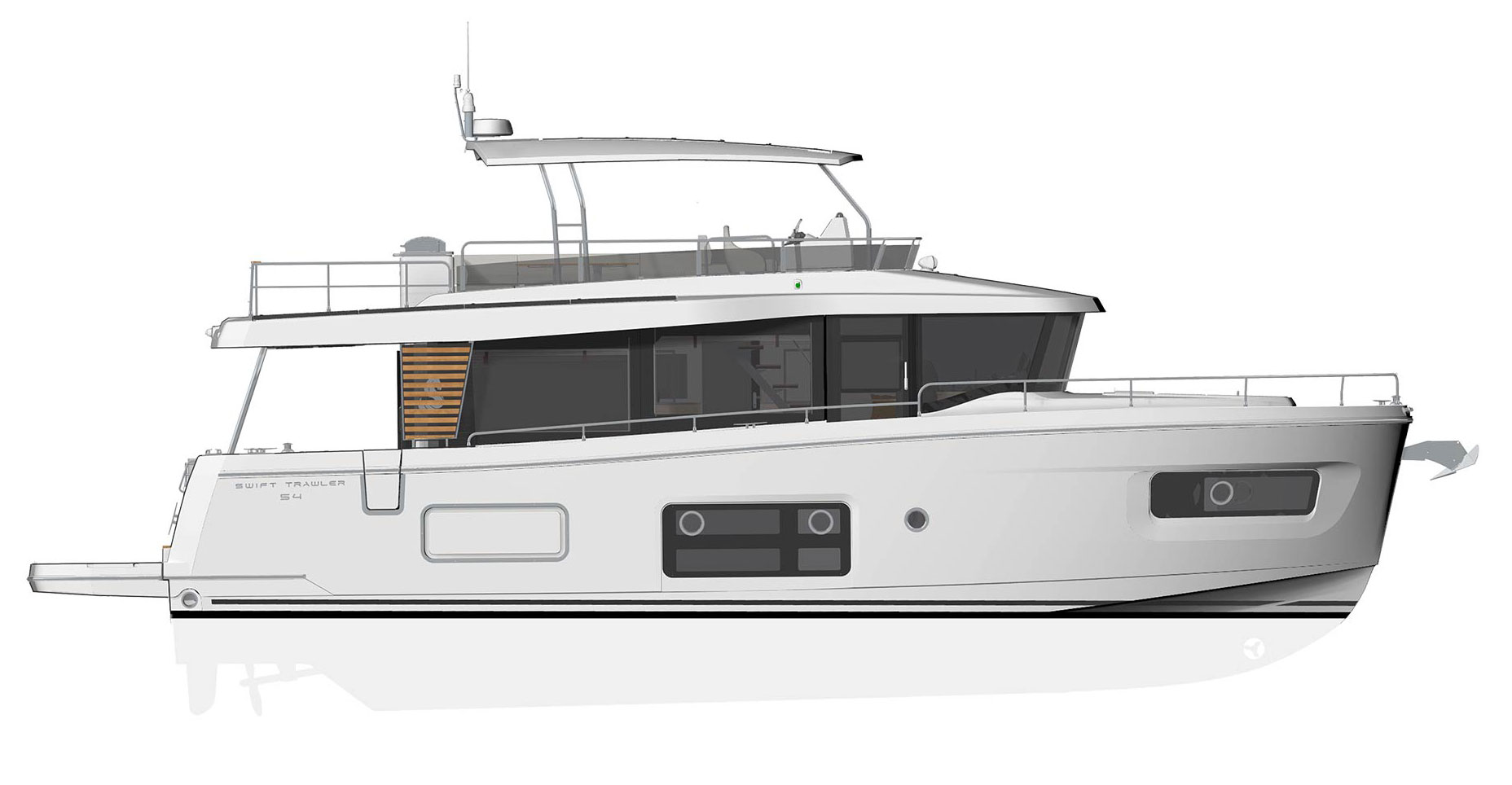 With unrivalled outdoor living space, the Swift Trawler 54 breaks the mould in passagemaking. This perfect family home on the water offers boaters the opportunity to enjoy efficient long-range cruising in an elegant and cosy atmosphere amidst ultimate comfort.
