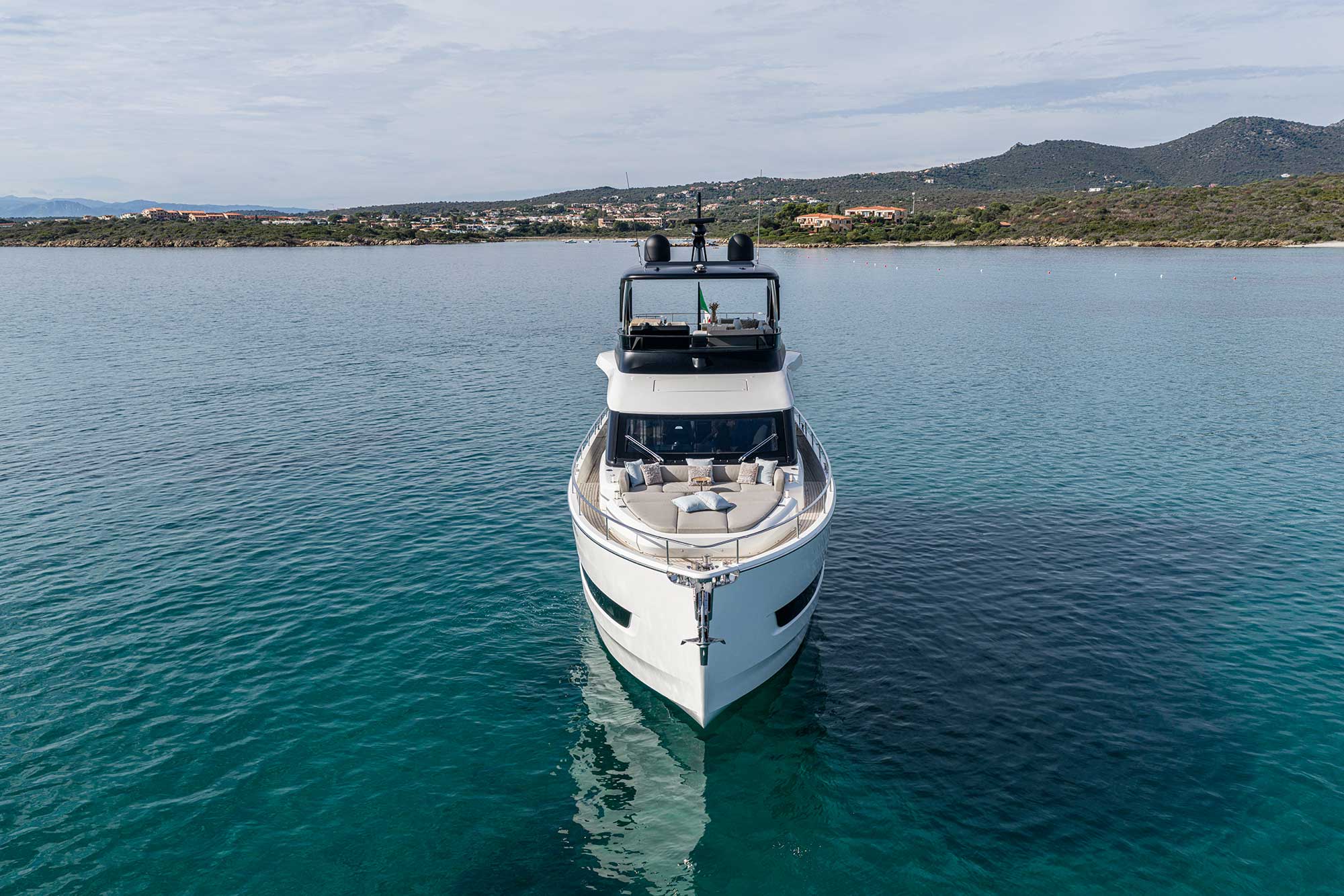Impossible to look away from right from the very first glance: the design element which first affirms the character of the Sessantadue 62 is its vertical bow. A line which connects the sea and sky, and which accentuates the naval allure of the yacht. The waterline is lengthened, with the vessel benefiting in terms of audacity and muscularity, but without suffering in terms of harmony of forms, which is a distinctive element of Cranchi Yachts’ new flybridge models.