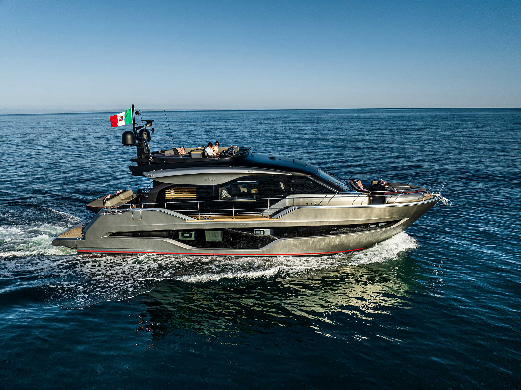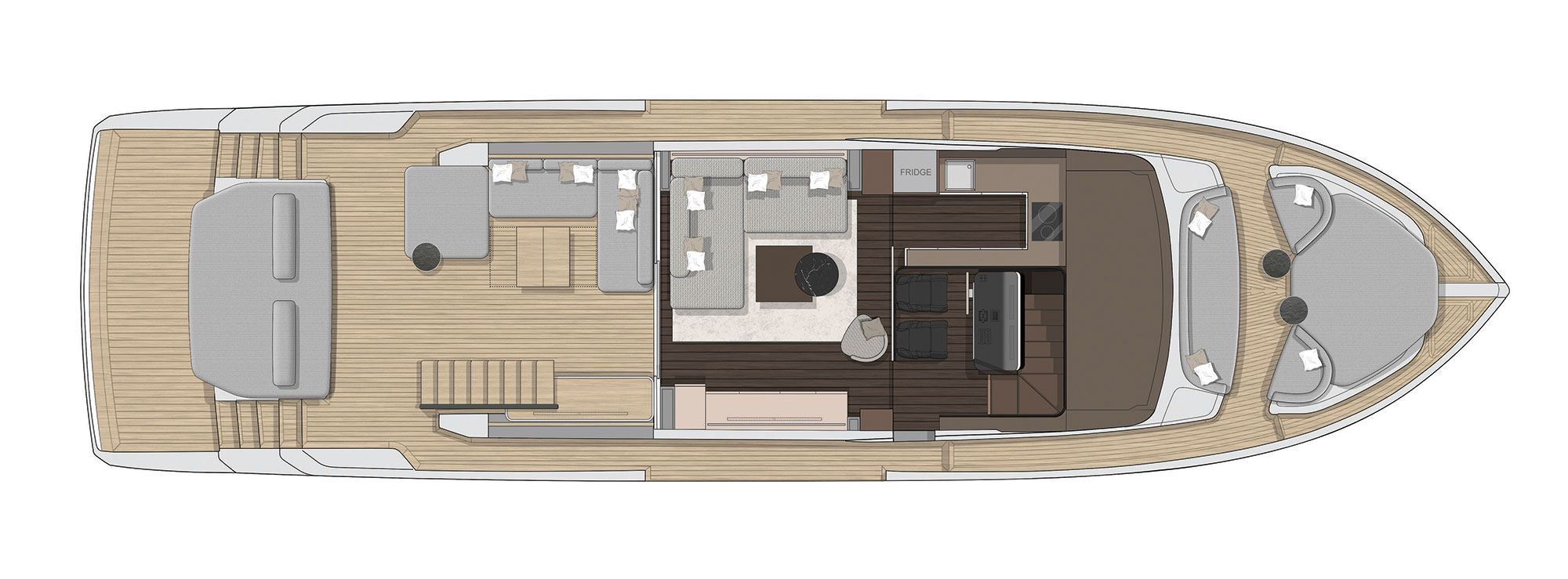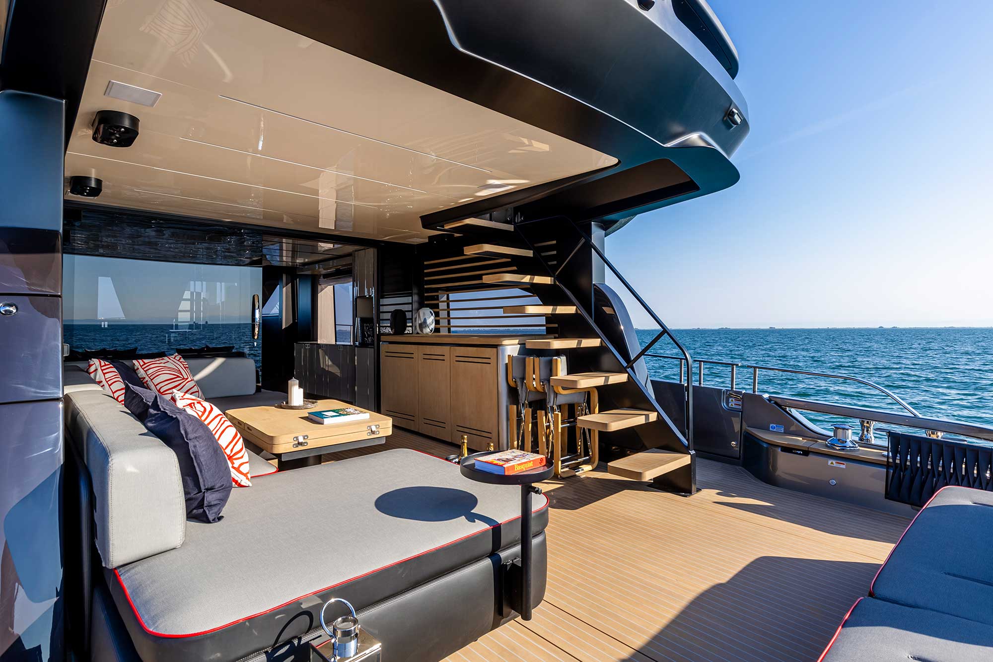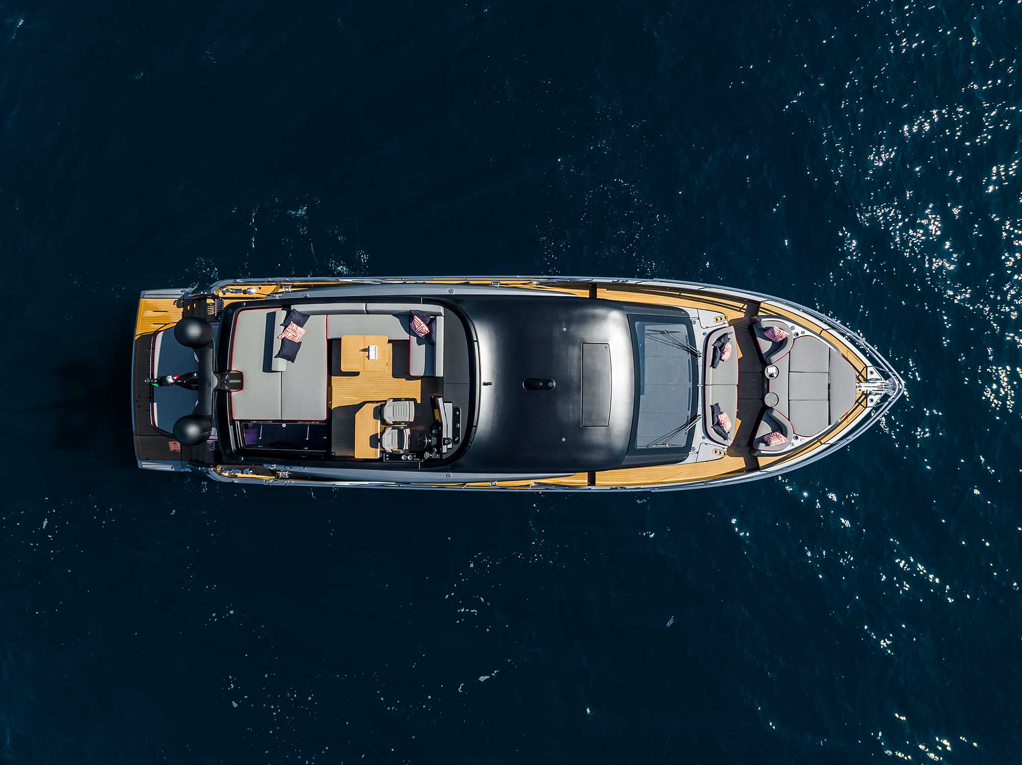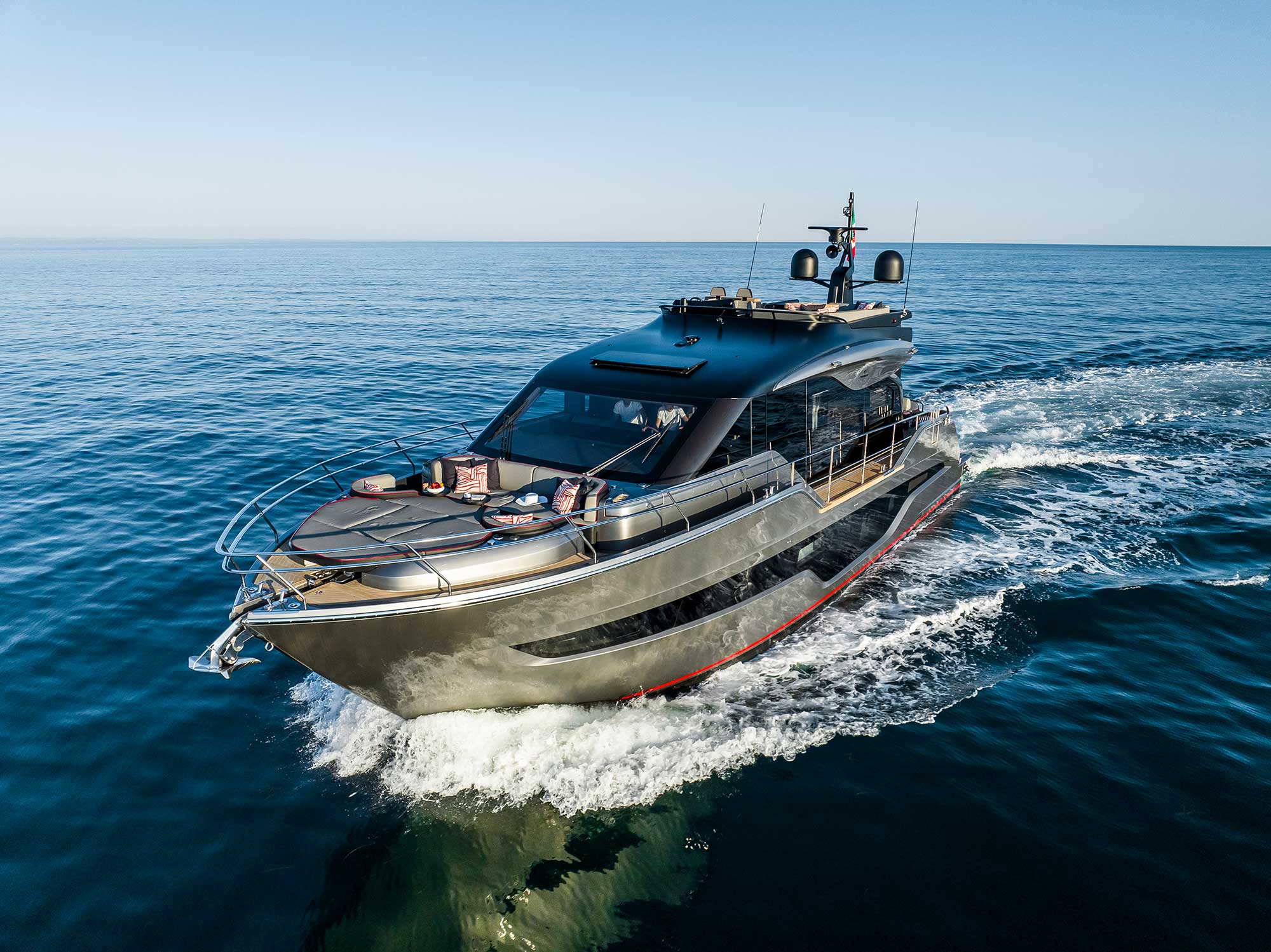 The new Sessantasette 67 Corsa clearly derives from the Sessantasette 67. It retains the innate elegance and functional division of spaces belowdecks. Entirely original, on the other hand, is the superstructure of the new yacht: the third deck indeed takes on the typical sportbridge layout, with an elegant mini-fly without t-top. This creates sleeker lines, giving the yacht a sporty character. The pulpit which juts out further compared to the flybridge model and the red colour accents which set the new model apart help reinforce this sensation.
