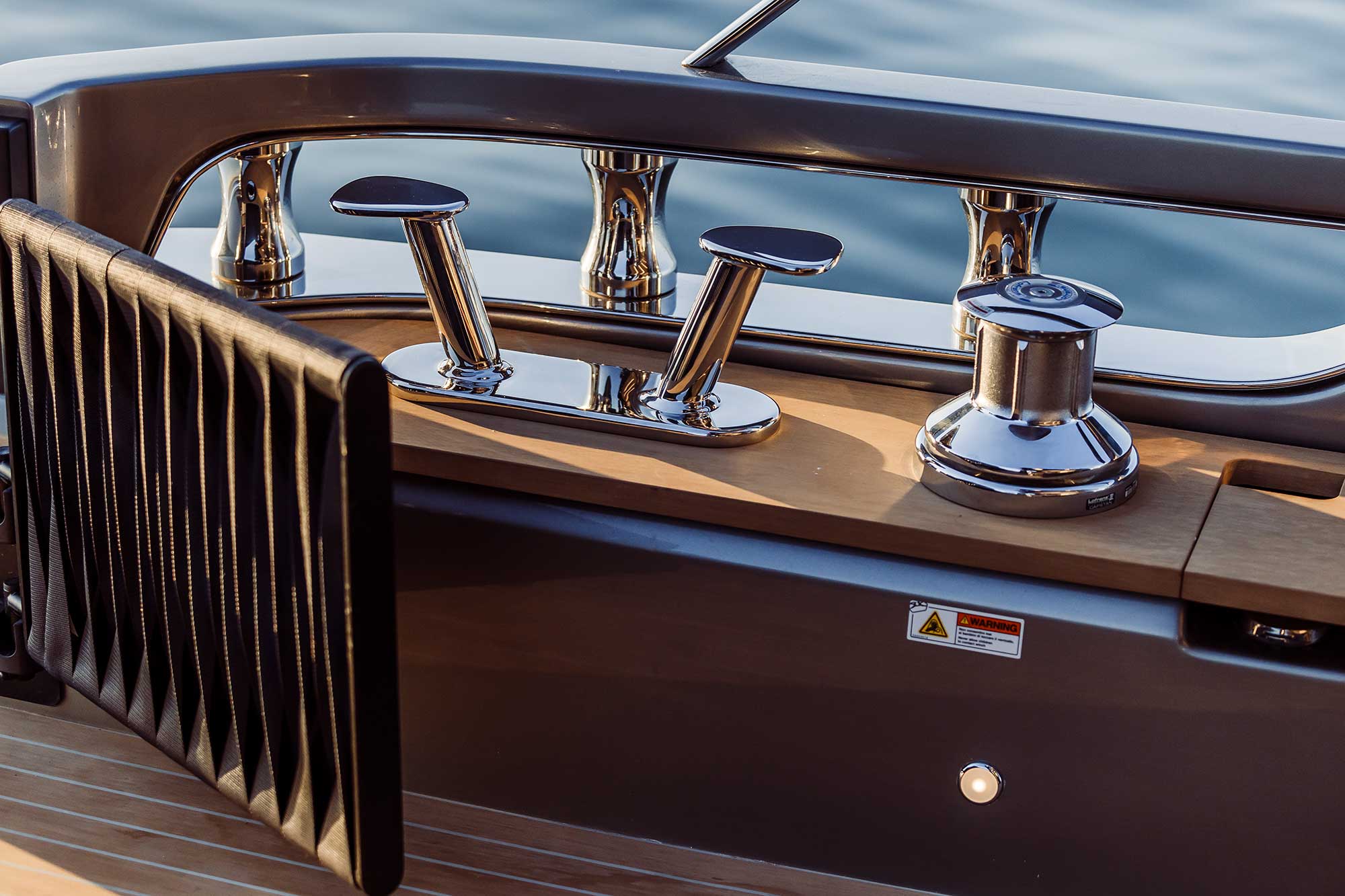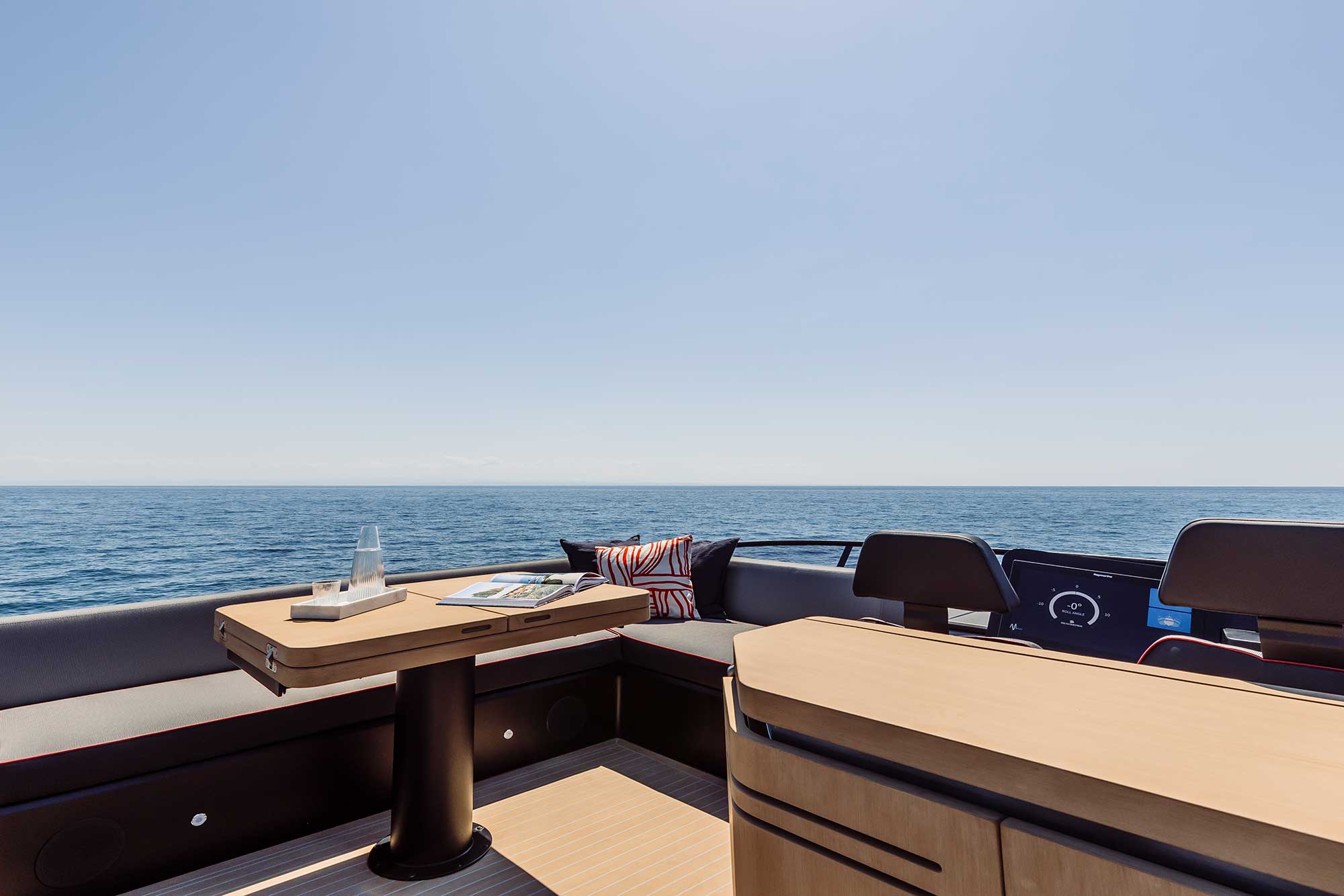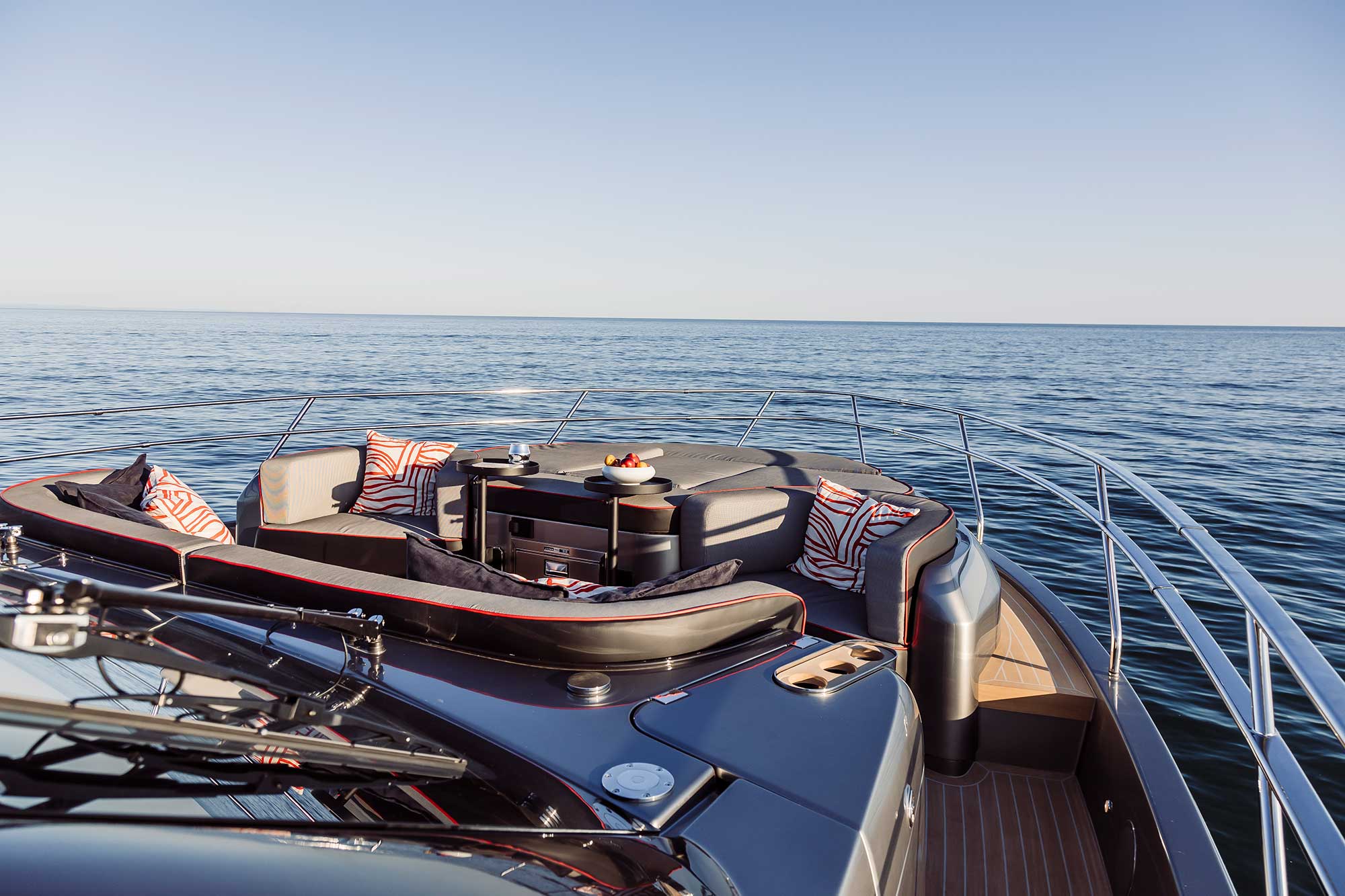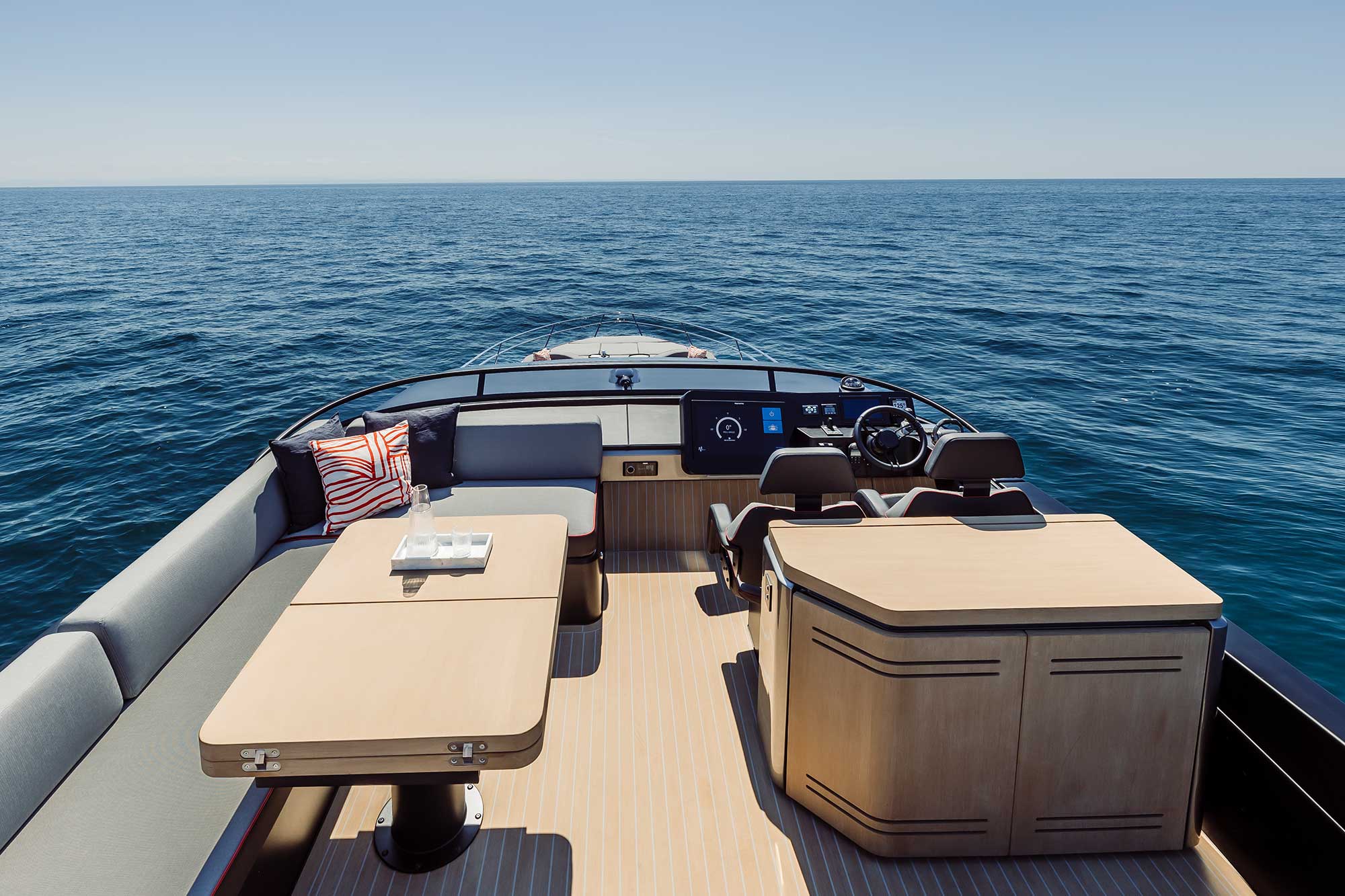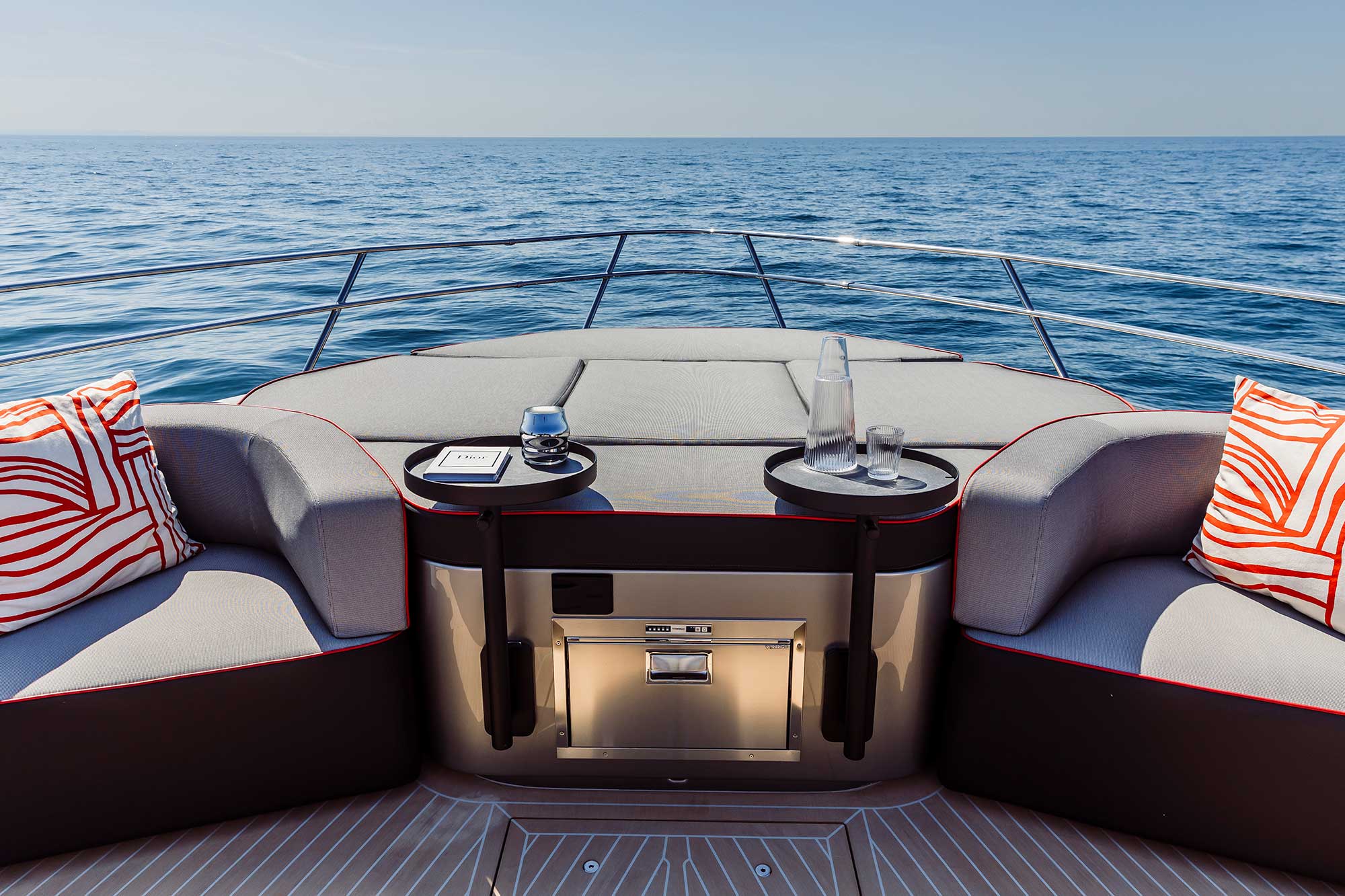 The stripe which marks out and embellishing the limit between the parts of the hull above and below the waterline is red. Red is also the colour of the subtle beading which highlights the contrasting interplay between the vertical and horizontal surfaces of the seats, the former in black leather and the latter upholstered in lighter fabrics. Also red is the word which stands out in the boat’s logo: Corsa.