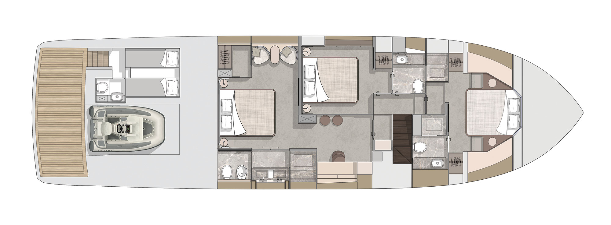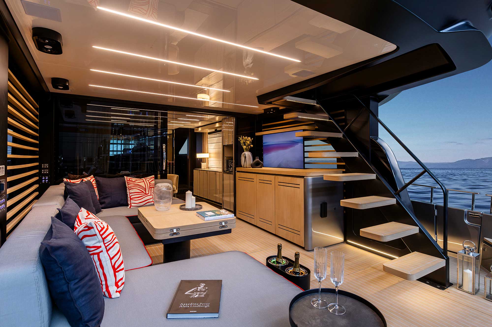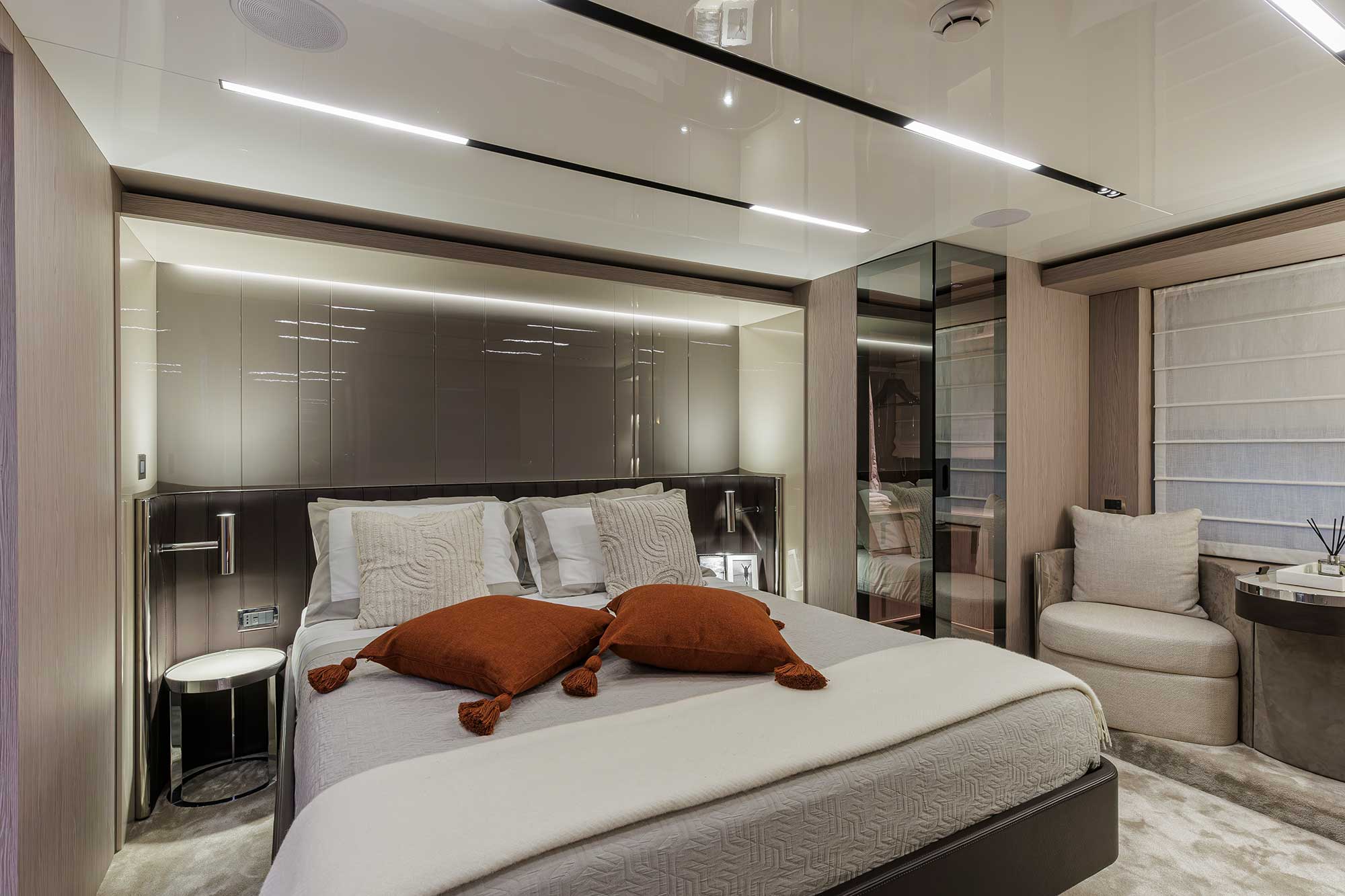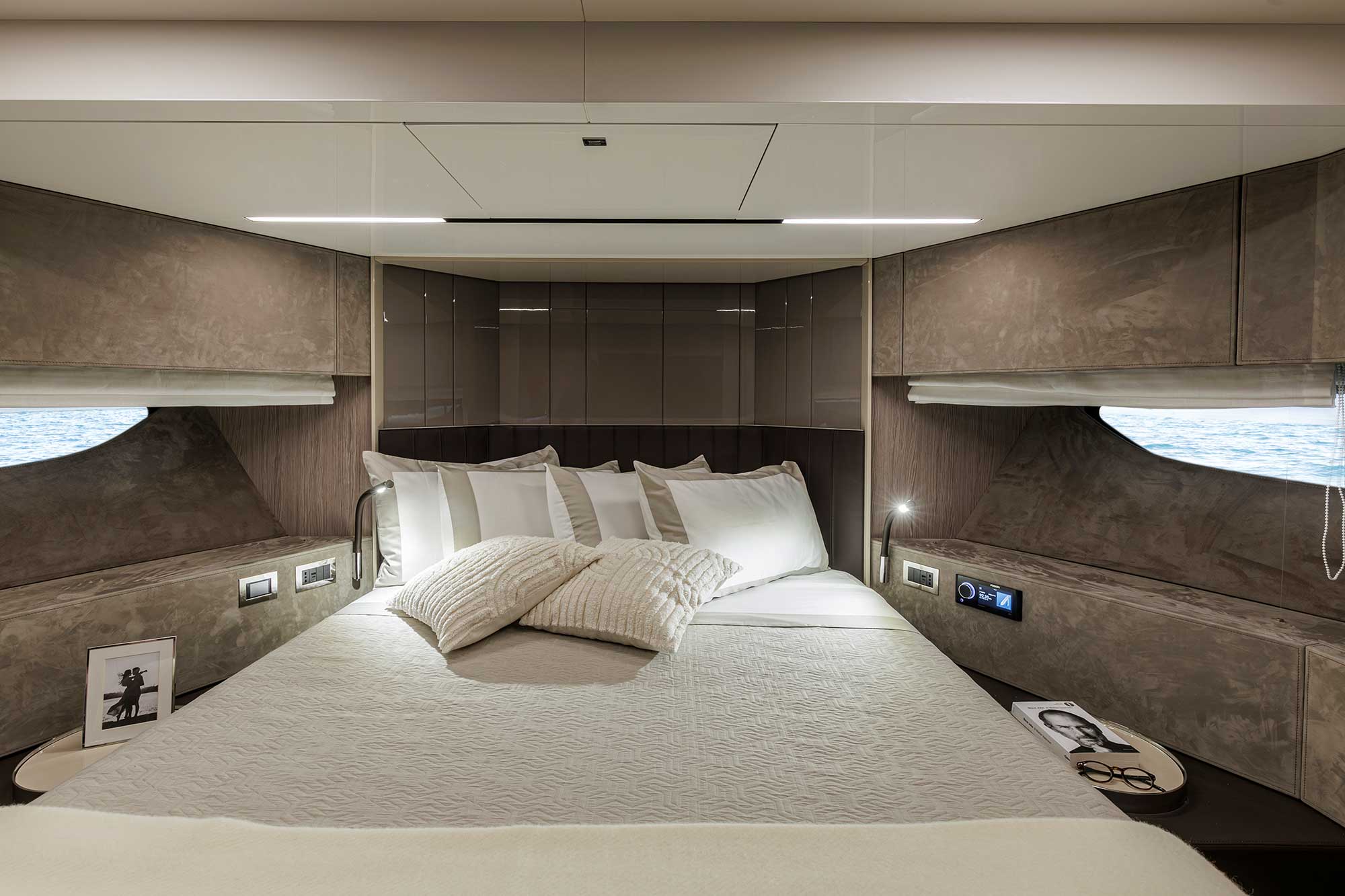Thanks to the Cranchi Atelier program, there are also a huge number of customisation options for the Sessantasette 67 Corsa, starting from the décor choices developed by Christian Grande: combining metals, stones, woods and fabrics to best bring out and enhance the yacht’s environments and create authentically unique spaces.