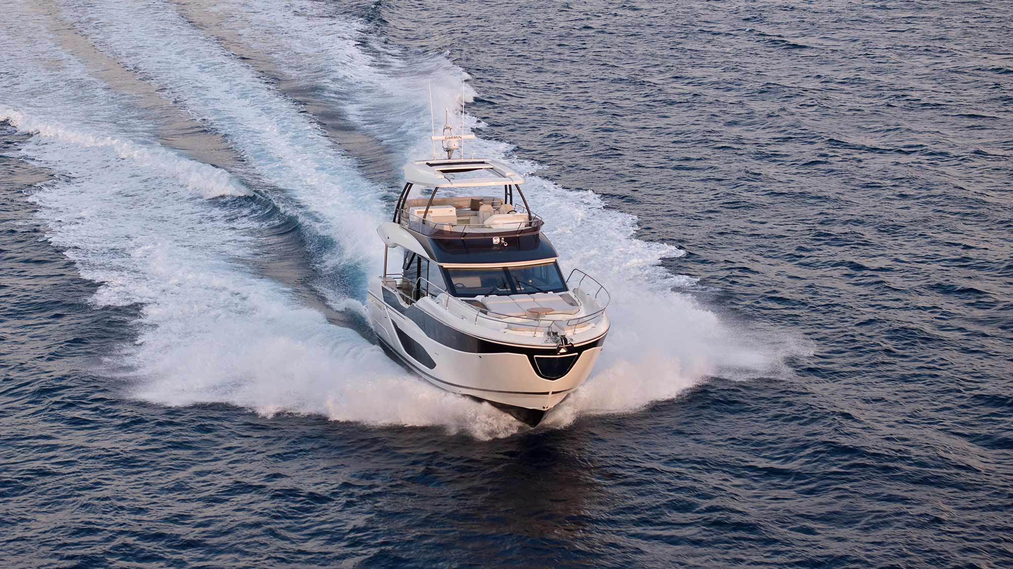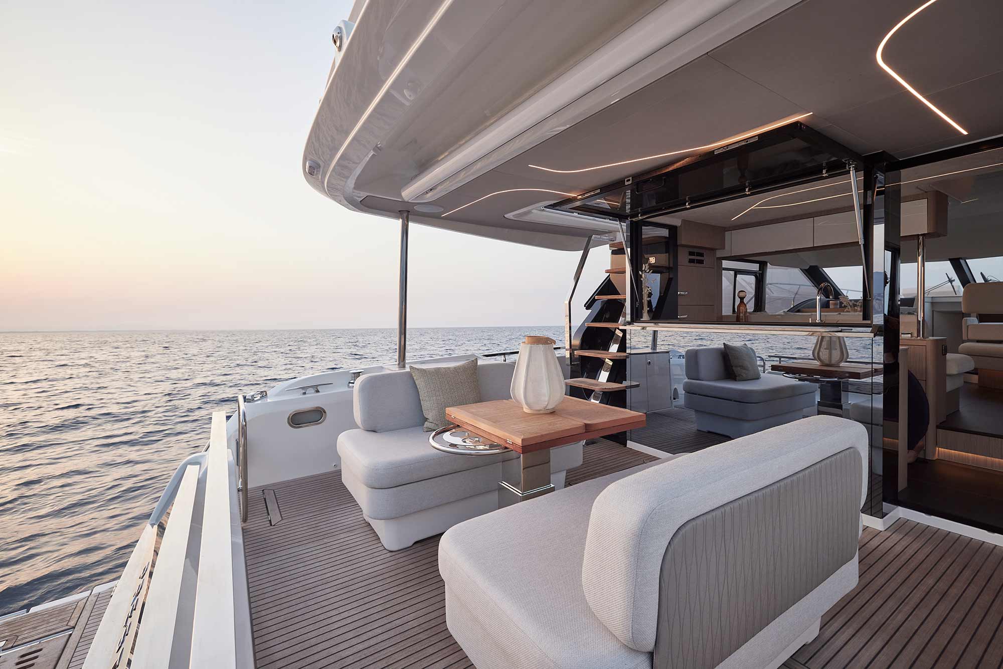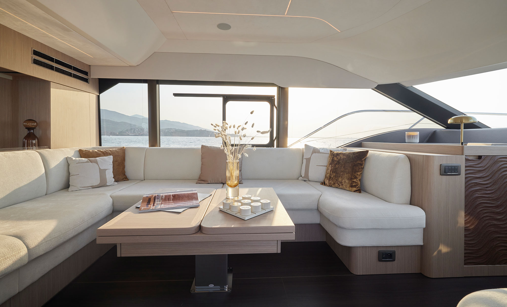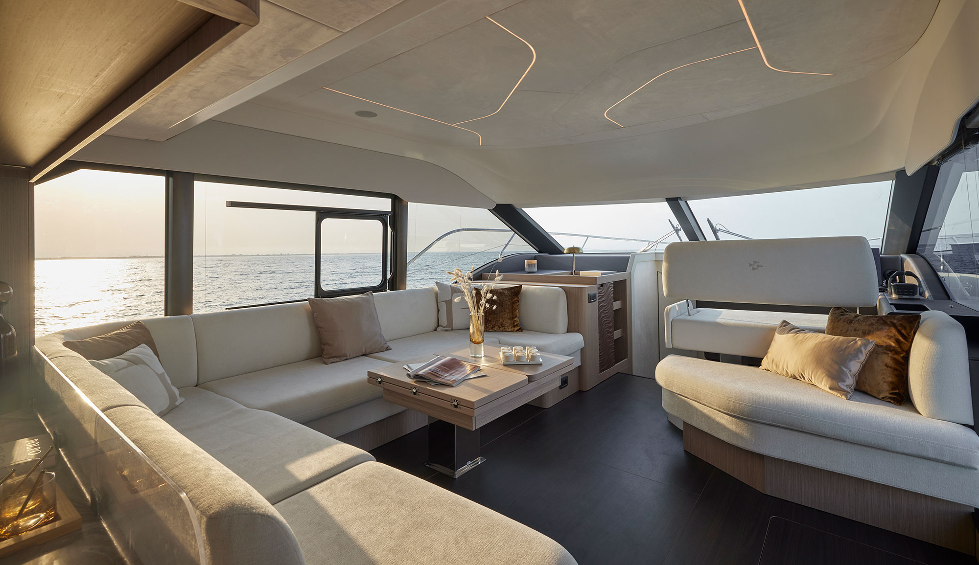 The F5.7 cuts through the waves with ease, while the convex form of her new V-shaped hull, designed by Michael Peters, augments the interior space.