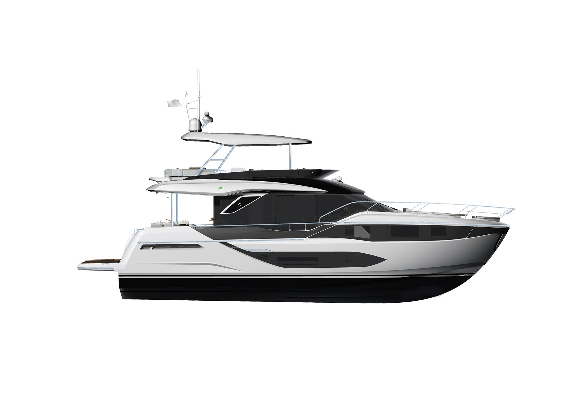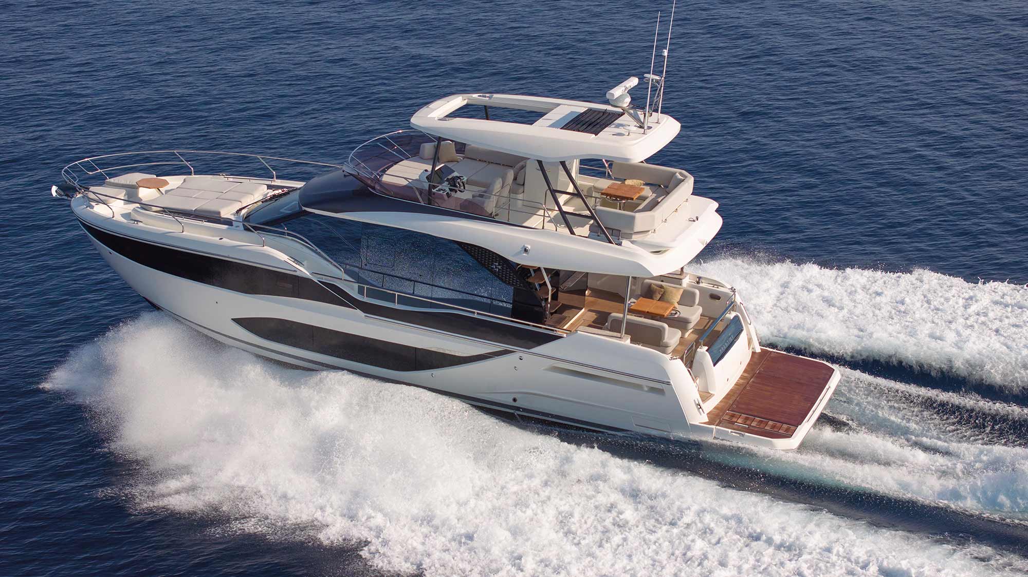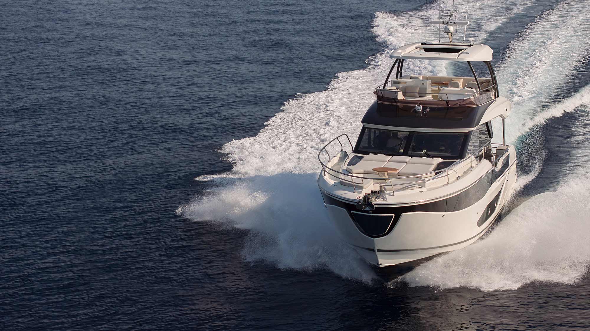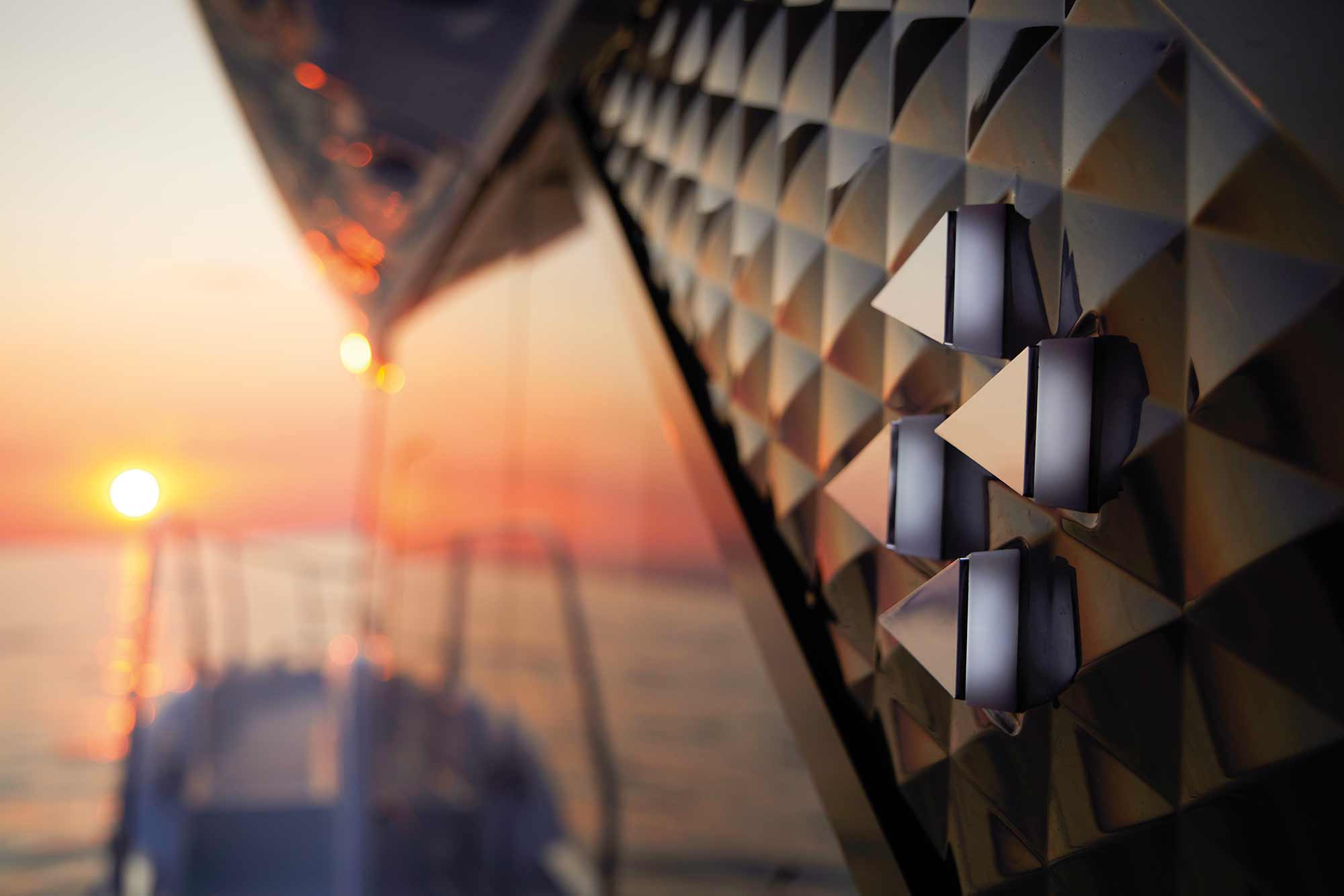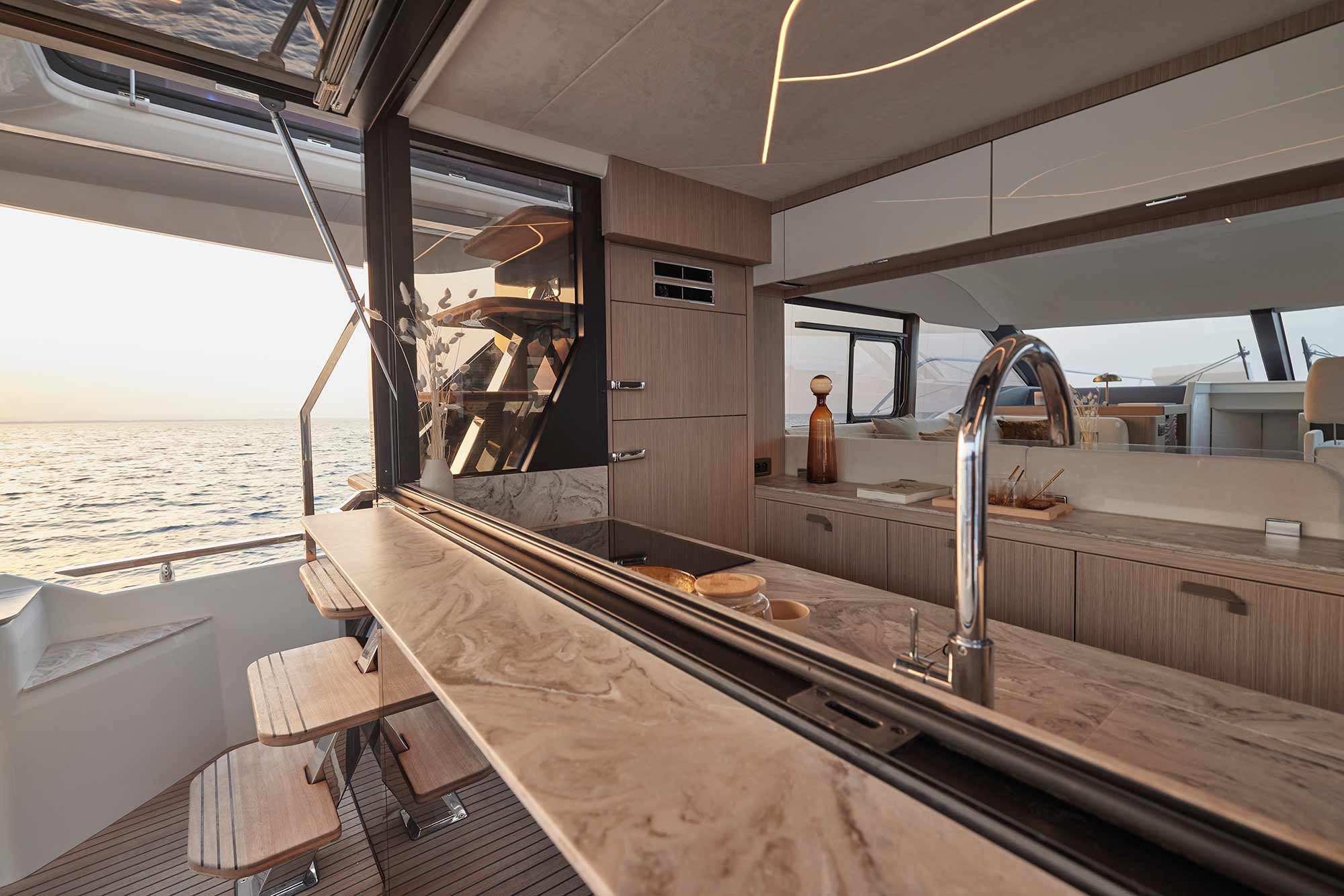 The F5.7 cuts through the waves with ease, while the convex form of her new V-shaped hull, designed by Michael Peters, augments the interior space.