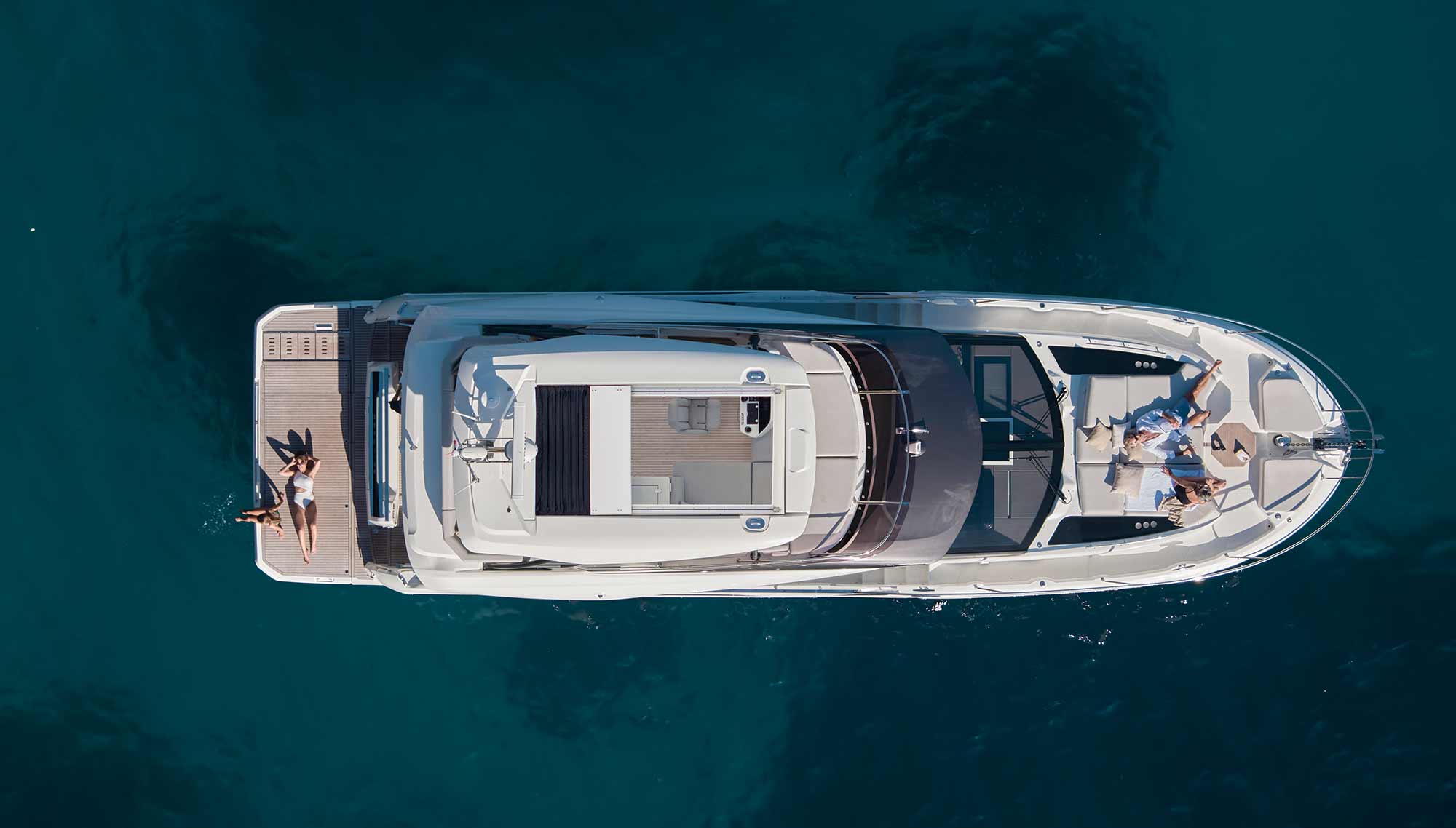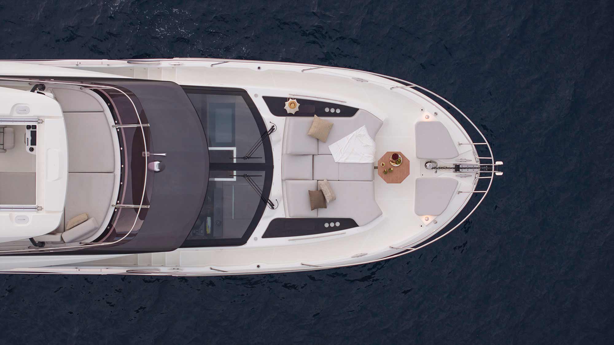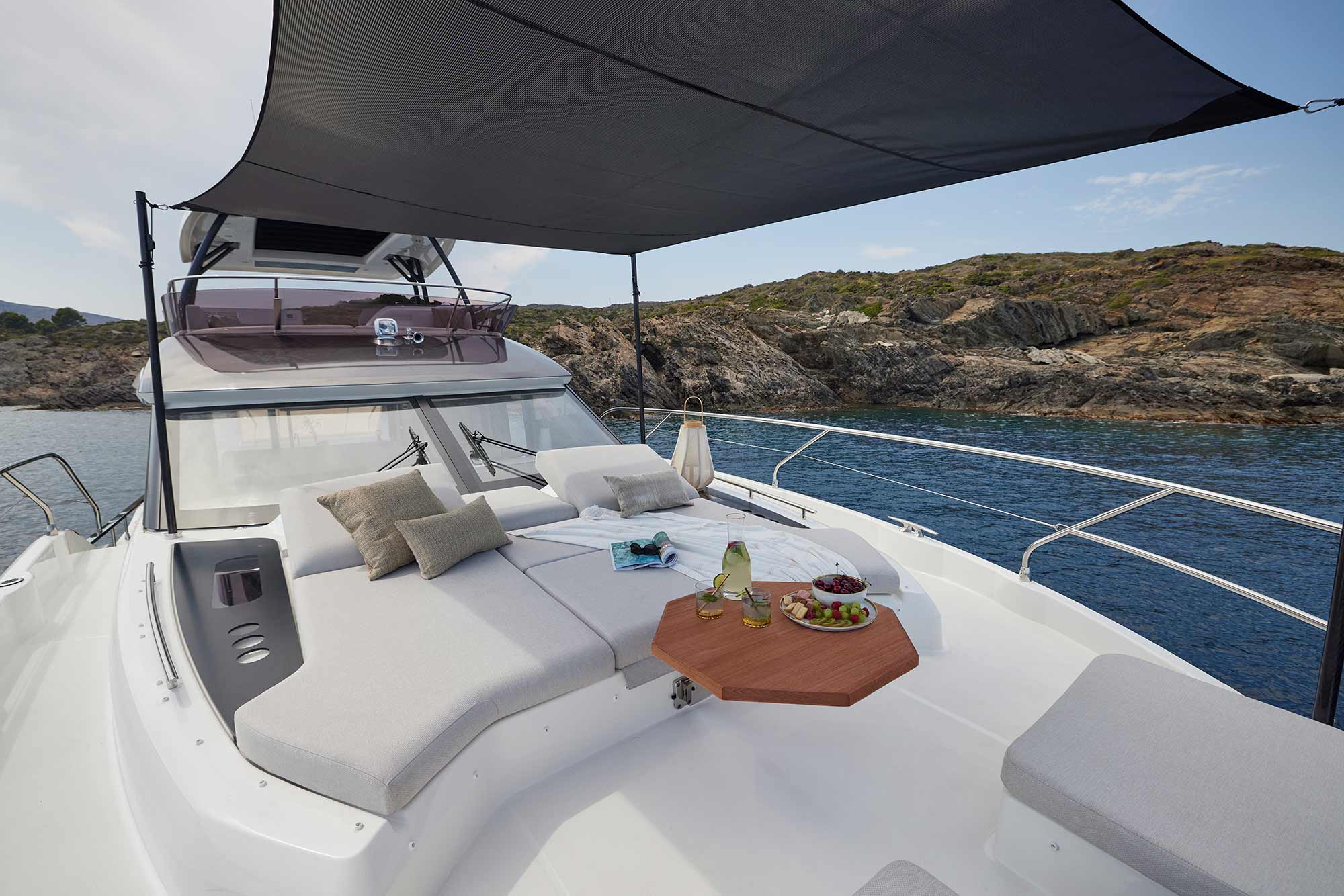 More comfortable and more enjoyable, the forward deck features both a vast sun pad and semi-circular bench seating arranged around a table – a true lounge in the middle of the ocean.