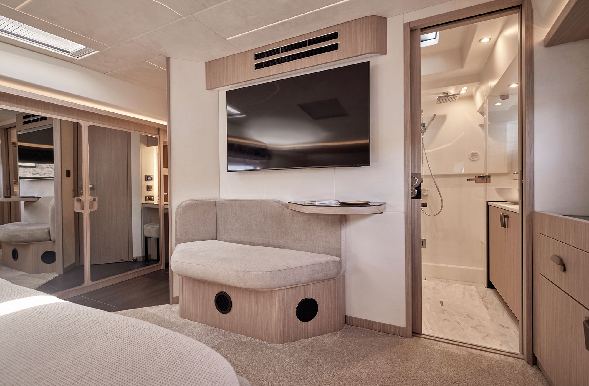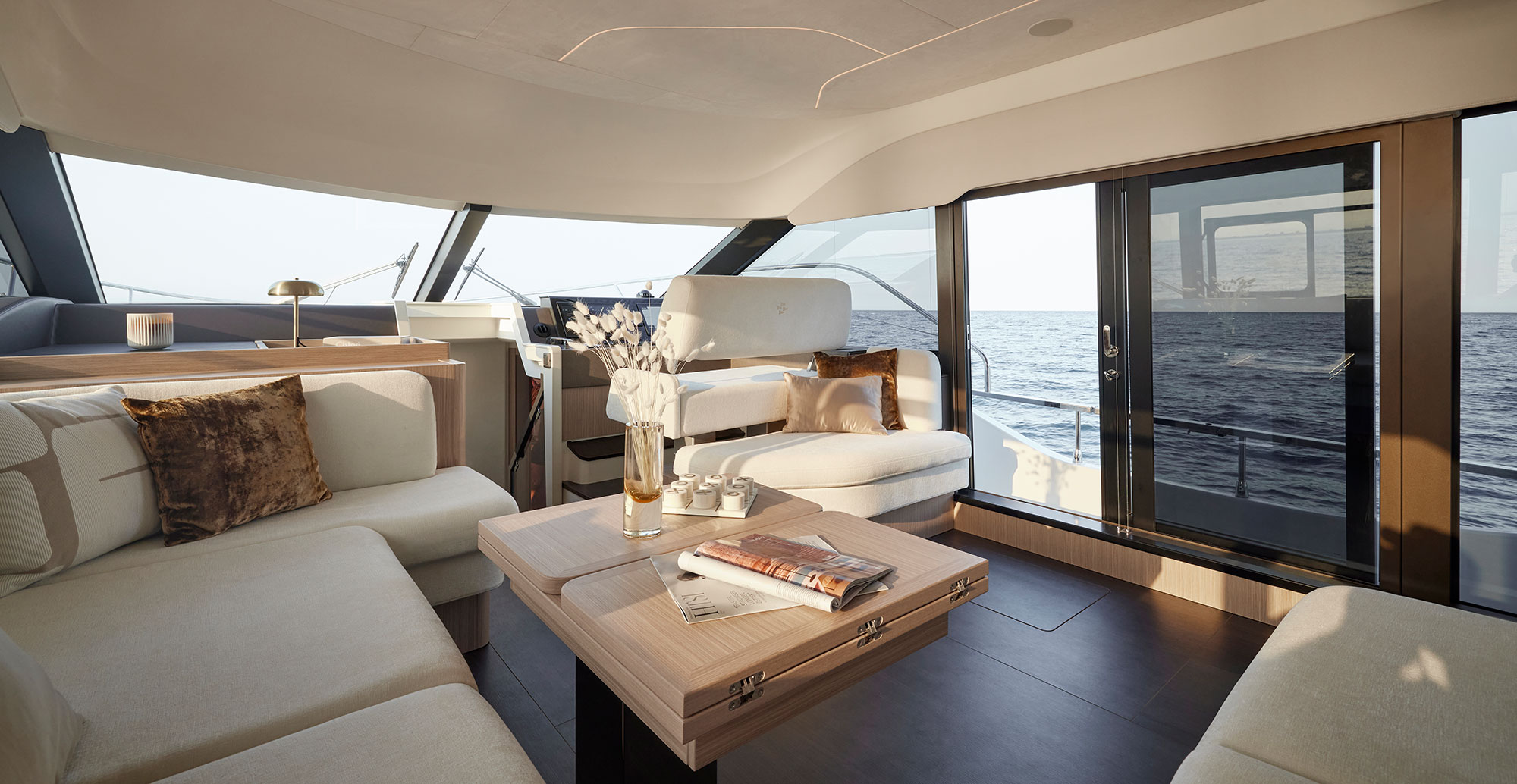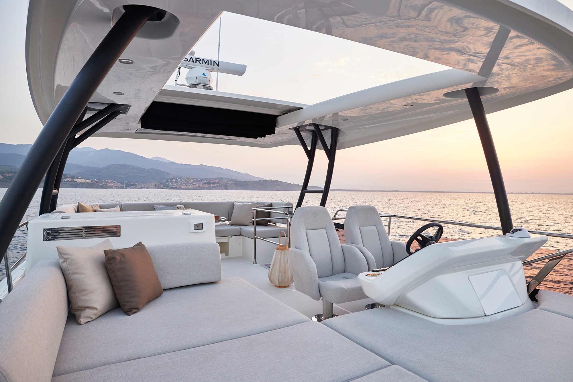 Notably: more volume, additional storage in the cockpit, a very functional galley, immense sofas, cabins equipped with en suite bathrooms… each living space aboard the F5.7 offers more light, greater ease of movement and well-being.