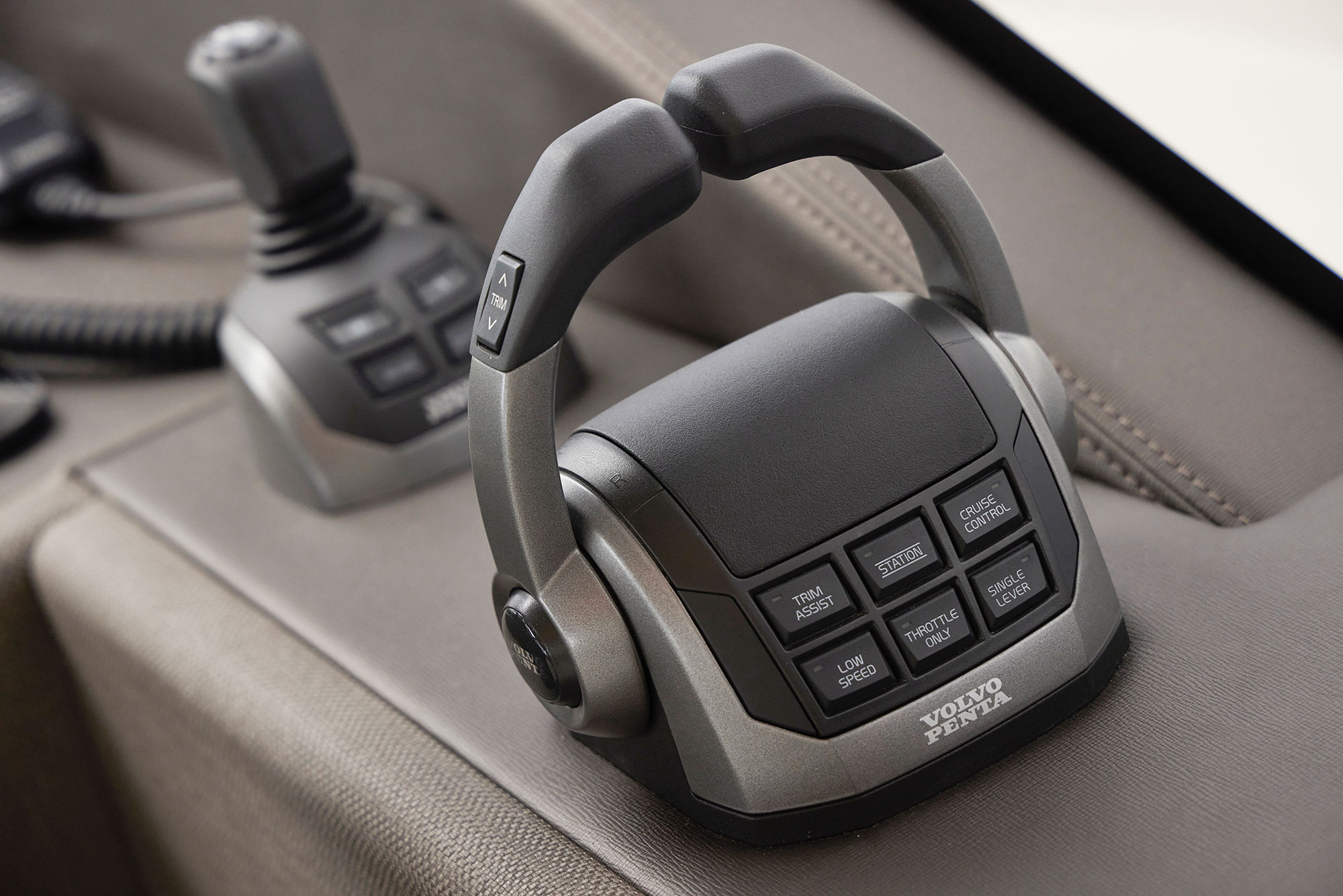 The Volvo IPS system with joystick, assisted by Garmin Surround View cameras, transforms docking maneuvers into child’s play.