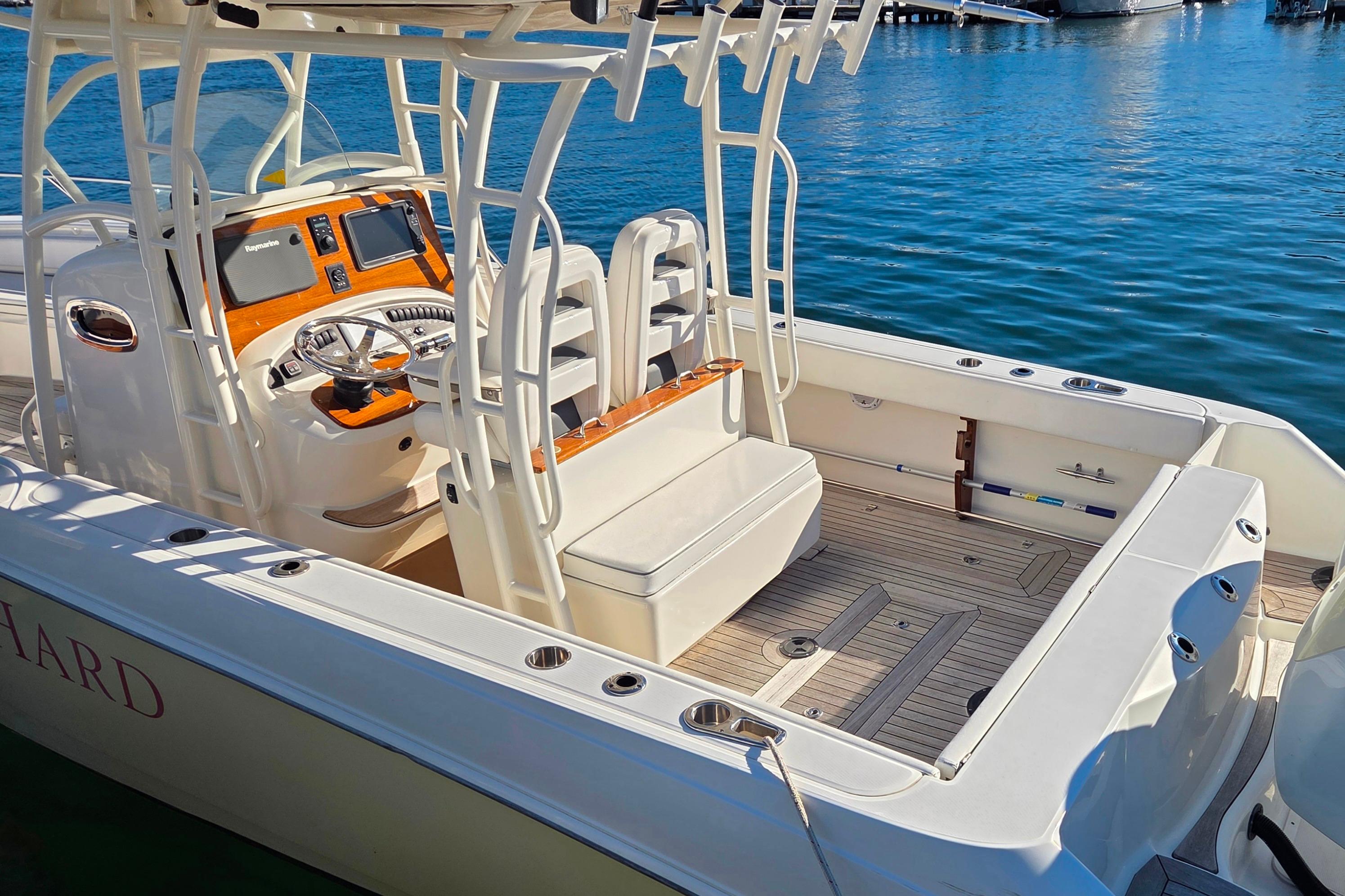 This is a highly Customized and Meticulouly Maintained 32' Boston Whaler Commercial Hull Design, painted Yellow Hull Color, Mercury 300 HP with Only 195 original Hours, Teak Decking, Forward retractable Table, Custom Leaning Post with Mezzanine Aft Facing Seating, Varnished Teak Helm Dash, Teak Hatch Covers, Powdercoated T-Top Frame with Fiberglass Top, Forward Seating, Full Raymarine Electronics Package and Much more...