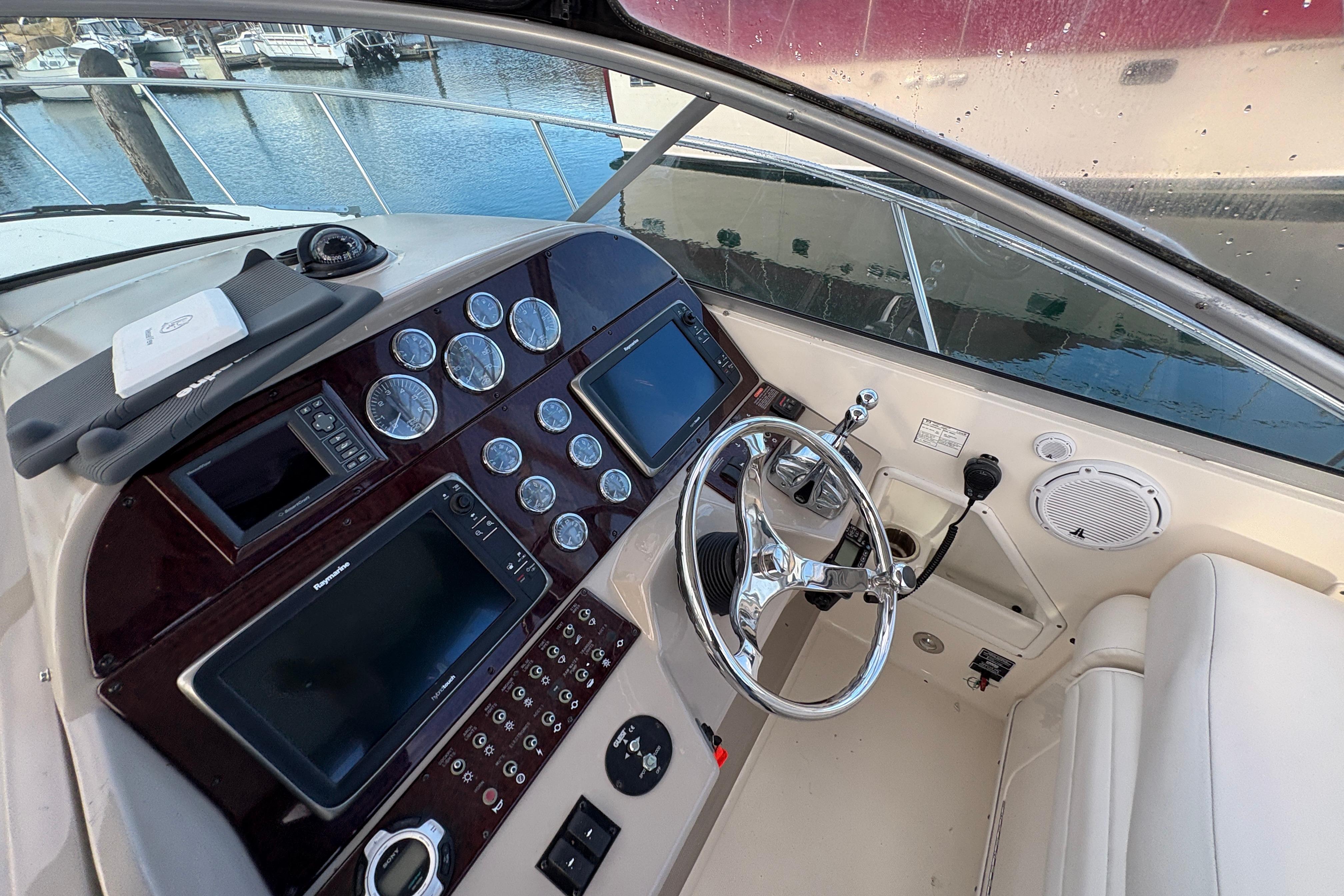 Well‑laid‑out helm under the hardtop offering excellent visibility and protection