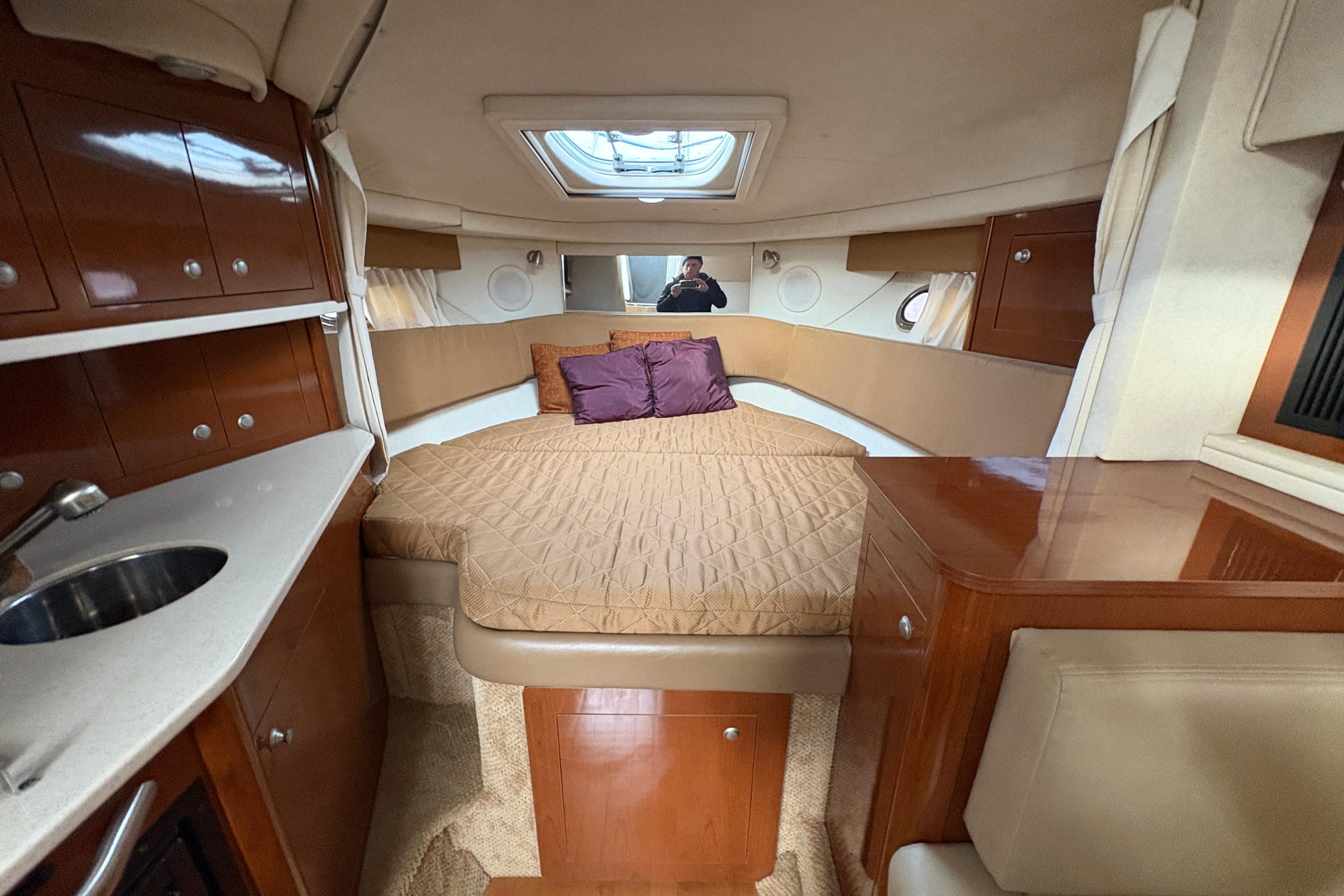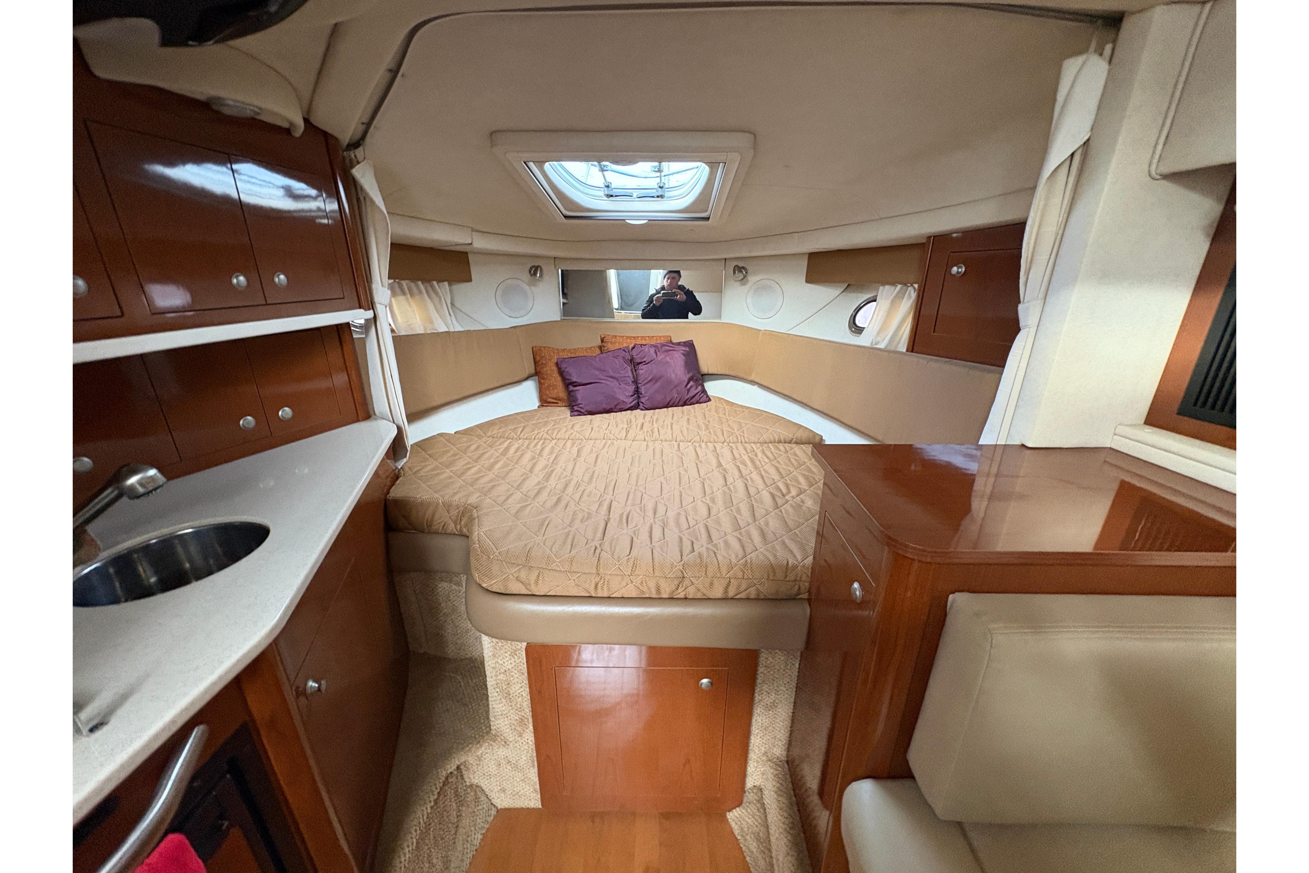 The cabin comfortably sleeps up to four adults, making it ideal for weekends aboard or extended day trips.