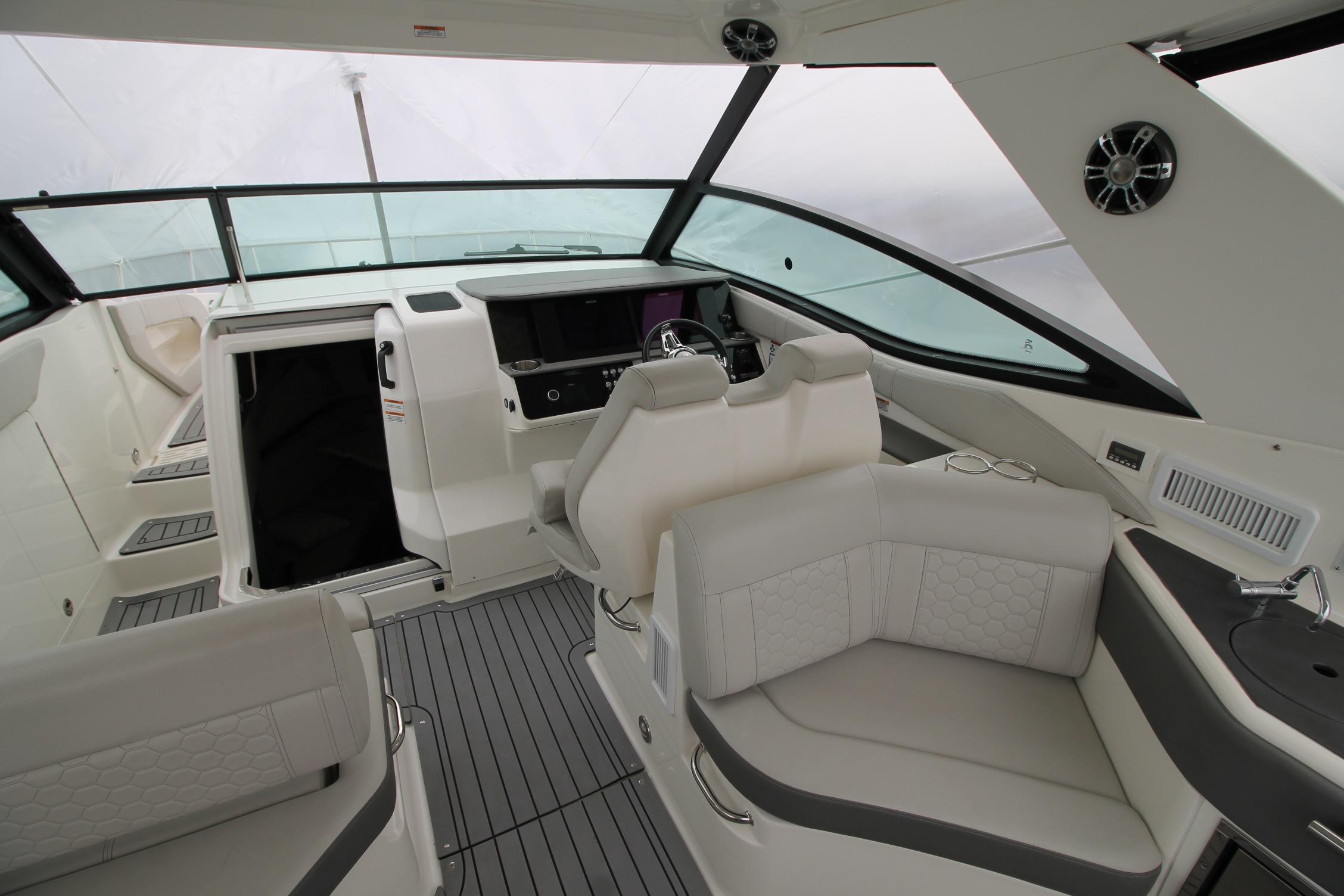 - Seating, Port Helm Bench with Convertible Backrest; Dual Helm Seat on Starboard with Flip-Up Thigh Rise