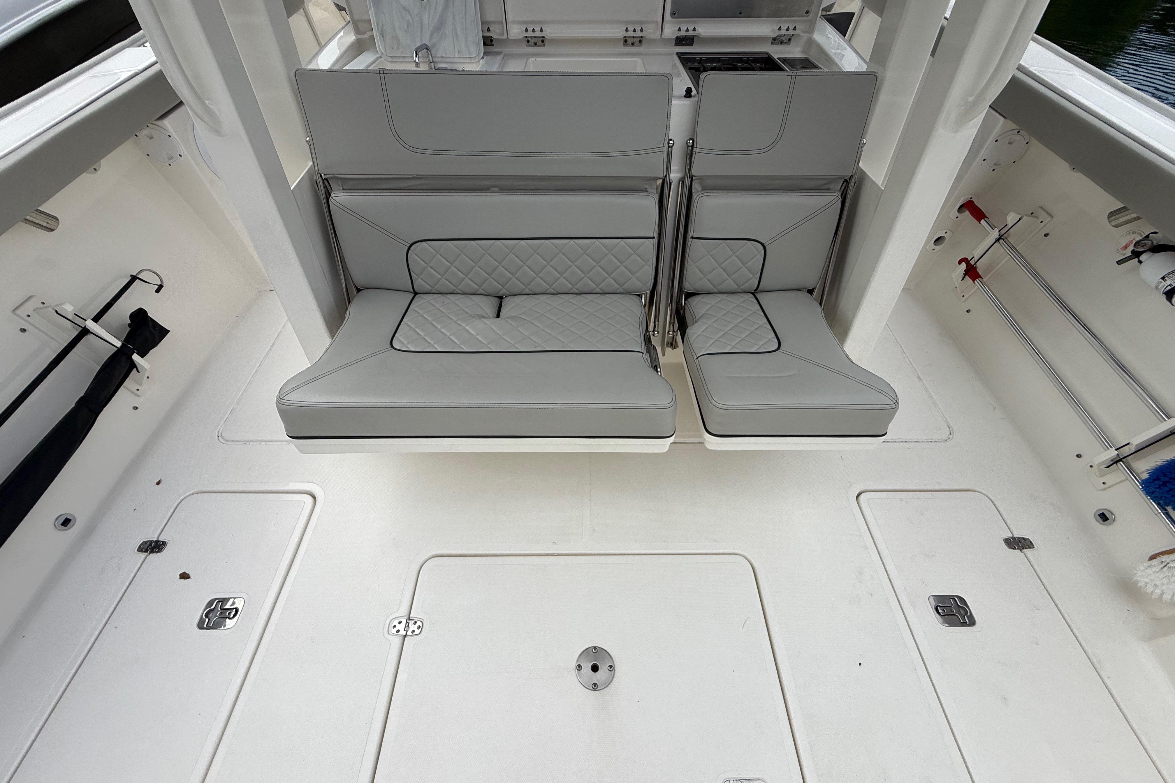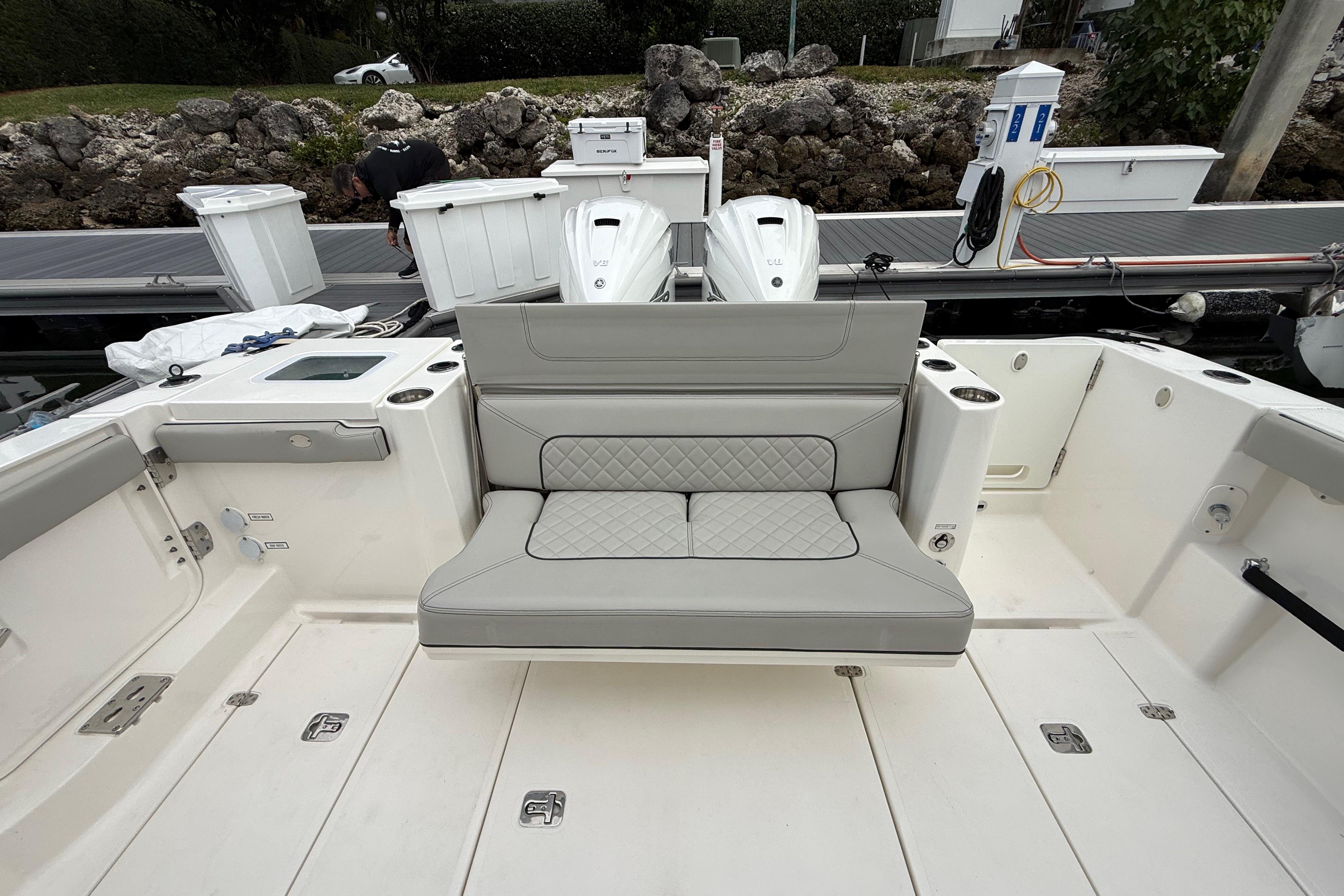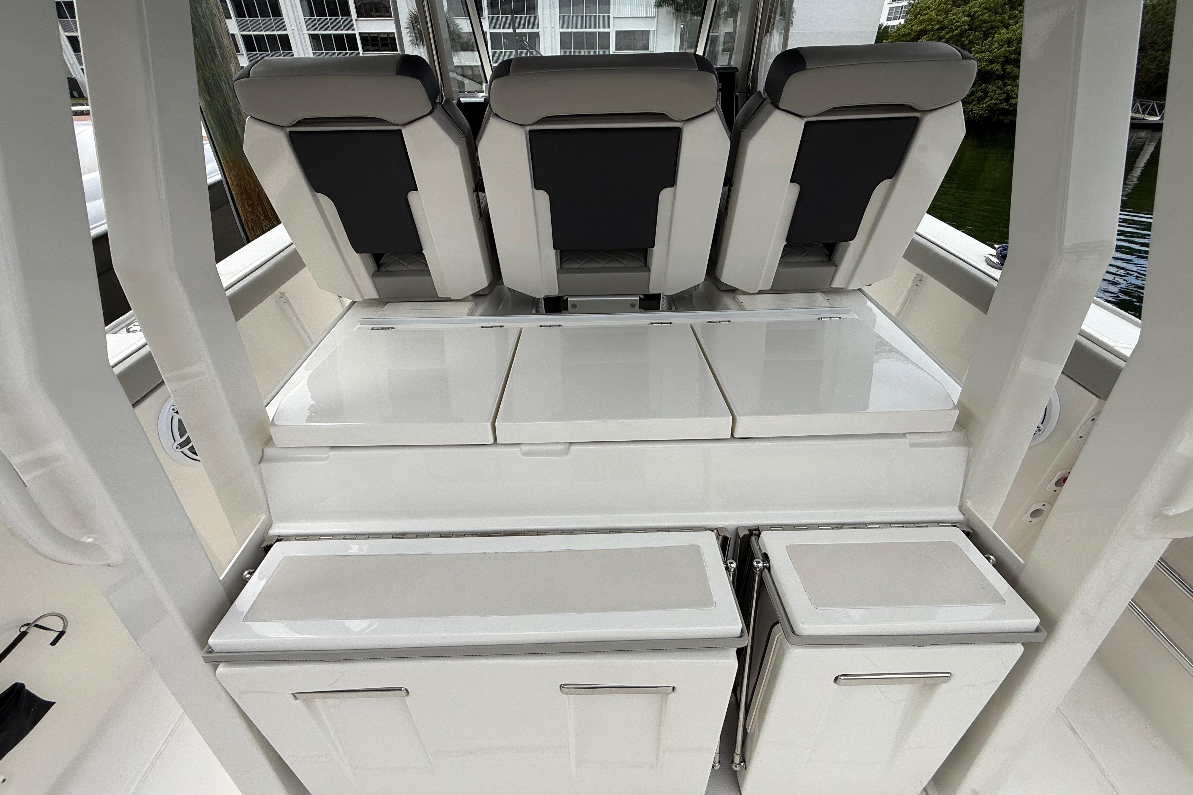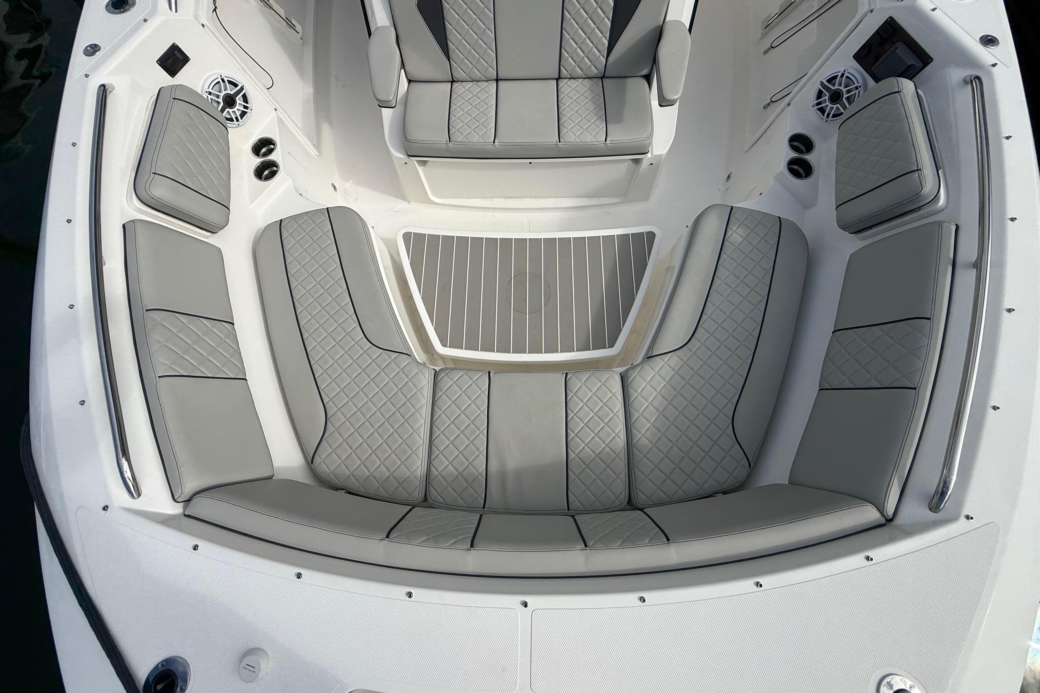 - Molded Forward Port & Starboard Bow Seating with Electrically Actuated Forward-Facing Backrests, 12V & USB Charger, and Insulated Storage Below