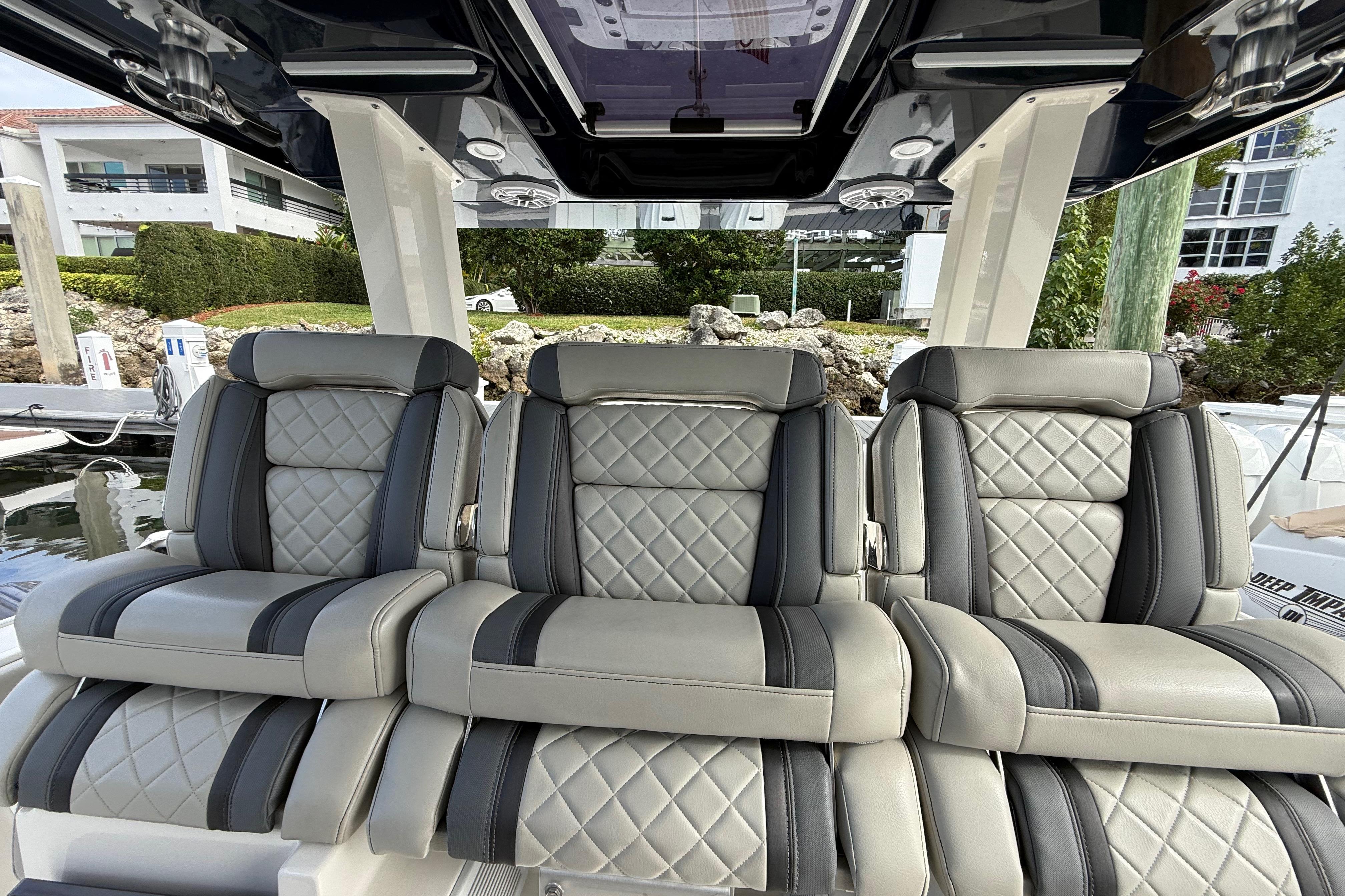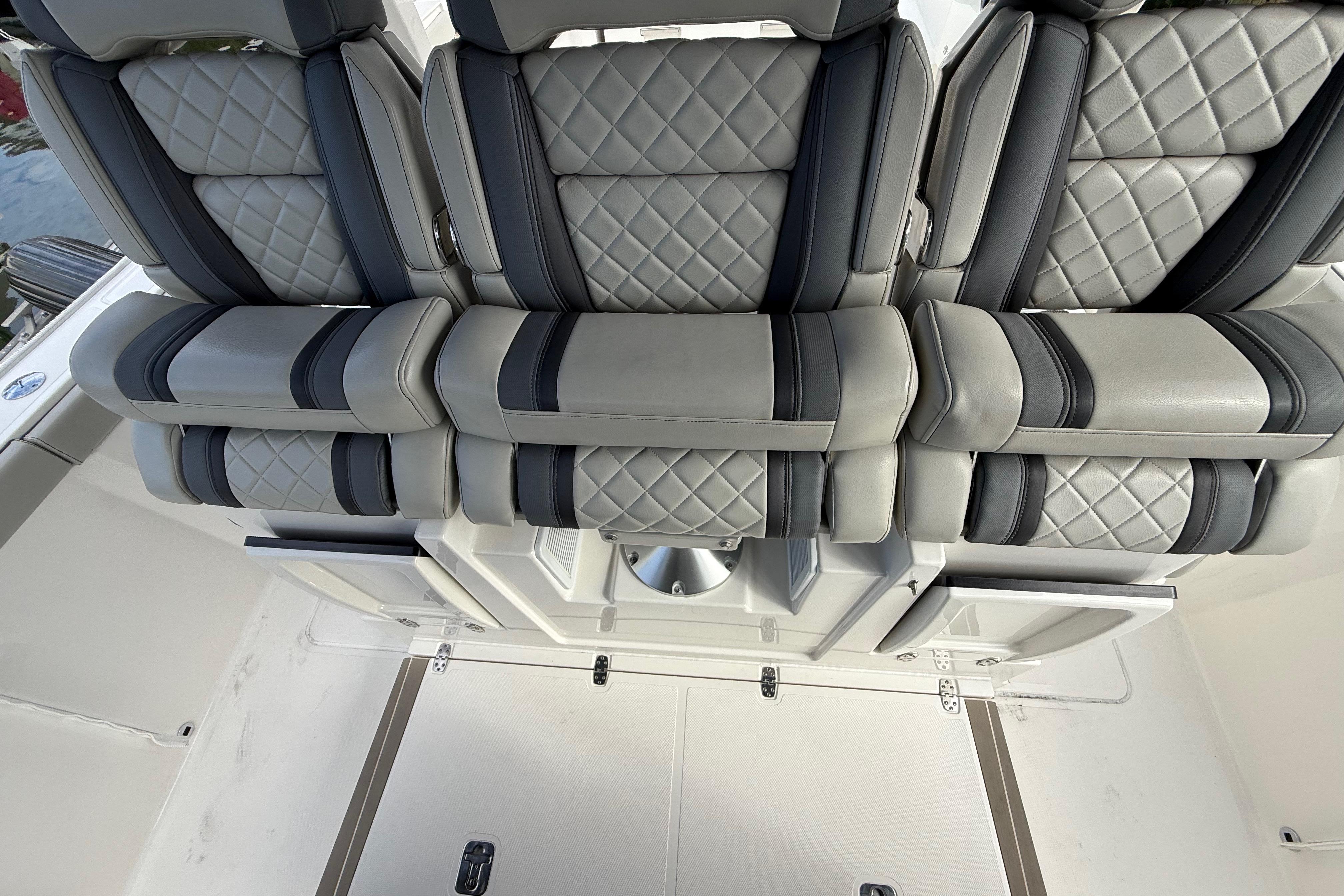 - Custom Triple Captain's Seats with Dedicated Folding Armrests, Three (3) Articulating Flip-Up Bolsters and Lumbar Support, Center Seat has Fore, Aft and Vertical Adjustments