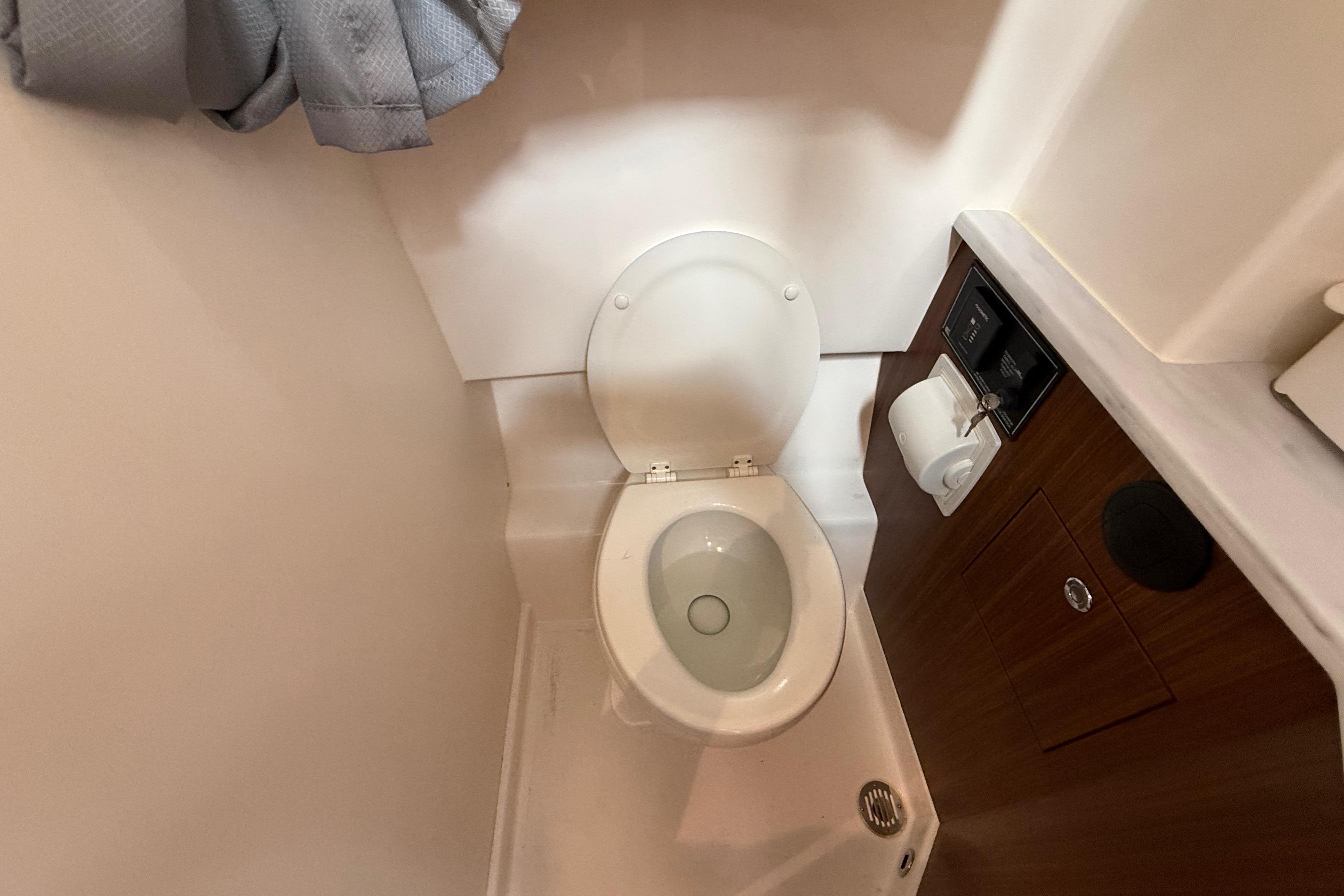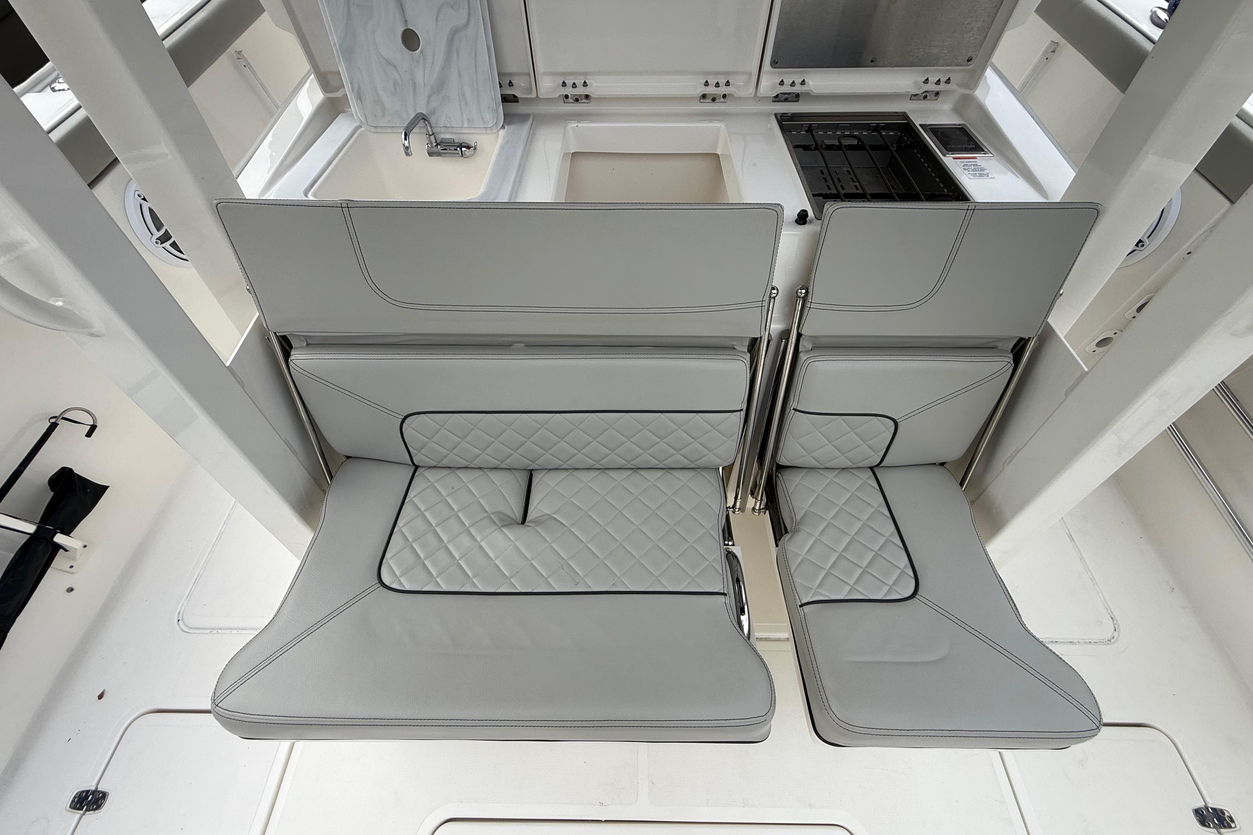 - Folding Split Aft-Facing Mezzanine Seat (patent pending): Extra Thick Seat Cushions with Auto Flip-Up Backrests, Grab Rails, and Low Maintenance Seat Faces with Solid Surface Top when Stowed