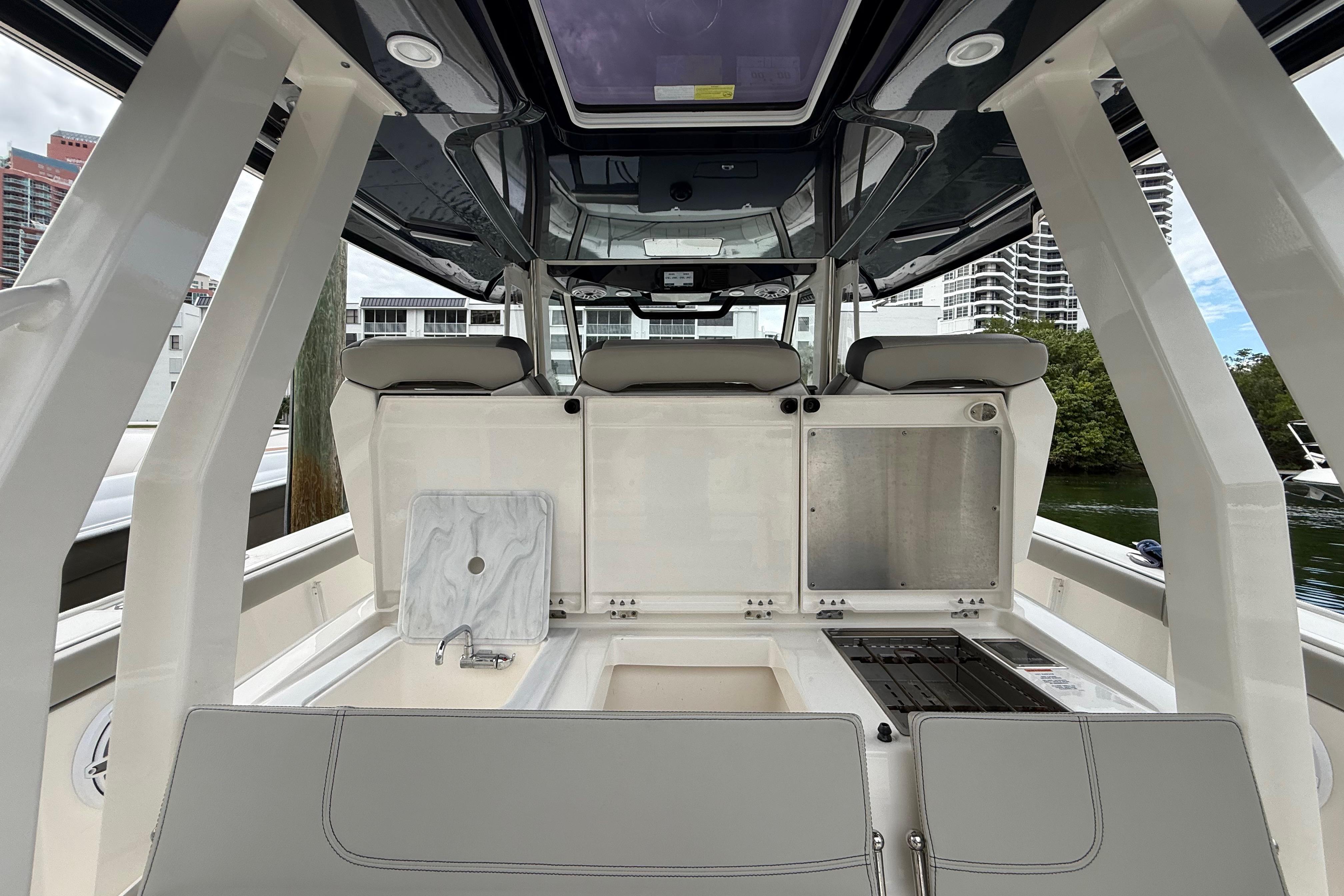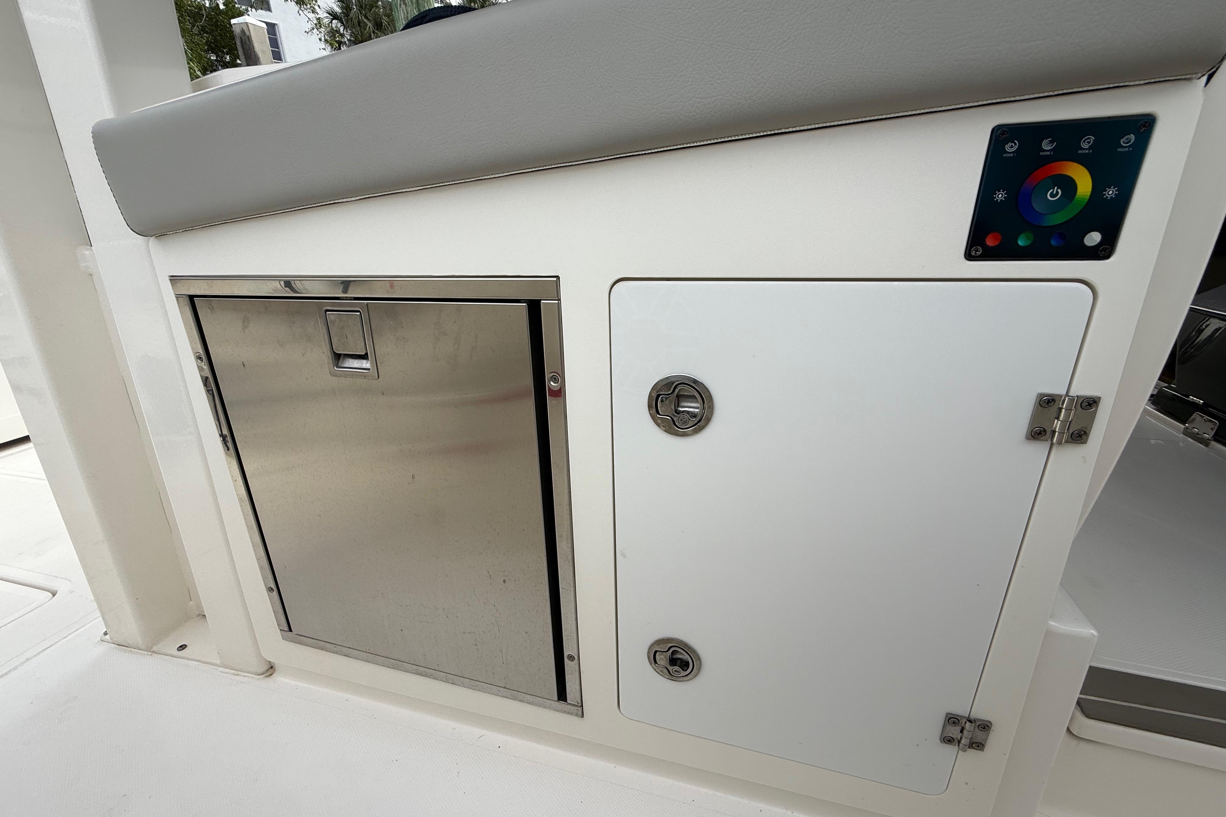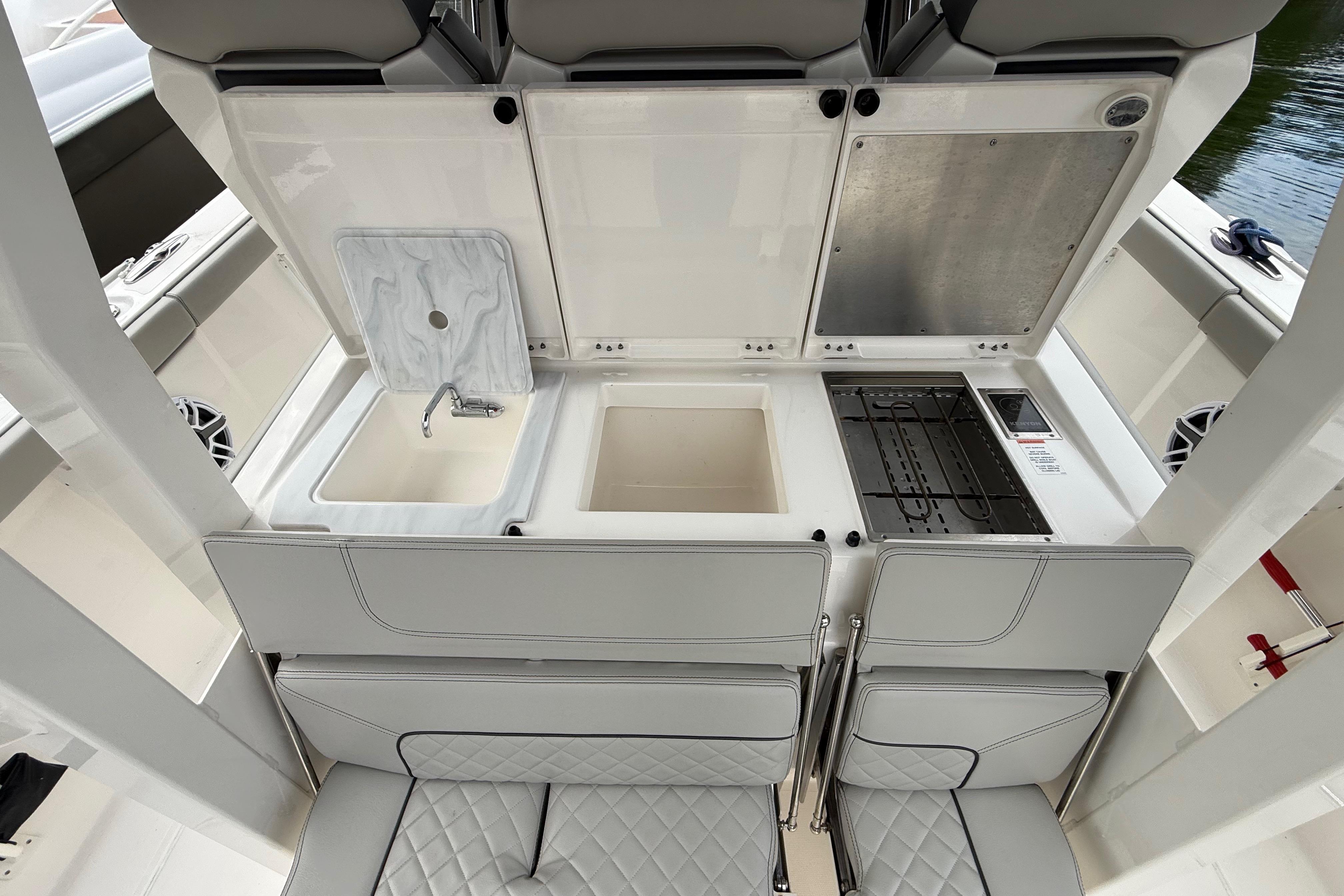 - Cockpit Entertainment Center: Sink with Removable Cutting Board & Fold-Down Faucet, Insulated Cooler Box, 120V Grill, 120V GFI Protected Outlet, Hinged Fiberglass Lids, 12V (2.3ft3) Pull-Out Style Stainless Steel Refrigerator, Slide-Out Trash Receptacle, and Bottle Opener