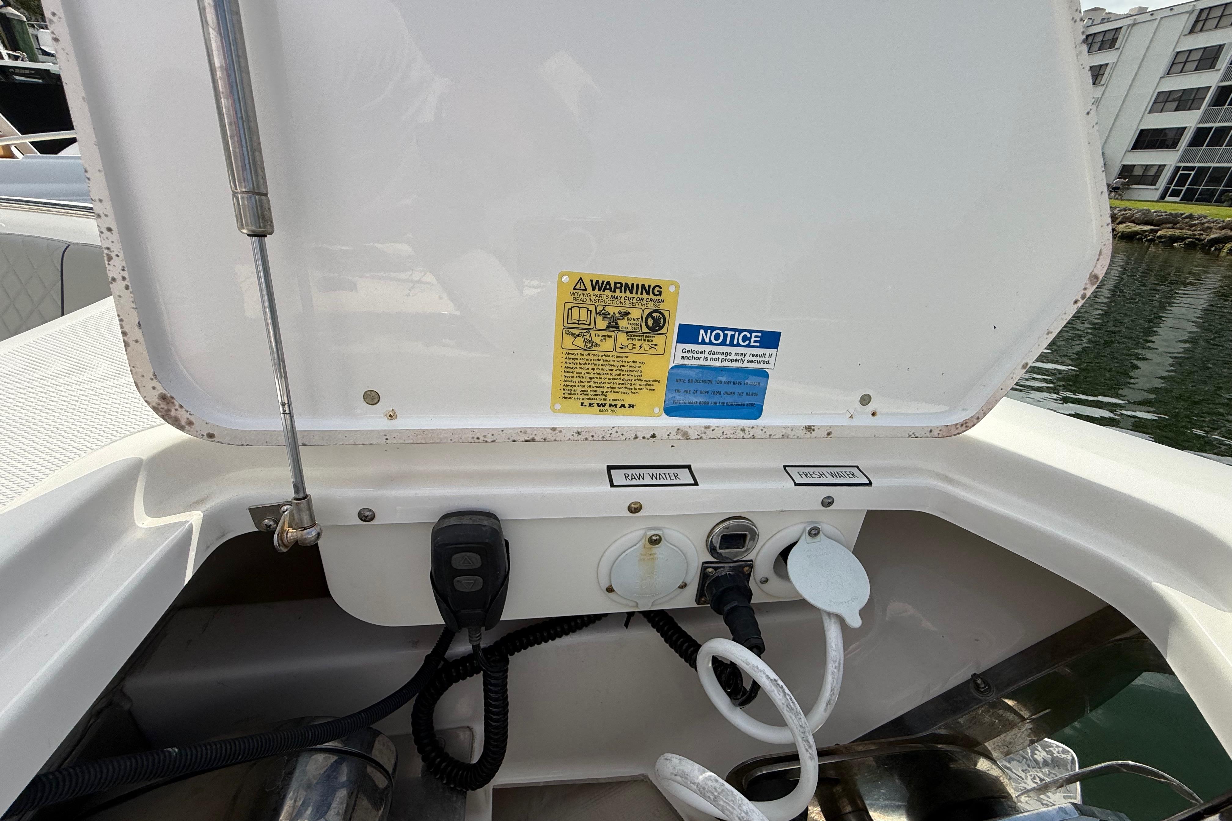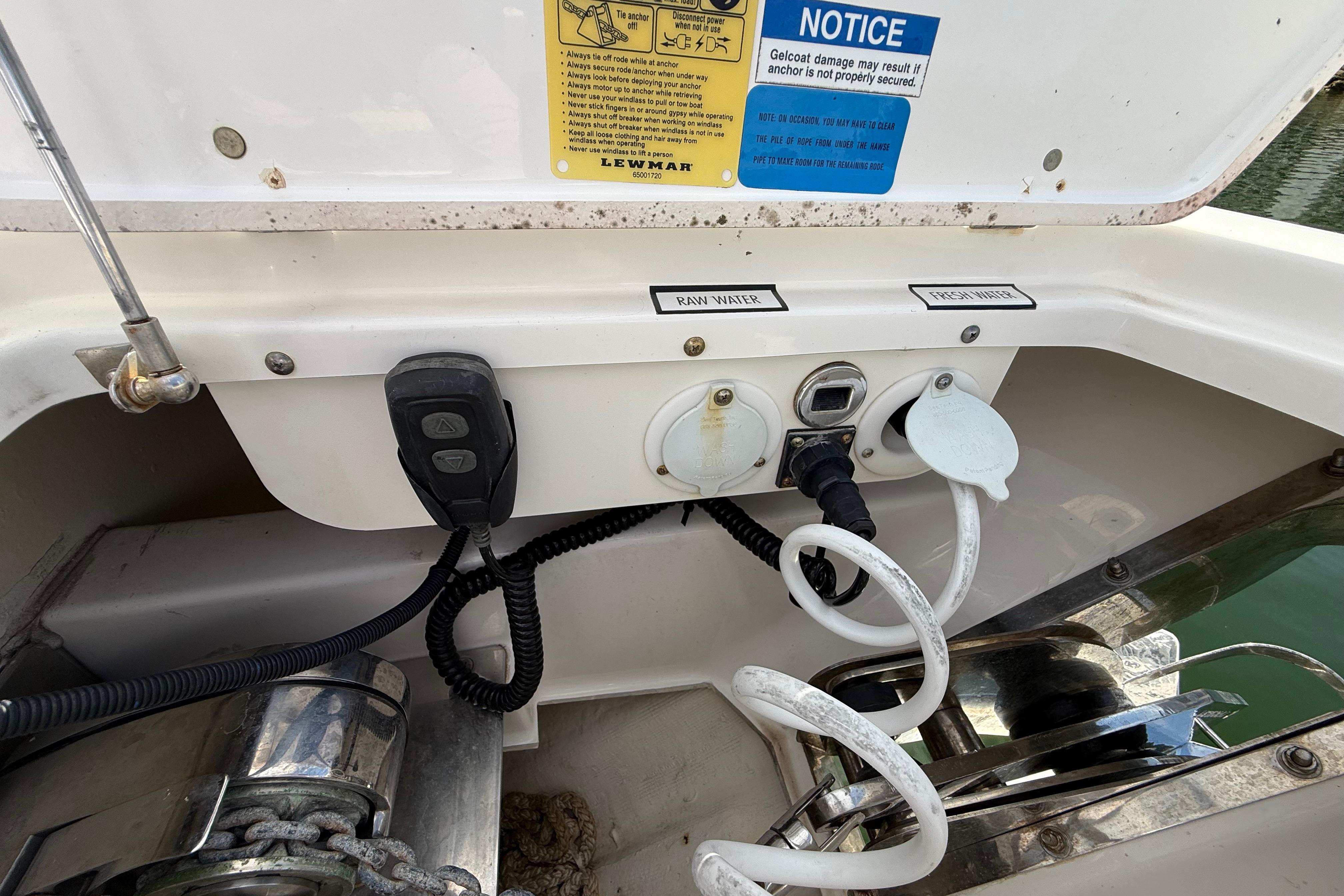 - Flush Mounted Integral Anchor Locker with Fiberglass Lid including: Horizontal Anchor Windlass with Switch at Helm and Remote at Anchor Locker, 316L Stainless Steel Thru-Stem Anchor Roller with 8" Mooring Cleat, Chain Binder, 22lb Stainless Steel Plow Style Anchor, Self-Righting Shackle, 200' Rode (1/2" 8 Plait including 20' of ¼" G4 Chain), Fresh & Raw Water Quick Connect Fittings and LED Courtesy Light