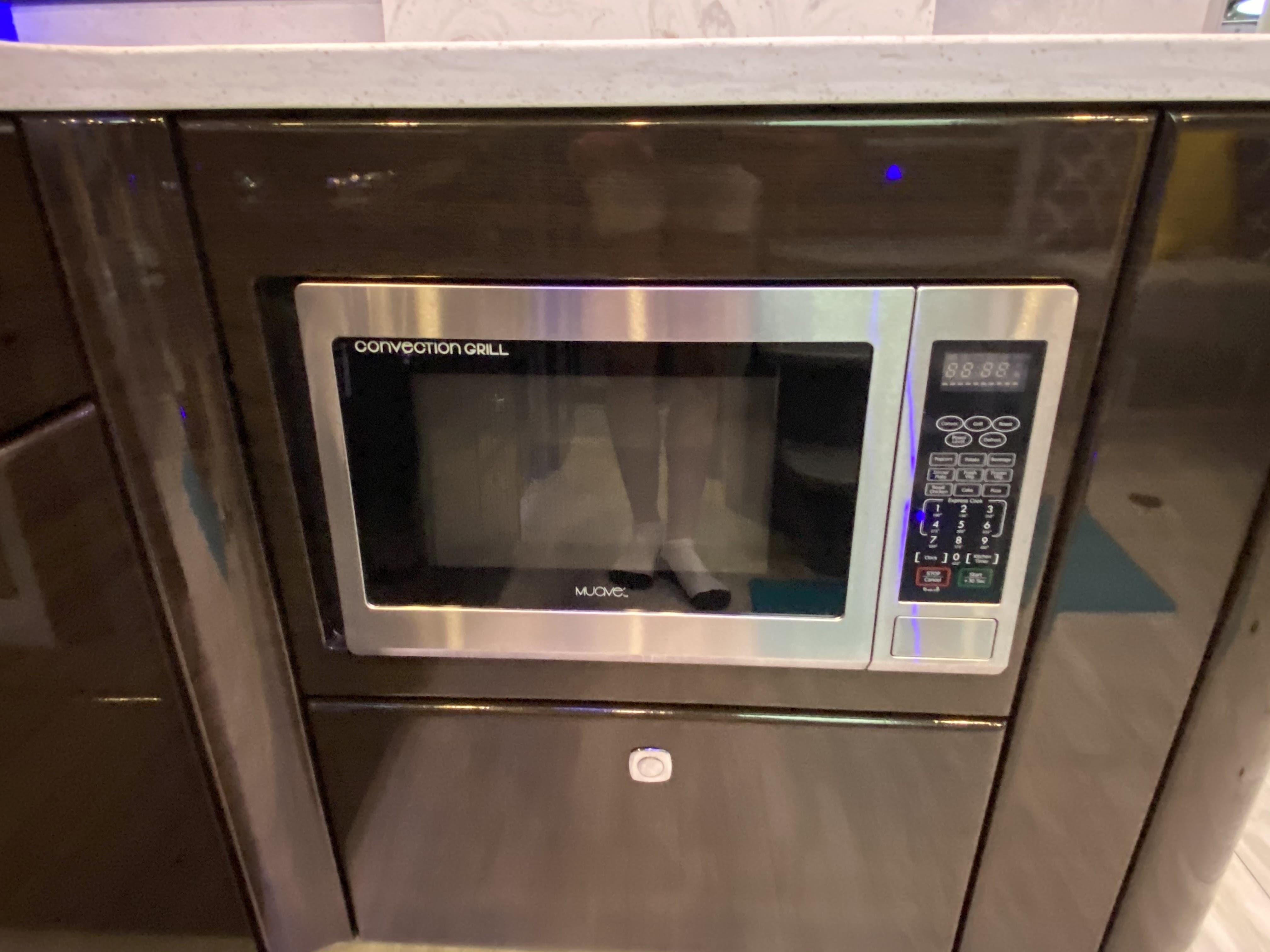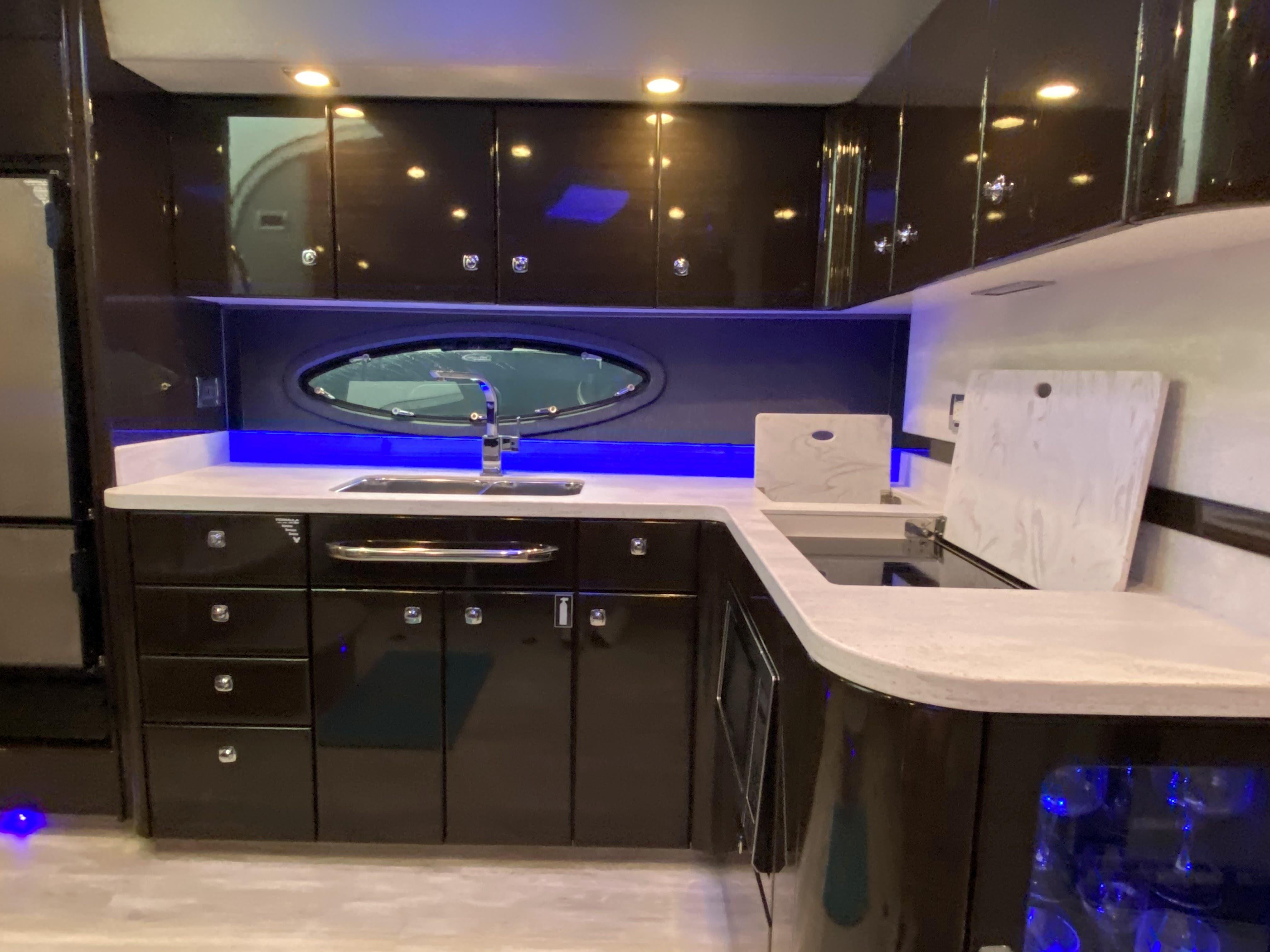 - L-shaped galley w/high-gloss Deep Cherry finish cabinetry, dovetailed hardwood drawers, full Corian countertop, double-bowl stainless steel sink w/swivel faucet, 2-burner electric stove w/flush Corian cover & safety shut-off switch, exhaust fan, brushed stainless steel convection/ microwave oven, Krups® coffee maker, 120V/12V upright refrigerator/freezer w/brushed stainless panels & concealed in-counter trash container