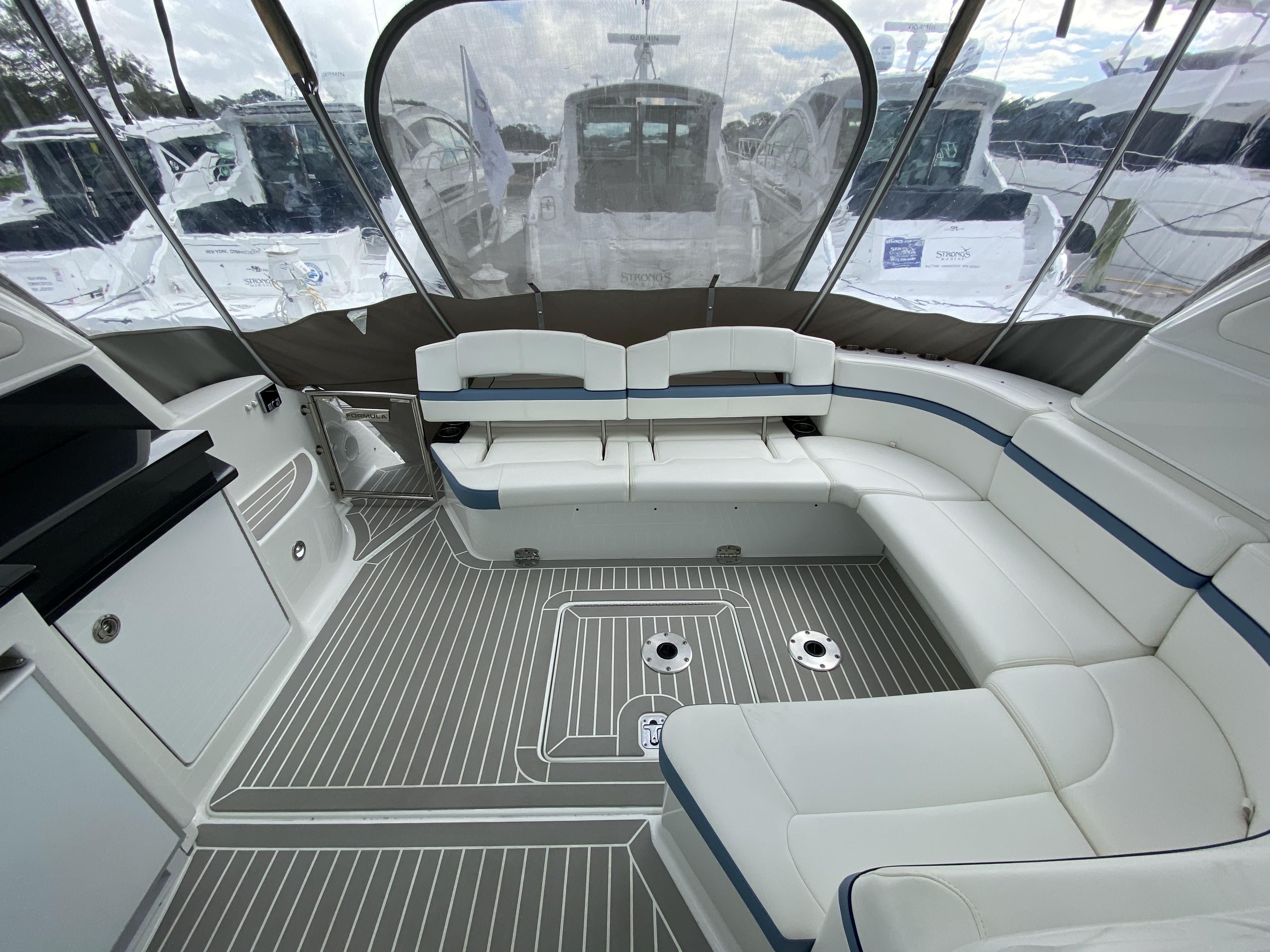 - Forward cockpit drop curtain and aft curtain enclosure w/easy-mount zipper connections in color-coordinated non-fading Sunbrella acrylic fabric w/SeaMark™ vinyl undercoating