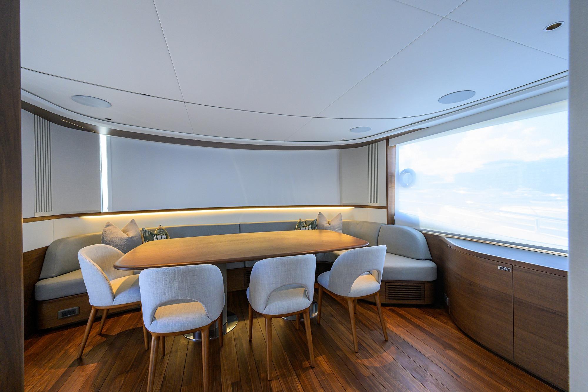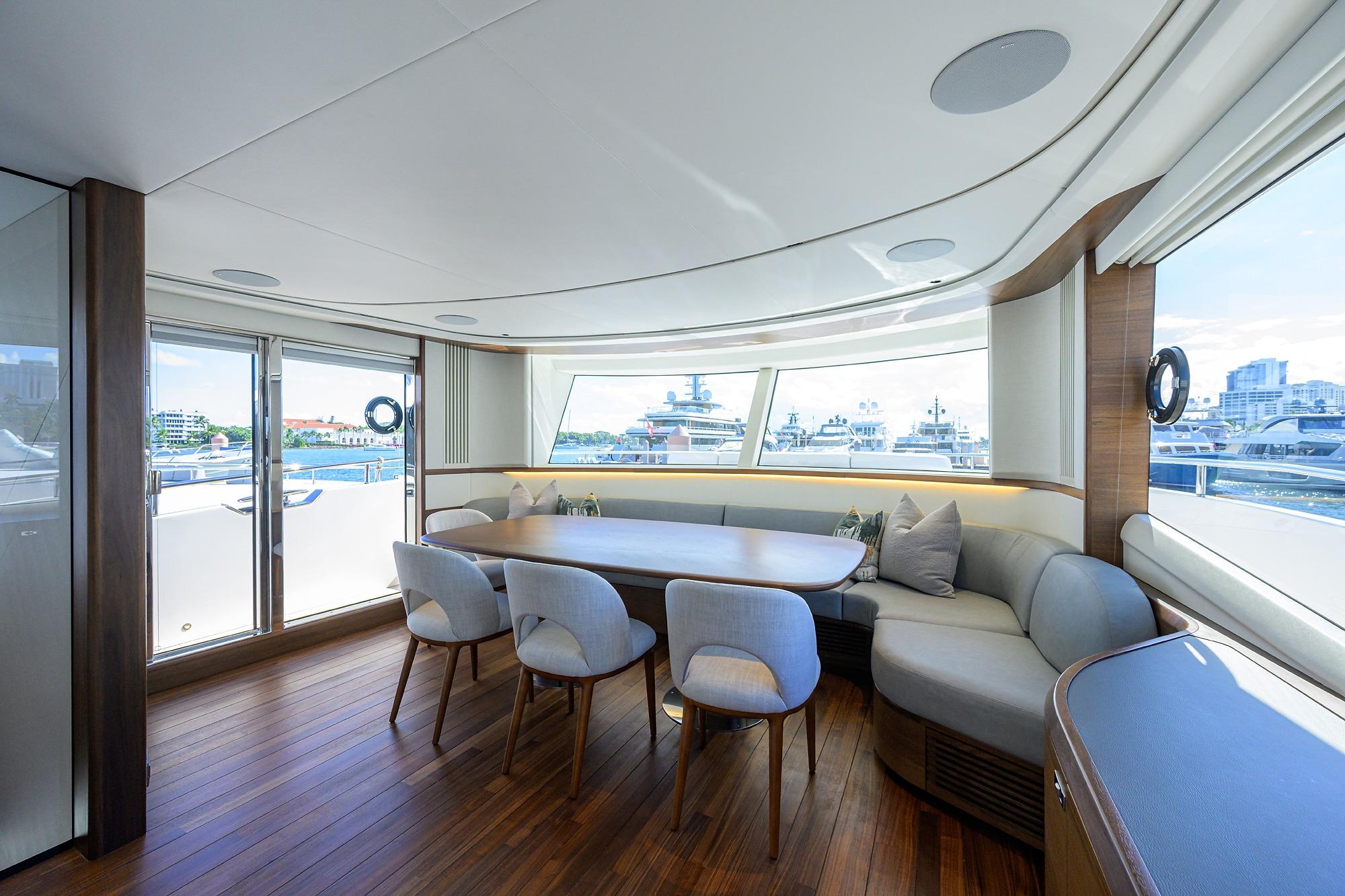 • L-shaped companion seating to port with deployable side table and optional navigator seat to starboard.