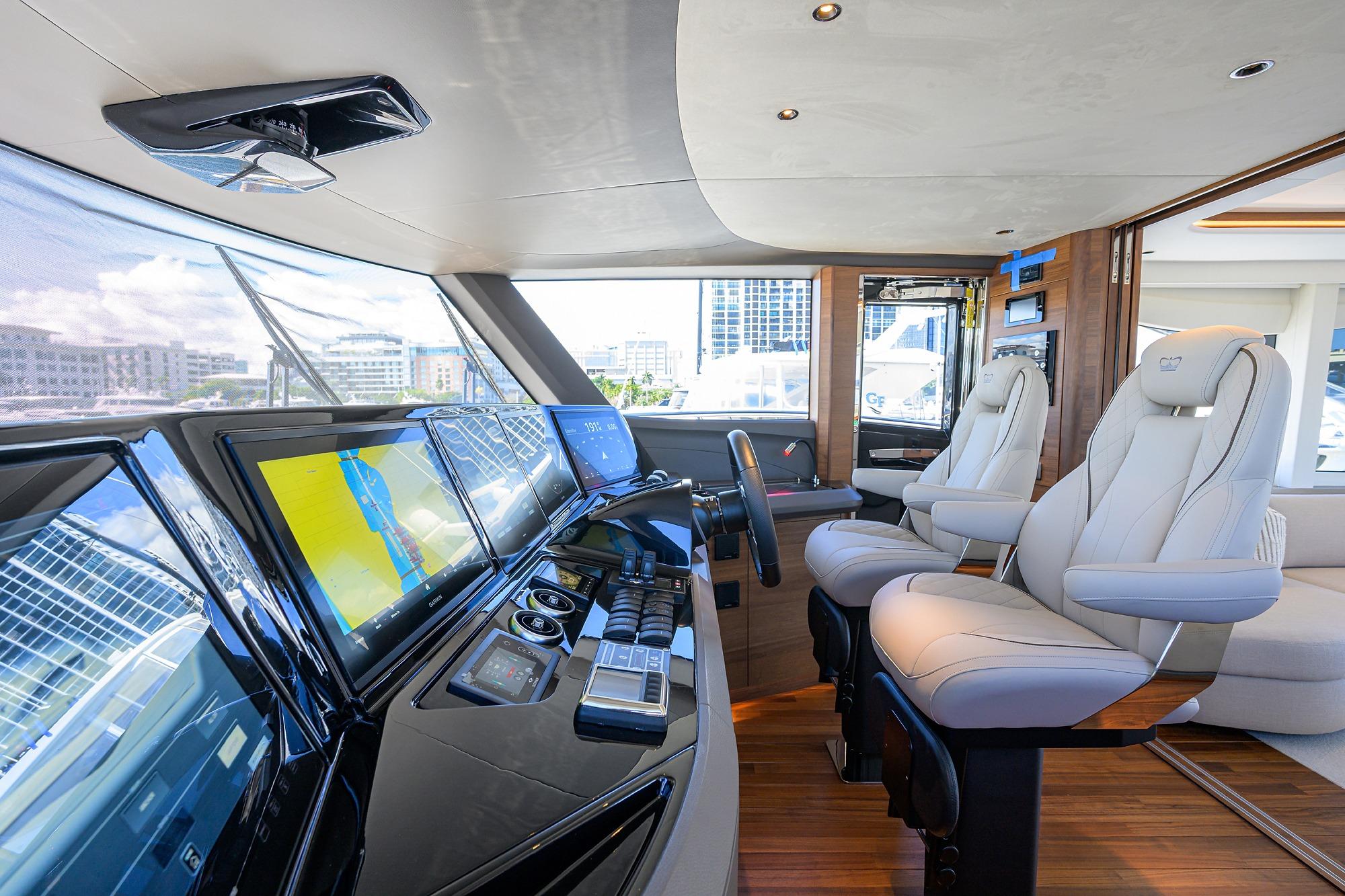 • Enclosed pilot house with central leather upholstered electric seat with fore, aft and
