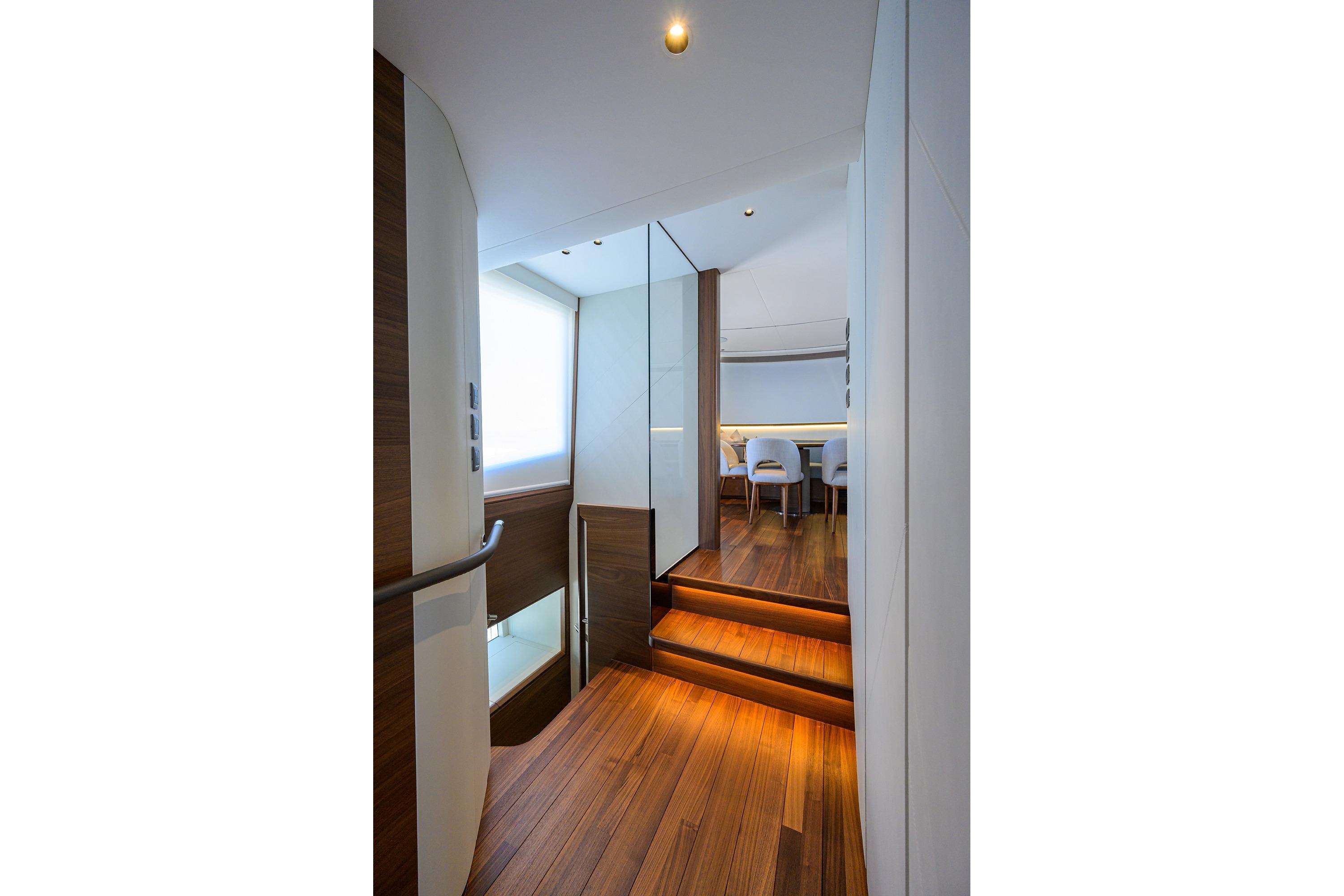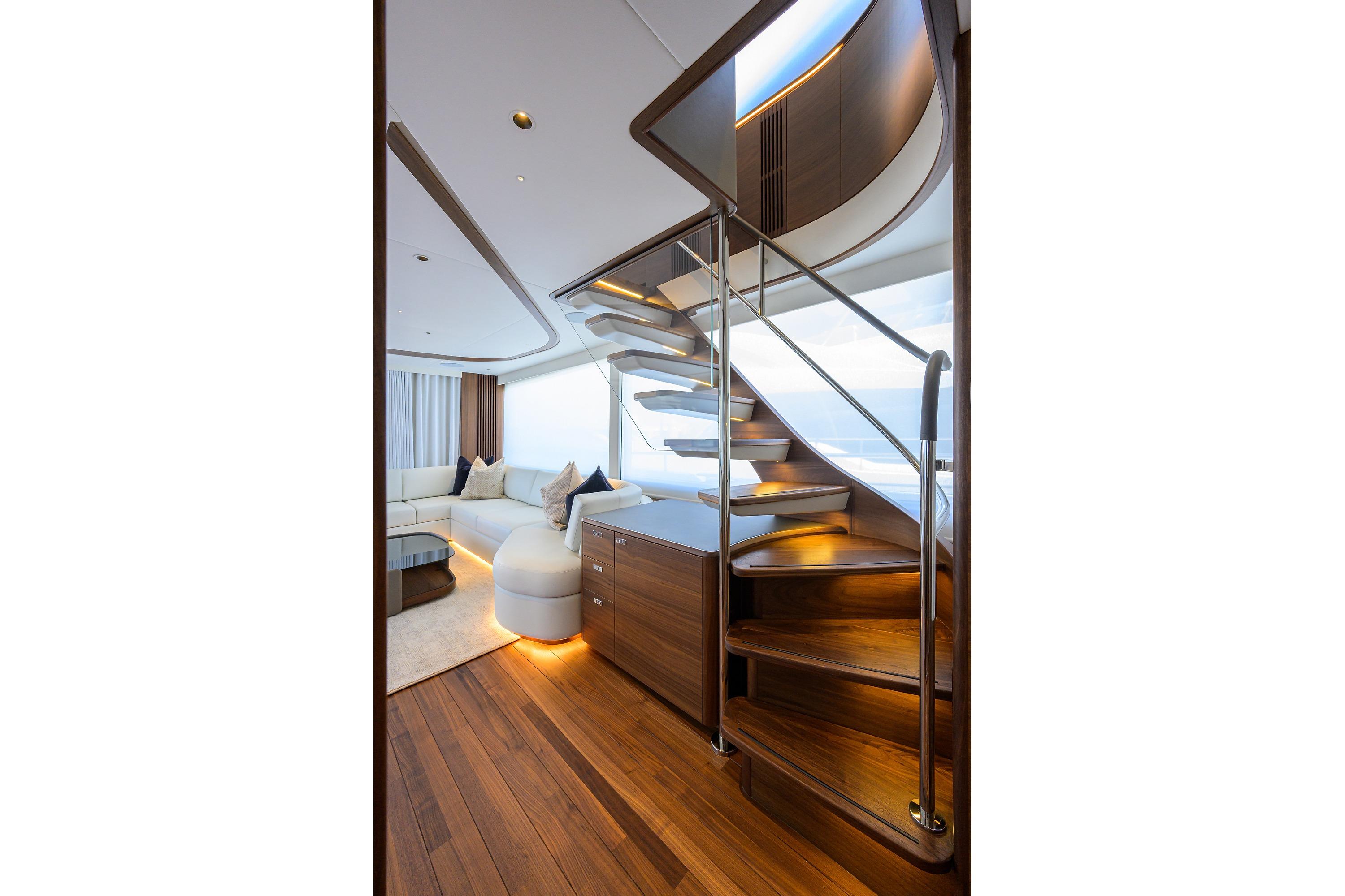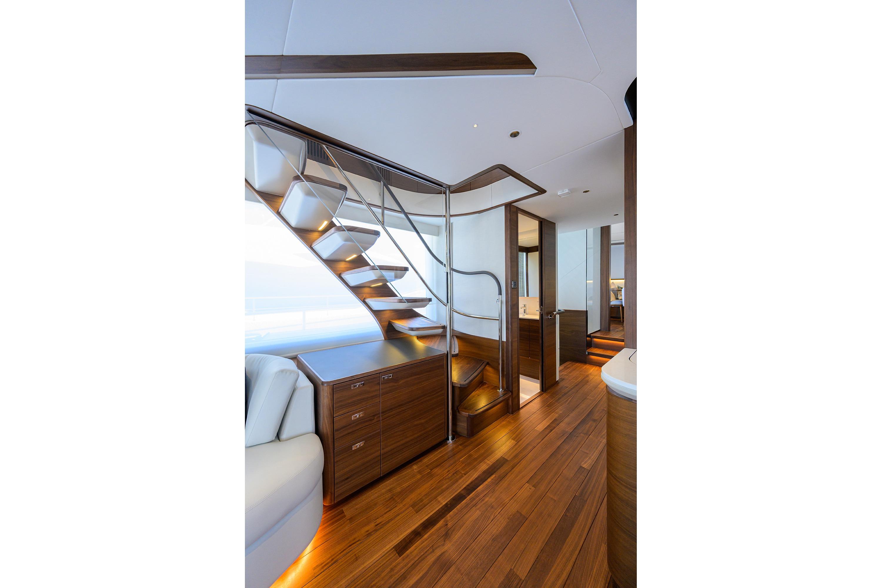 • Integral stairway to flybridge with teak step treads