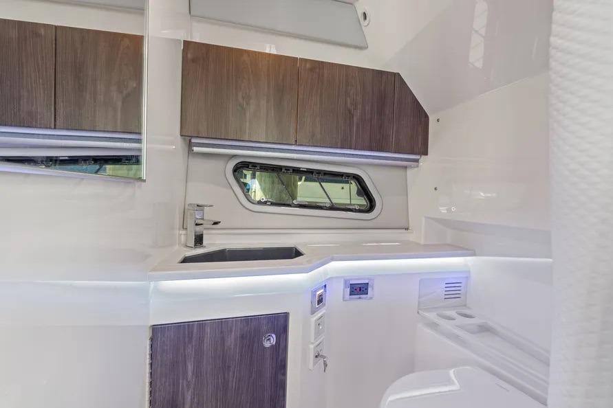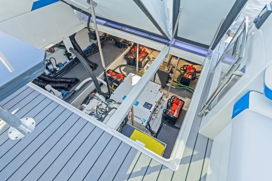 Swim-platform sport station w/ drink holders · cockpit grill · insulated aft cooler under bench · cockpit LED TV (DVD) · bed linens & coverlet (memory-foam mattress) · electric security safe · vacuum head w/ macerator · YETI cooler upgrade · full rear canvas enclosure + seat & sport-bar covers · carbon-fiber gangway · bow lounge w/ tables · recent survey (7/8/2025) · lift-kept, weekly washed