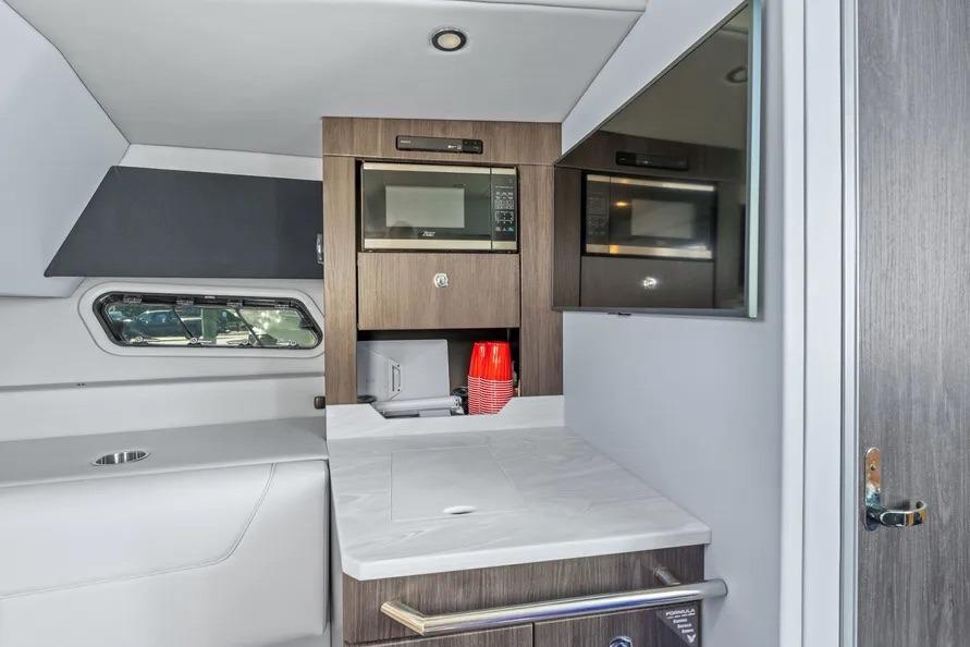Below, the air-conditioned cabin sleeps four across a forward settee and a private queen berth, with a fully enclosed head/shower, microwave, abundant storage, and premium finishes. Triple V10s with Joystick Piloting make close-quarters handling intuitive; Seakeeper 3 and a bow thruster settle the ride underway and on the hook. With low engine hours, current warranties, and a fresh survey in hand, this 38 SSC presents as a fully loaded, ready-to-enjoy package.
