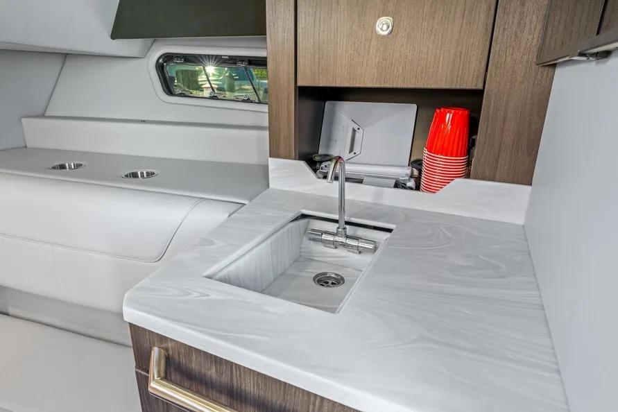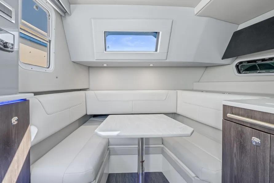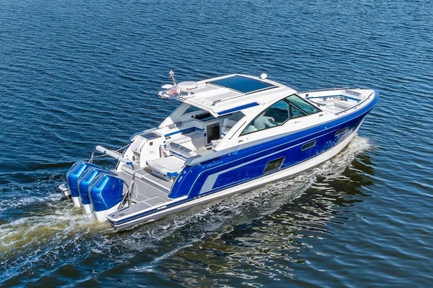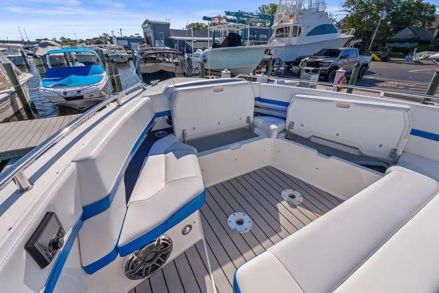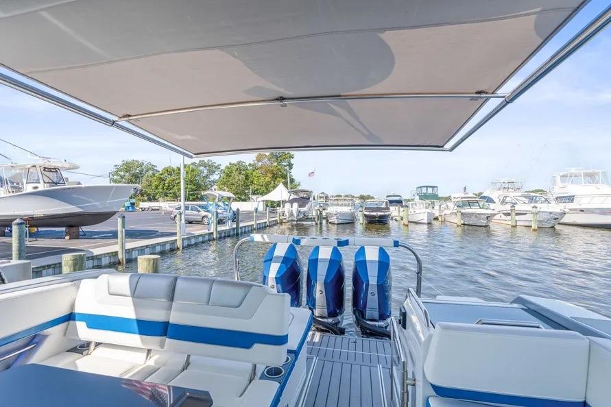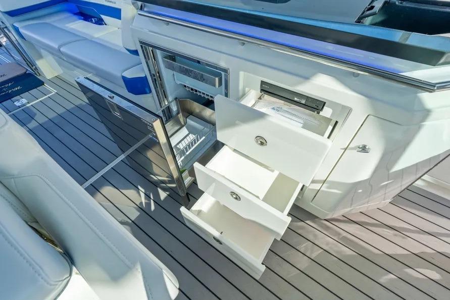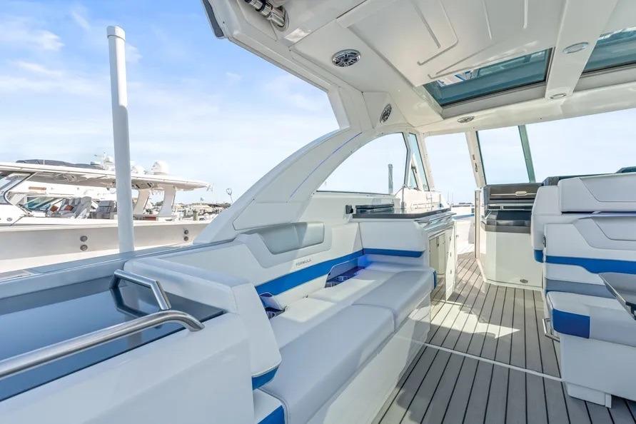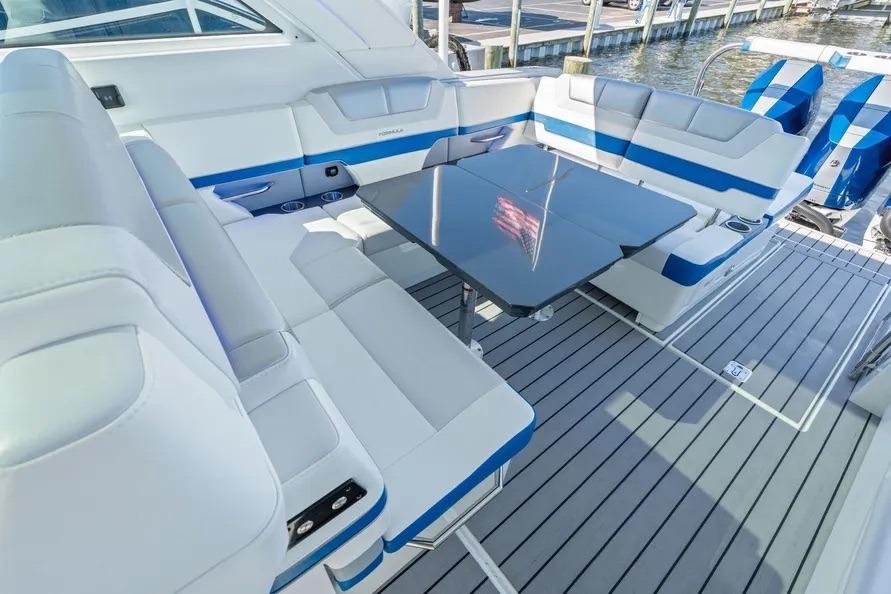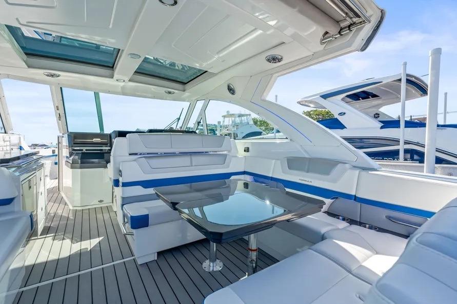 This beautiful vessel blends Formula’s offshore ride with day-to-night versatility. The cockpit is shaded at the touch of a button and kept cool with dedicated A/C; seating wraps from the helm aft around an entertainment galley with grill and a massive insulated cooler. Forward, the open bow lounge adds table-mounted dining, while the swim-platform sport station brings you right to the water for easy in-and-out.