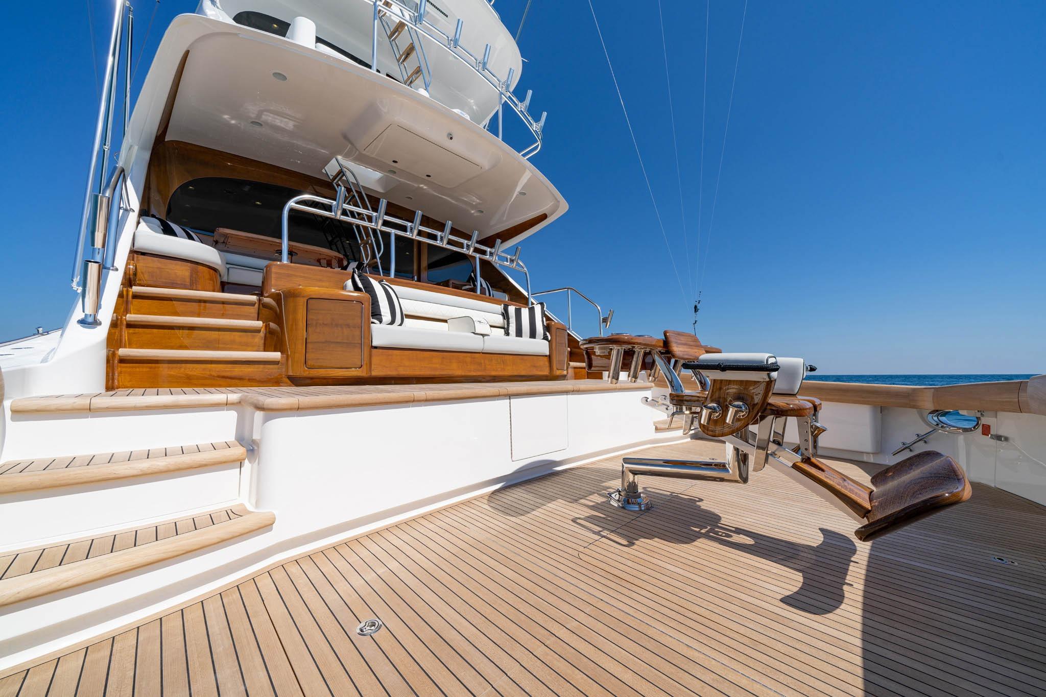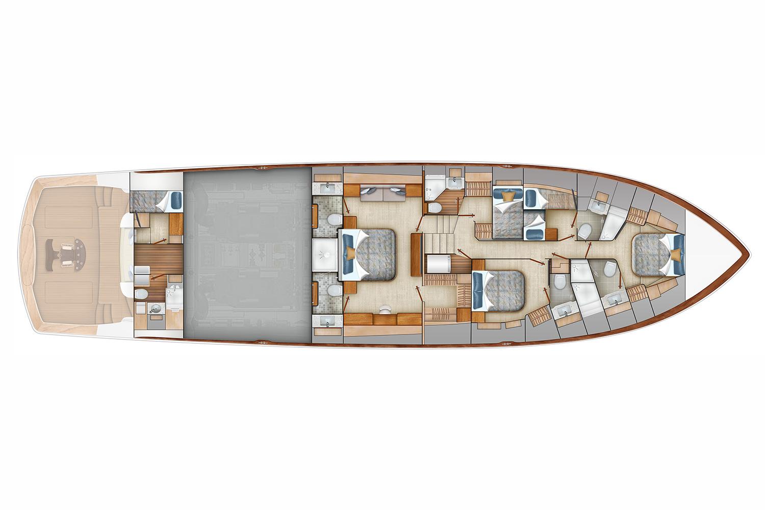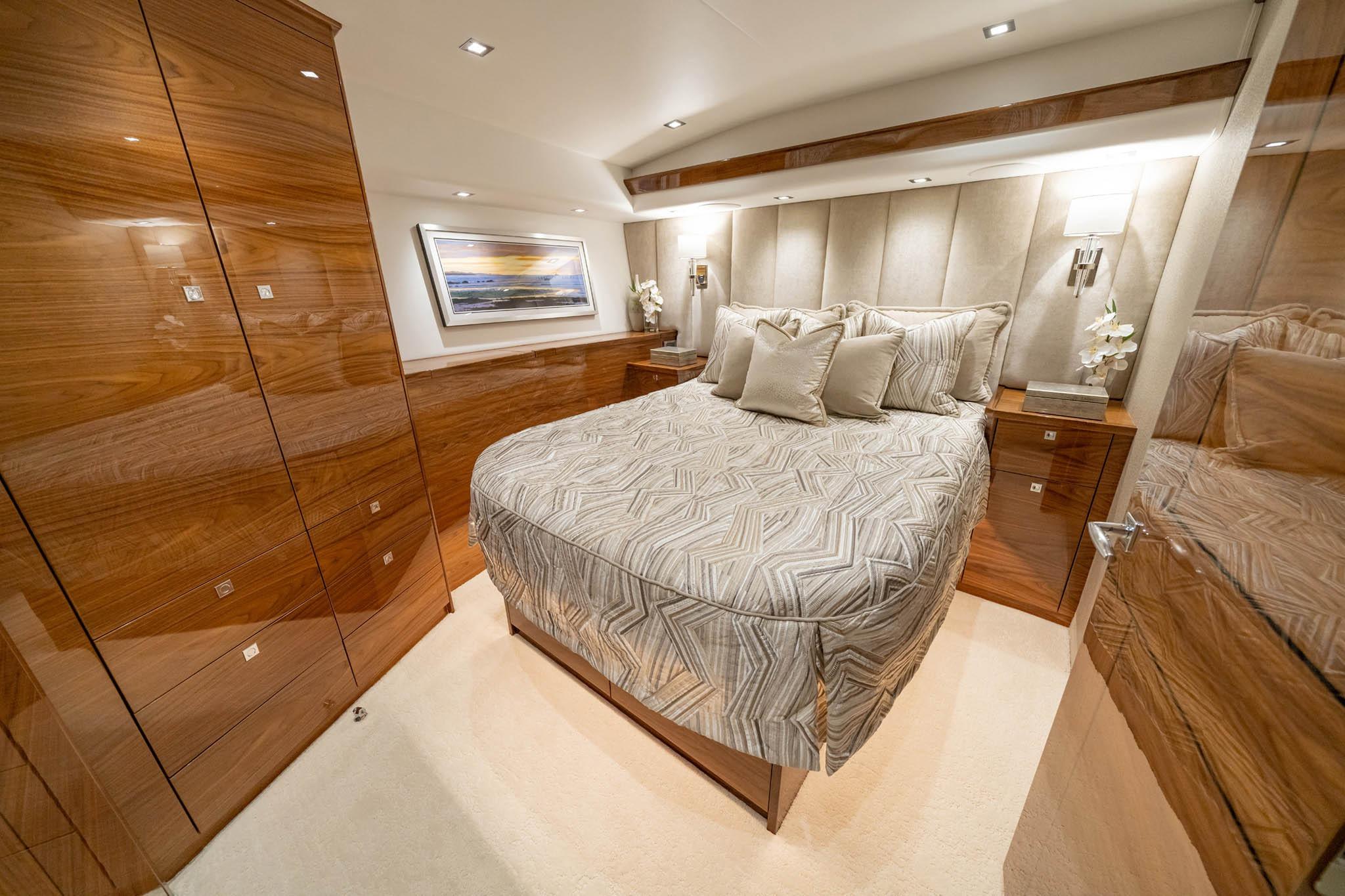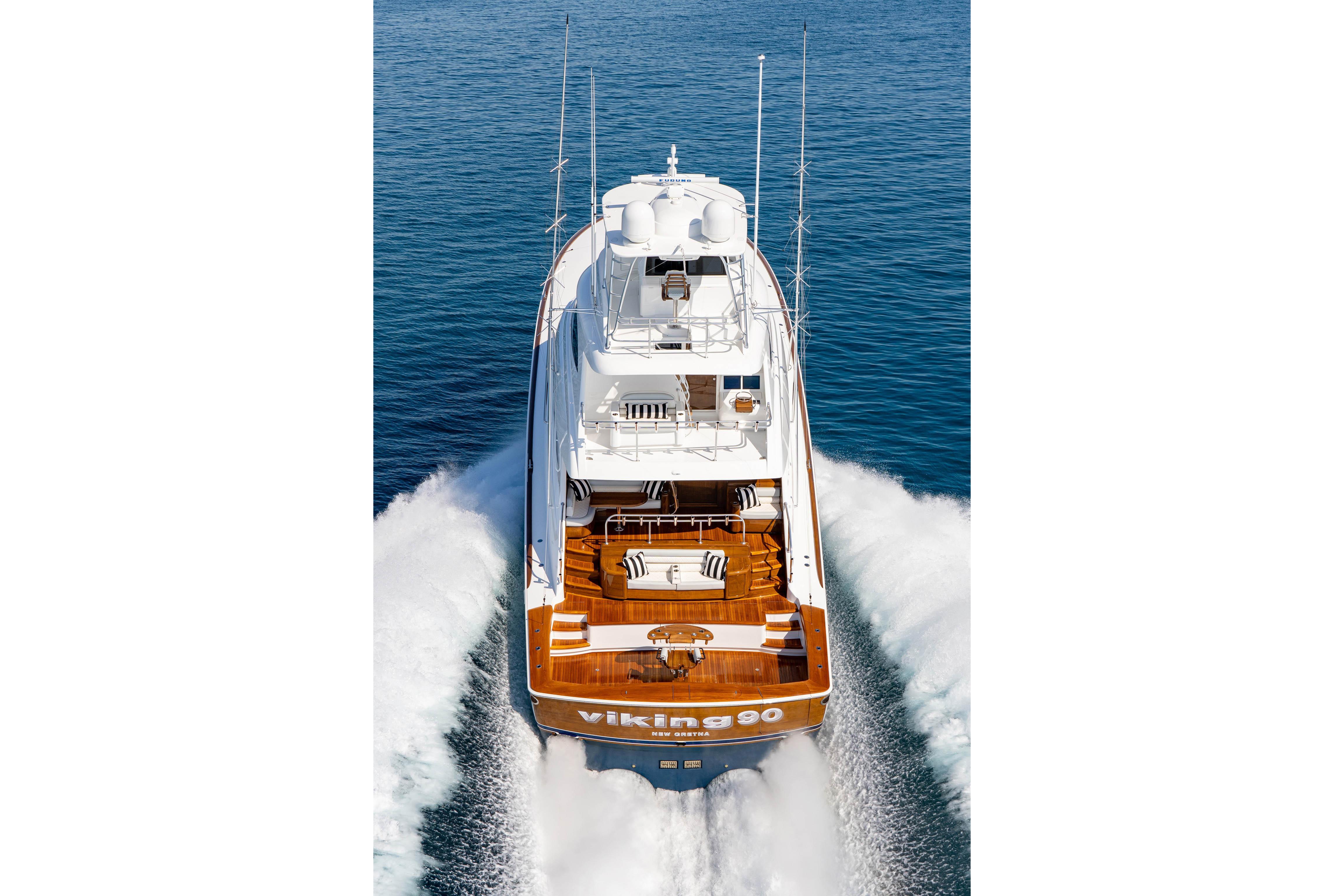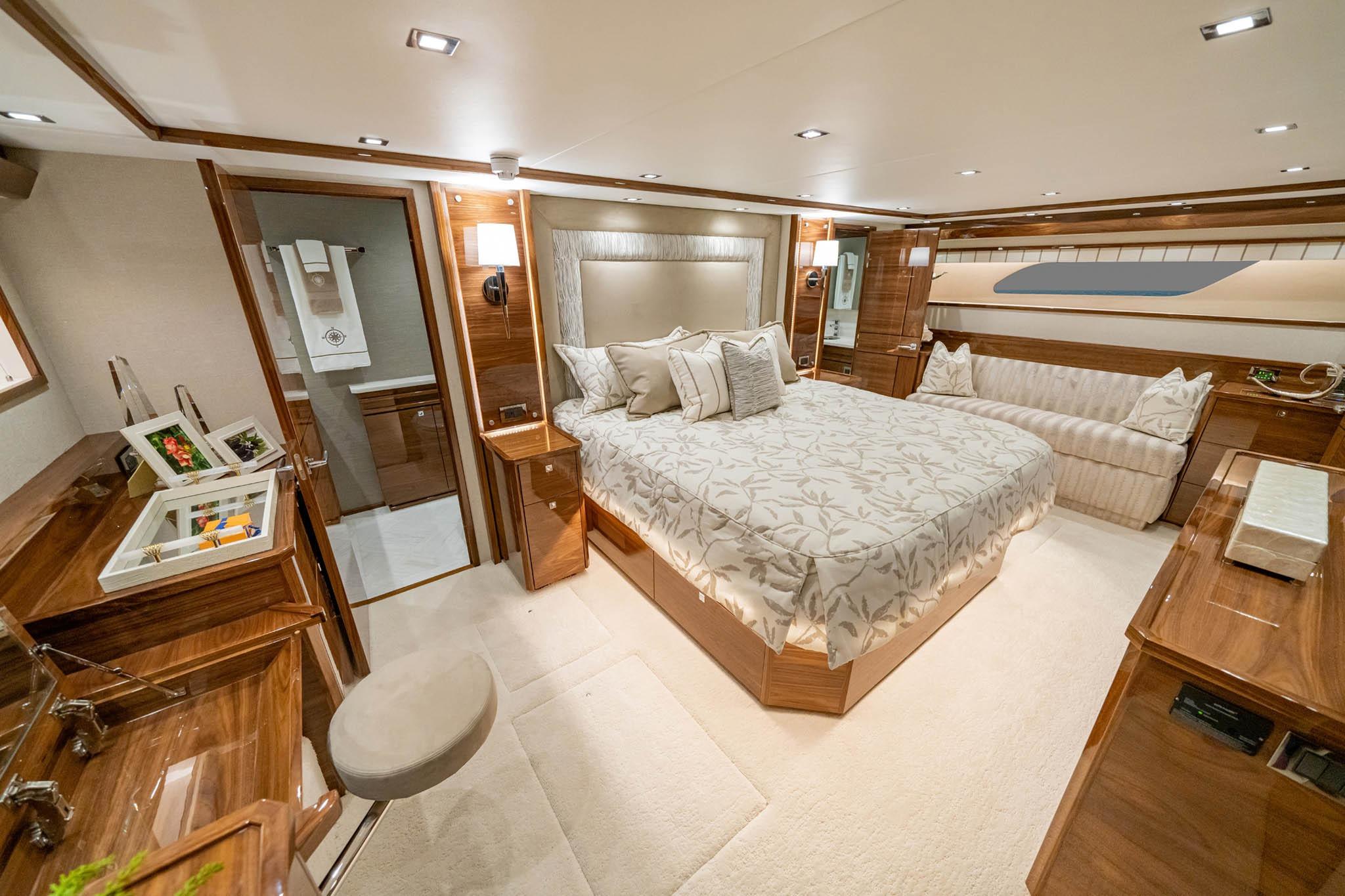Step inside to a full-beam master suite and four additional staterooms, each with its own en-suite head plus crew quarters with engine-room access. The salon showcases horizontal-grain walnut joinery, stone countertops, and premium finishes that define Viking’s craftsmanship.