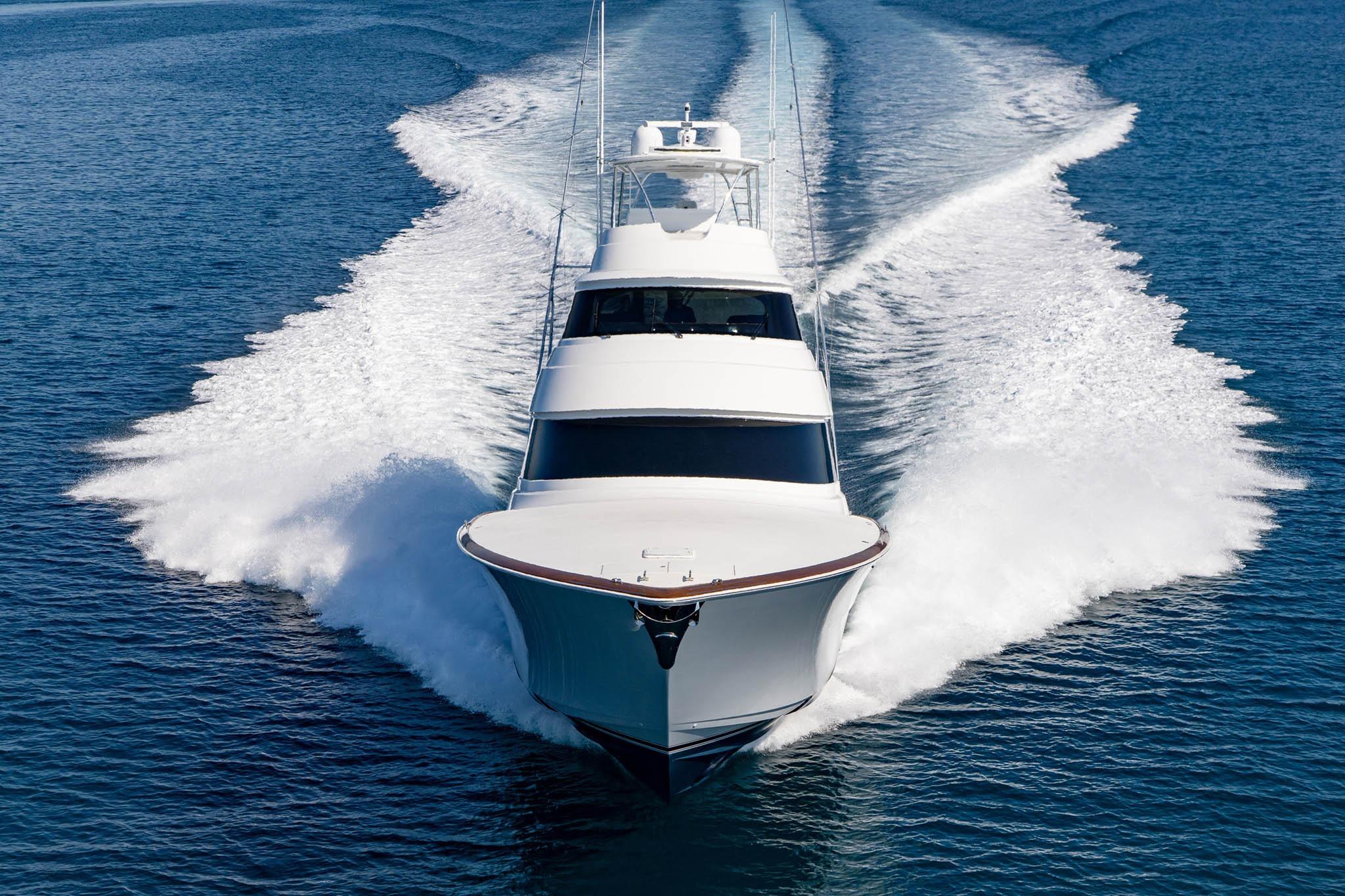 Built on a resin-infused fiberglass hull with a 23’ 2” beam and nearly 200,000 lbs of displacement, the Viking 90 Sky Bridge is engineered for strength, speed, and sea-kindliness. Twin CAT / C32A 1925 engines deliver high-efficiency cruising and tournament-level acceleration. The deep-V hull and advanced running surface ensure a soft, dry ride even in demanding offshore conditions.