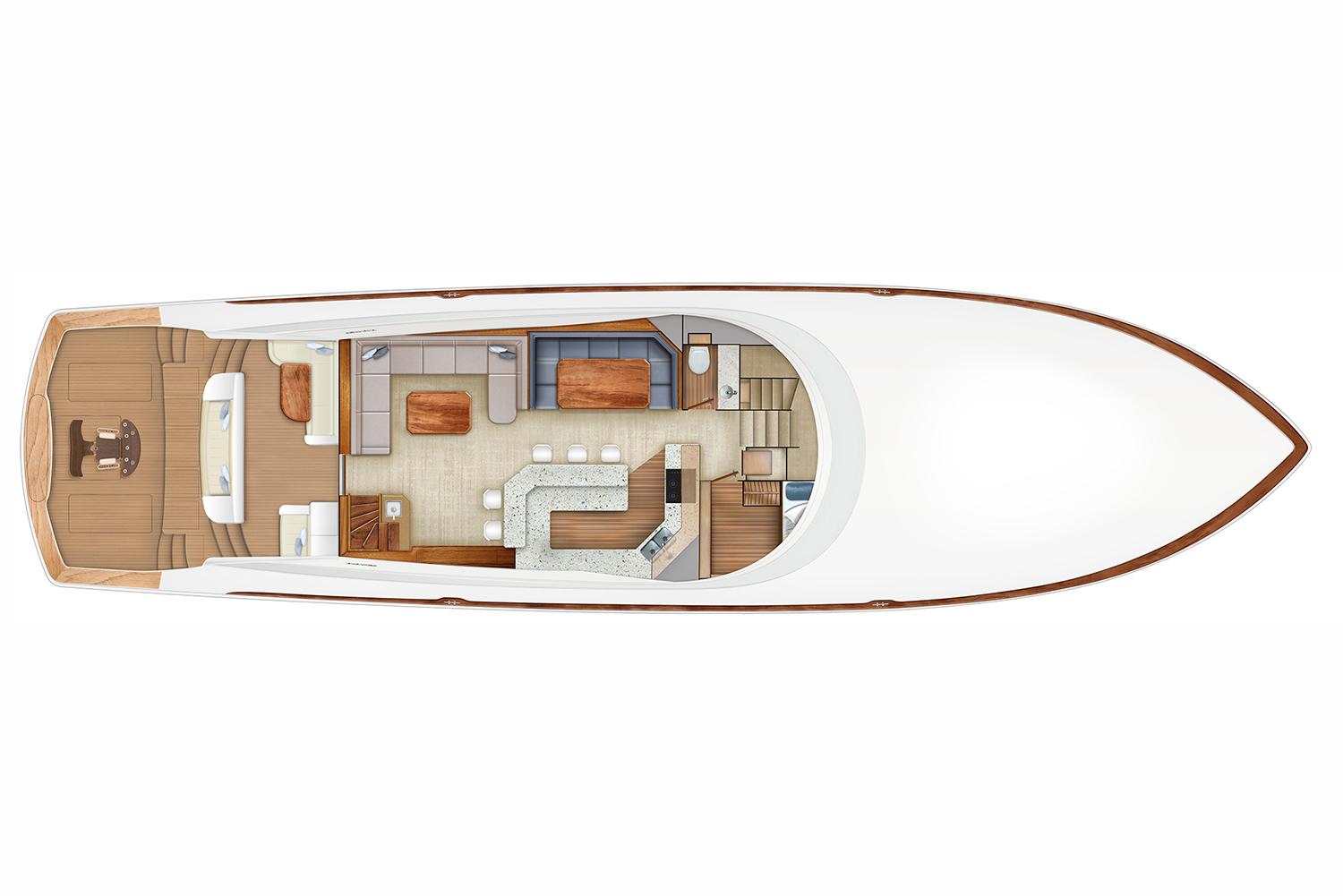 The Sky Bridge configuration offers the best of both worlds—an enclosed, climate-controlled helm with panoramic visibility, plus an open fly helm above for the ultimate command view. The upper helm is equipped with redundant controls, electronics, and integrated seating, ensuring both serious offshore function and relaxed cruising comfort.