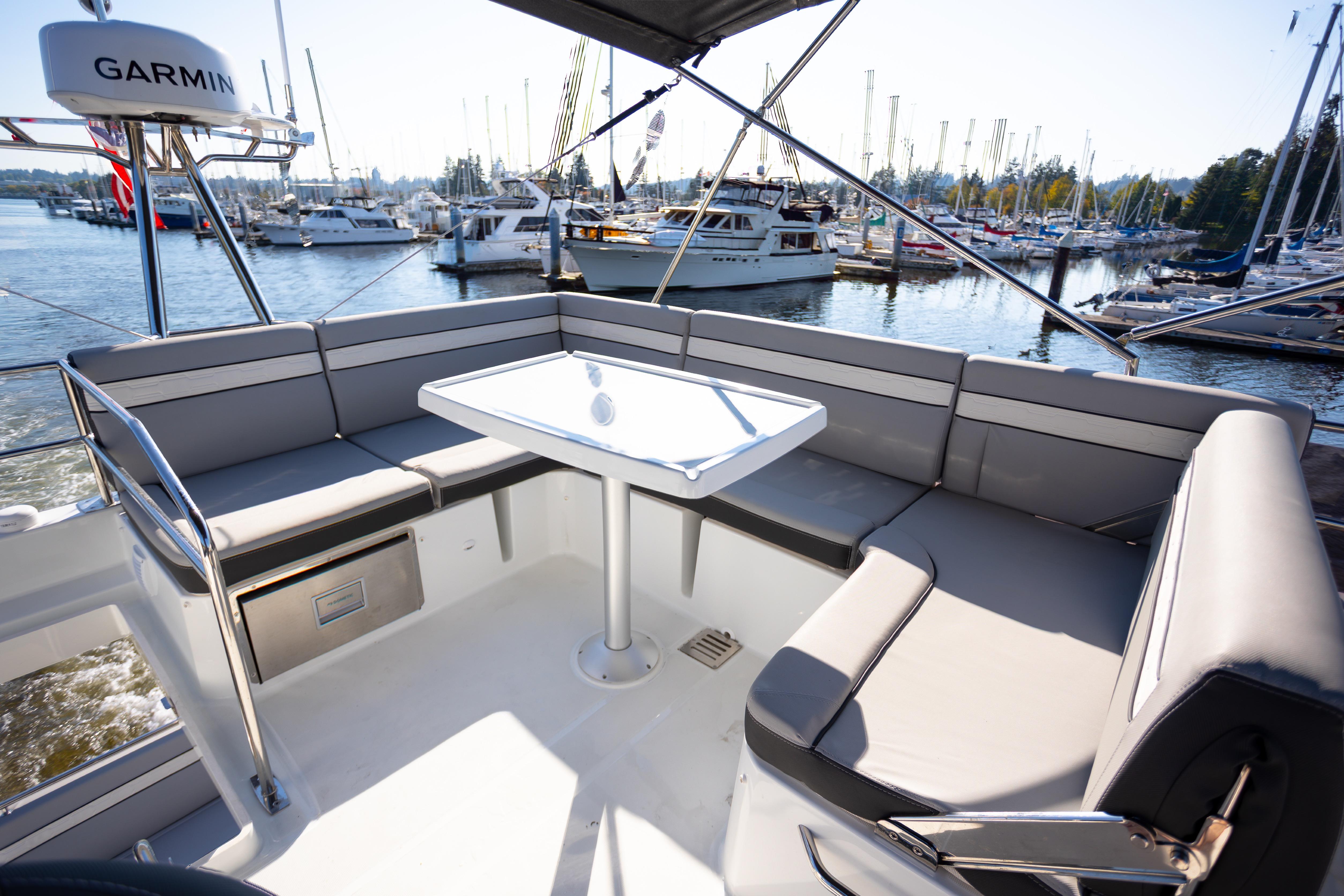 Wide side decks lead forward to a spacious bow lounge with adjustable backrests, cup holders, and a removable table — perfect for relaxing or entertaining.