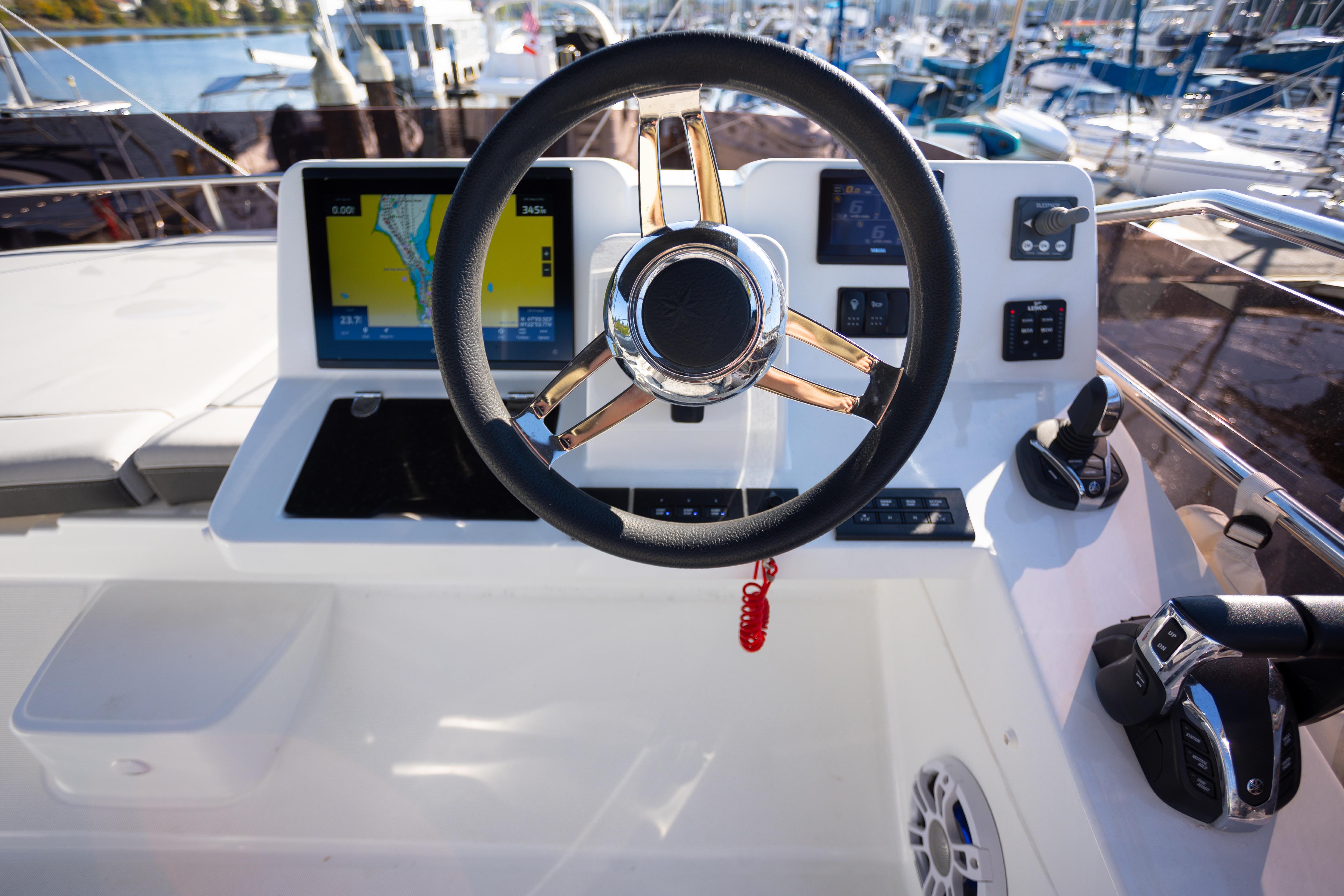 The flybridge helm mirrors this setup, with an additional Garmin display, joystick, engine start/stop, trim tab controls, and full visibility.