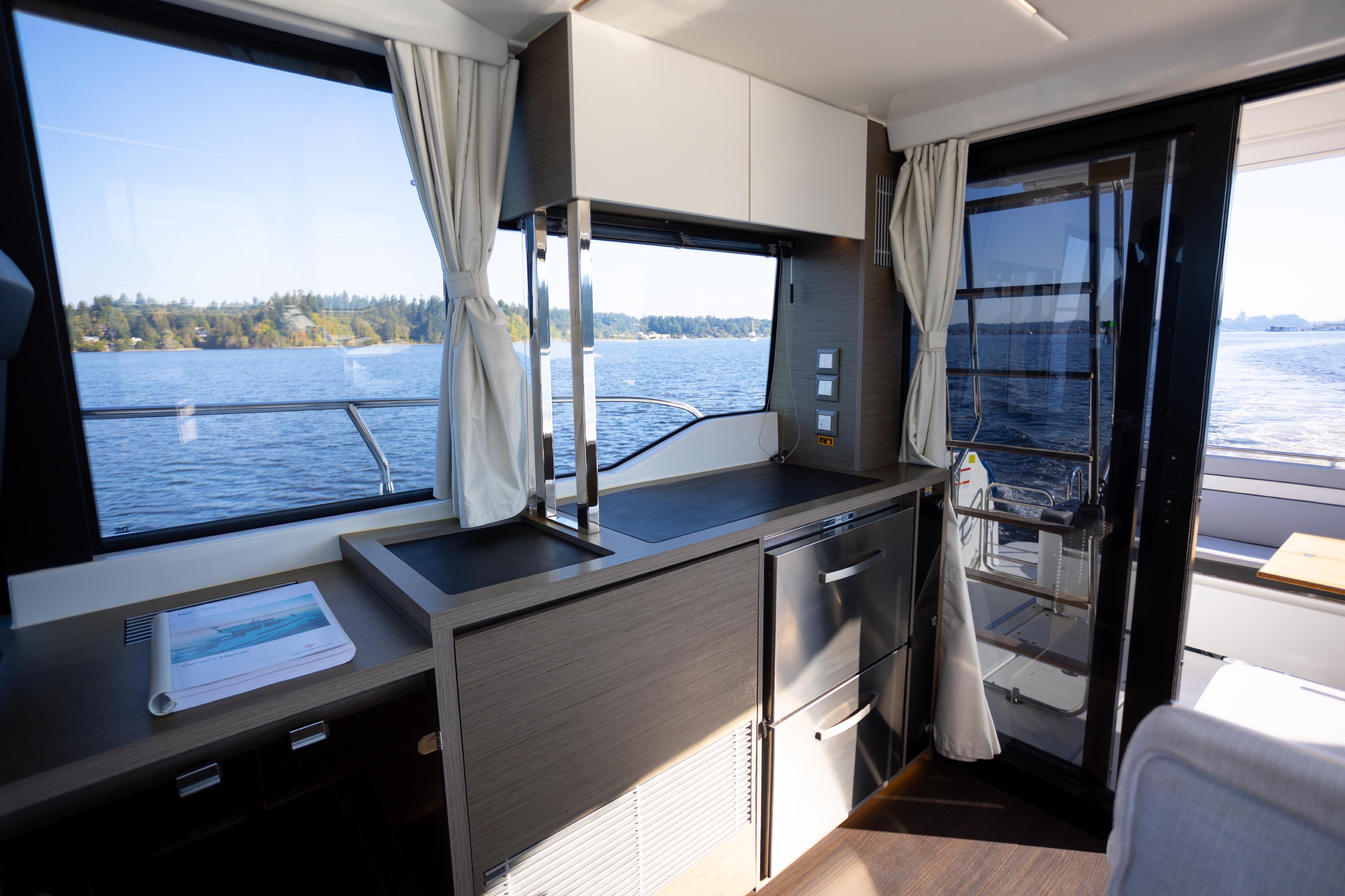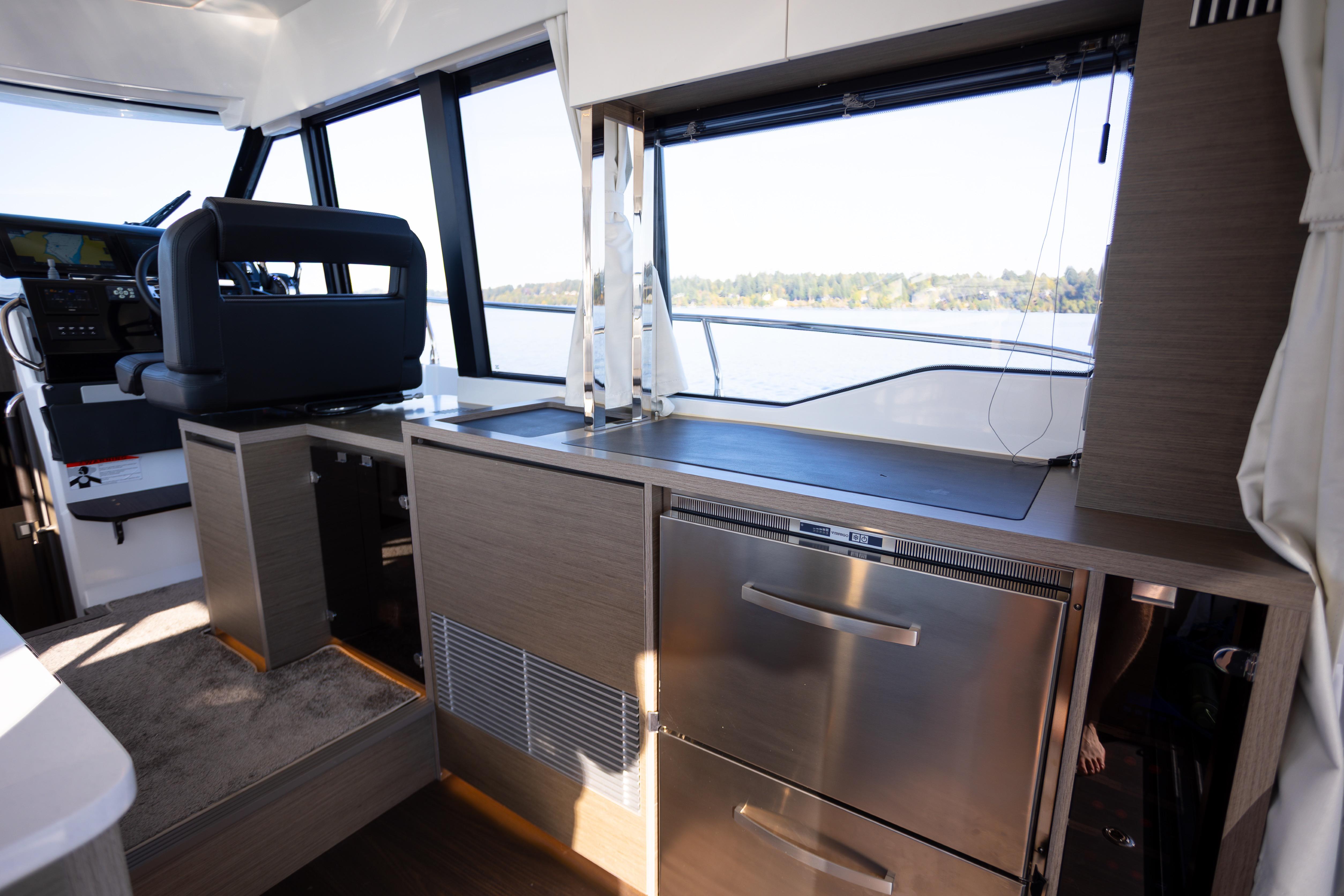 - Fully equipped galley with refrigerator, freezer, cooktop, microwave, and ample storage
