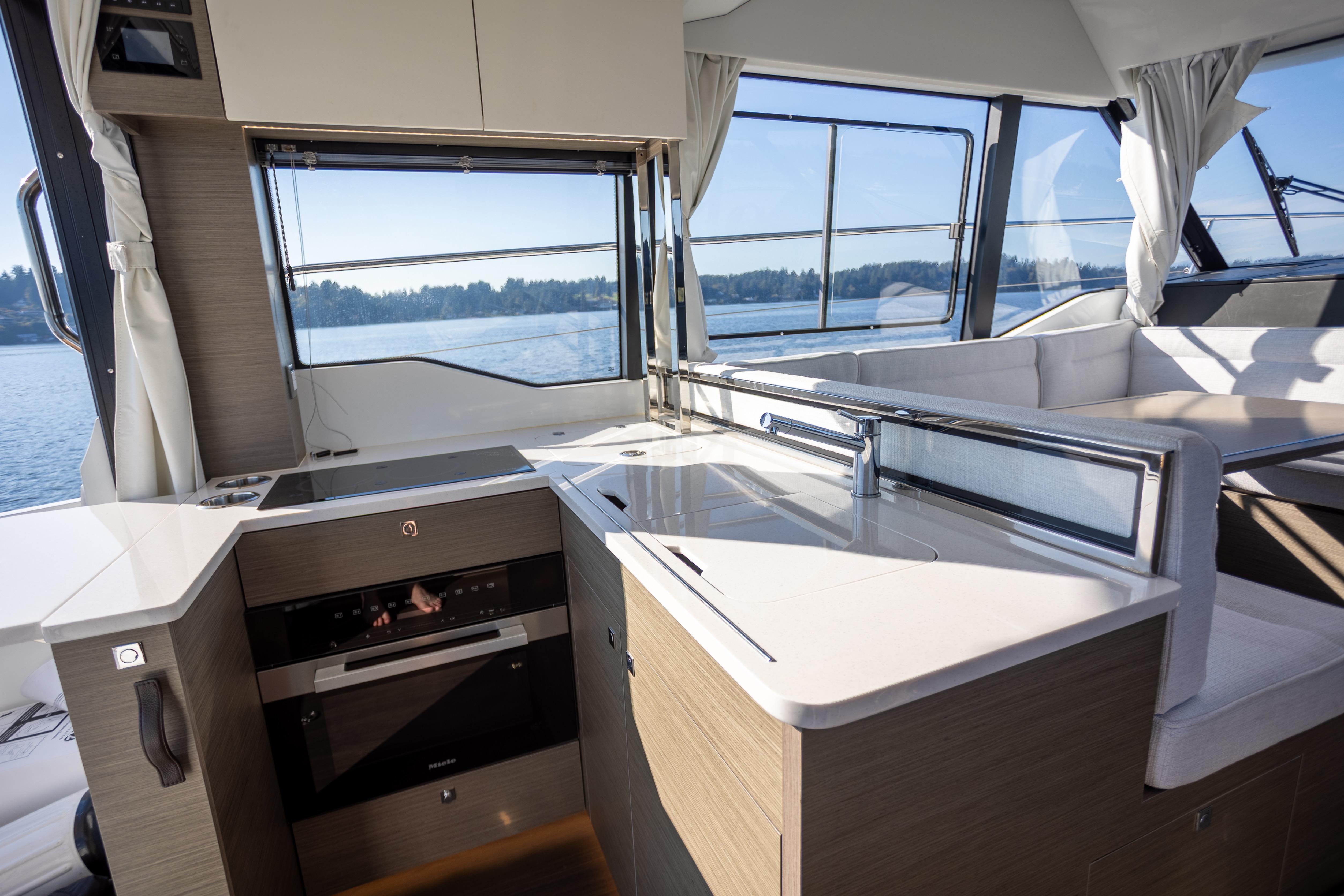 A large sliding glass door opens to a bright, open-concept salon with panoramic windows and a retractable sunroof. The aft galley serves as the hub for entertaining, equipped with: