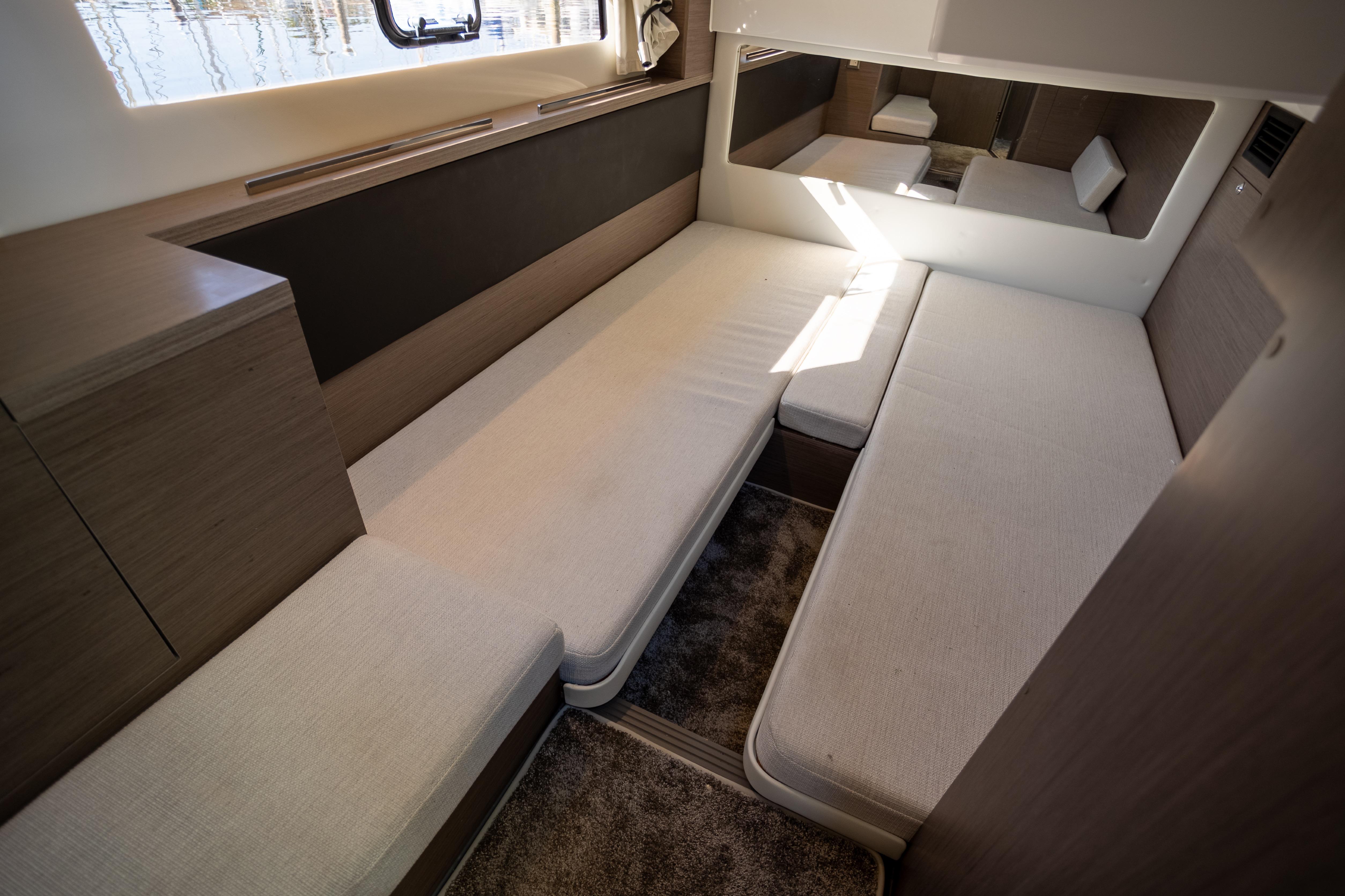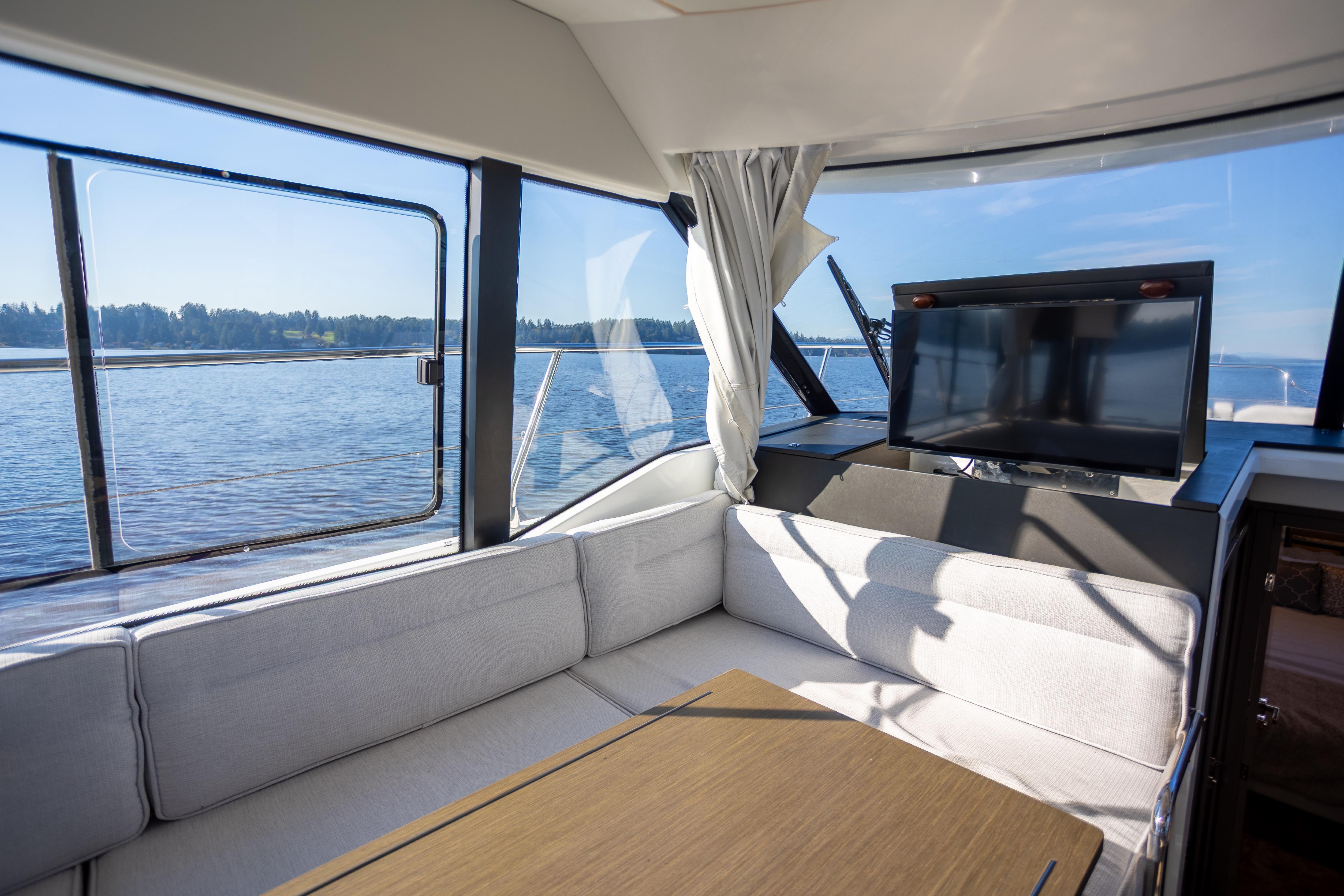 To port, a U-shaped dinette comfortably seats six and converts to a berth when needed. The helm seat rotates to face the table for social settings.