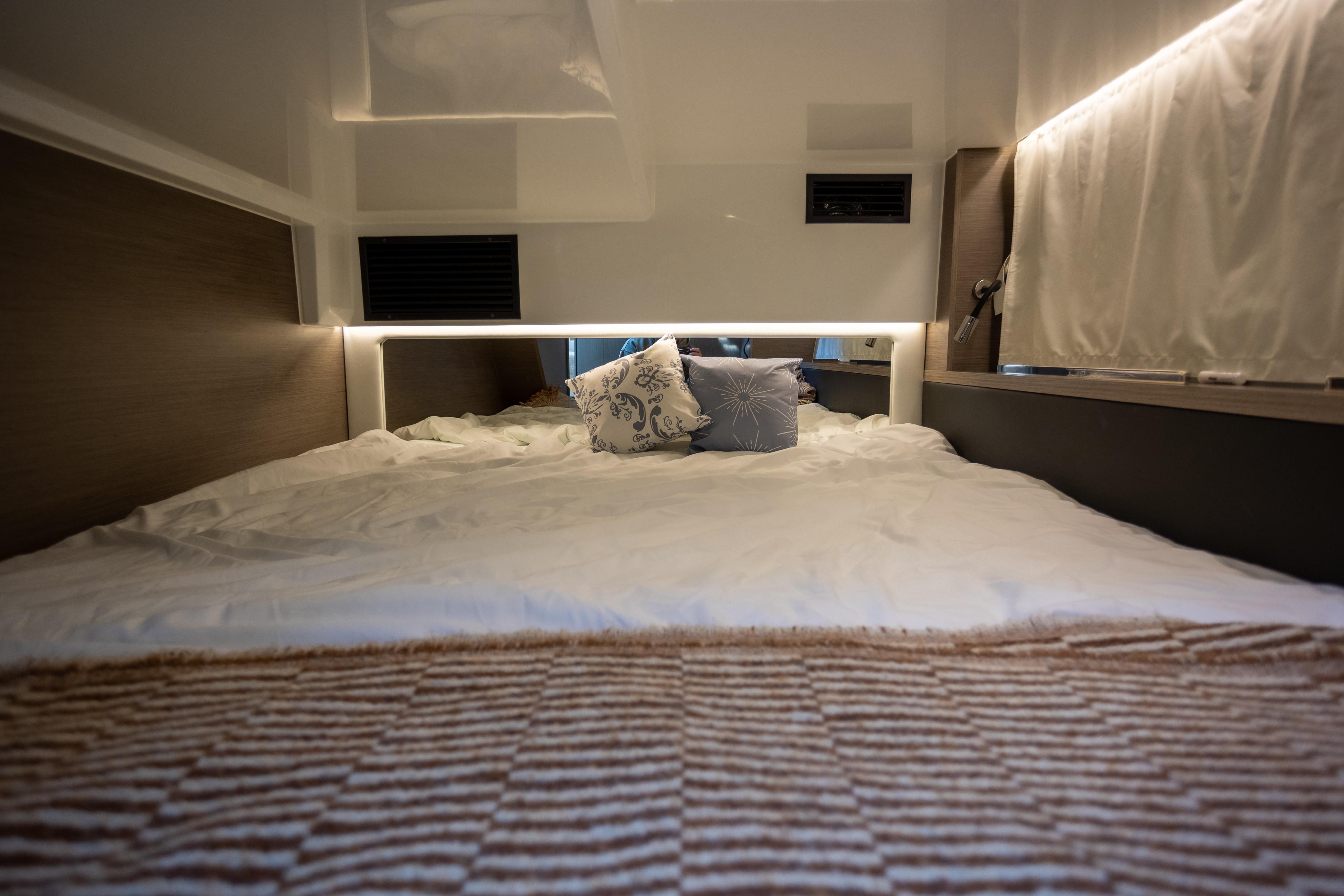 - Master Stateroom (midship): Full beam, walkaround queen berth with memory foam topper, large hull windows, skylight, hanging locker, and ensuite with separate shower.