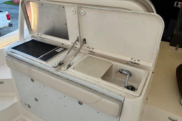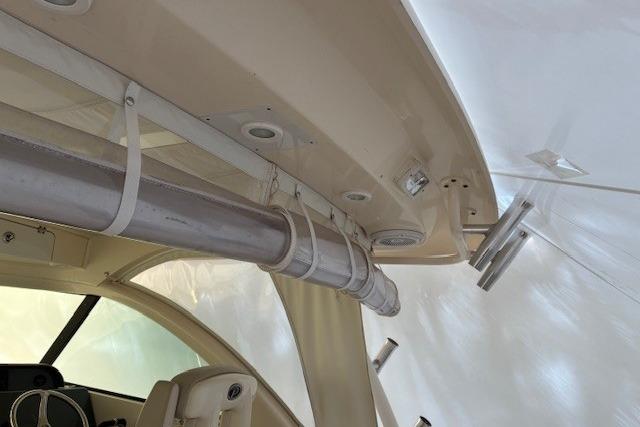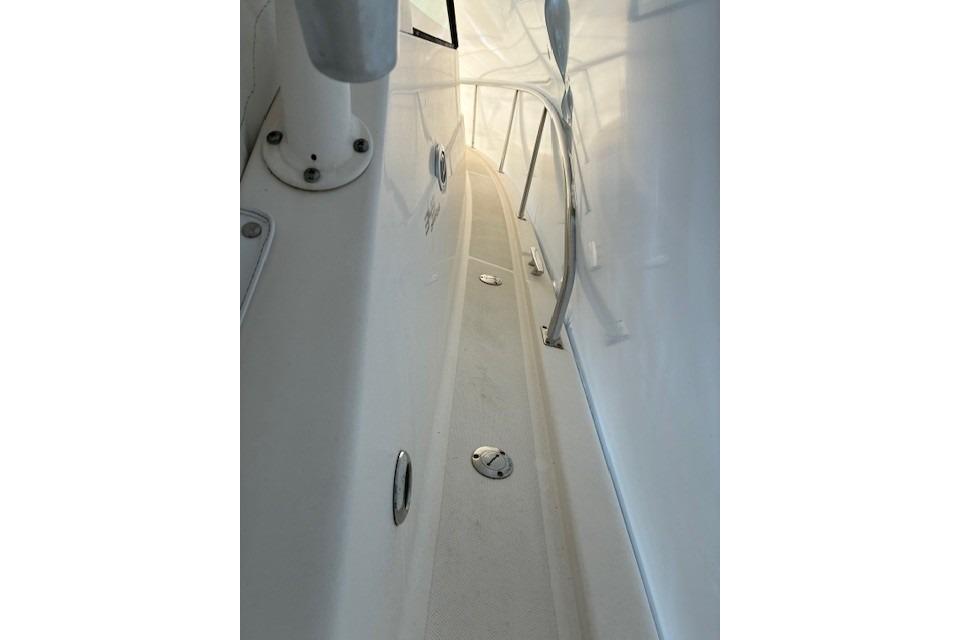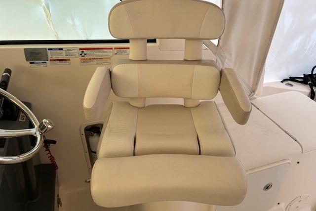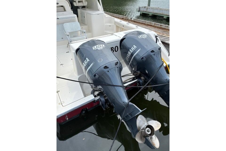 The OS 345's hull has been specifically designed for twin Yamaha 350 hp 4-stroke engines, which provide optimal performance with minimal horsepower. Standard bow thrusters will give any captain the confidence to dock in close quarters, wind or strong currents. The express design includes an open helm with optional bridge deck cooling with air conditioning and an aft canvas enclosure so you can escape the elements without escaping the view. This layout also affords quick access from the helm to the cockpit when you have more screaming reels than anglers. The cockpit includes ample seating and an electric grill for entertaining and a host of fishing features including a recirculating livewell, a comprehensive rigging station with locking tackle drawers, insulated fish boxes and enough elbow room that you're not running into each other.