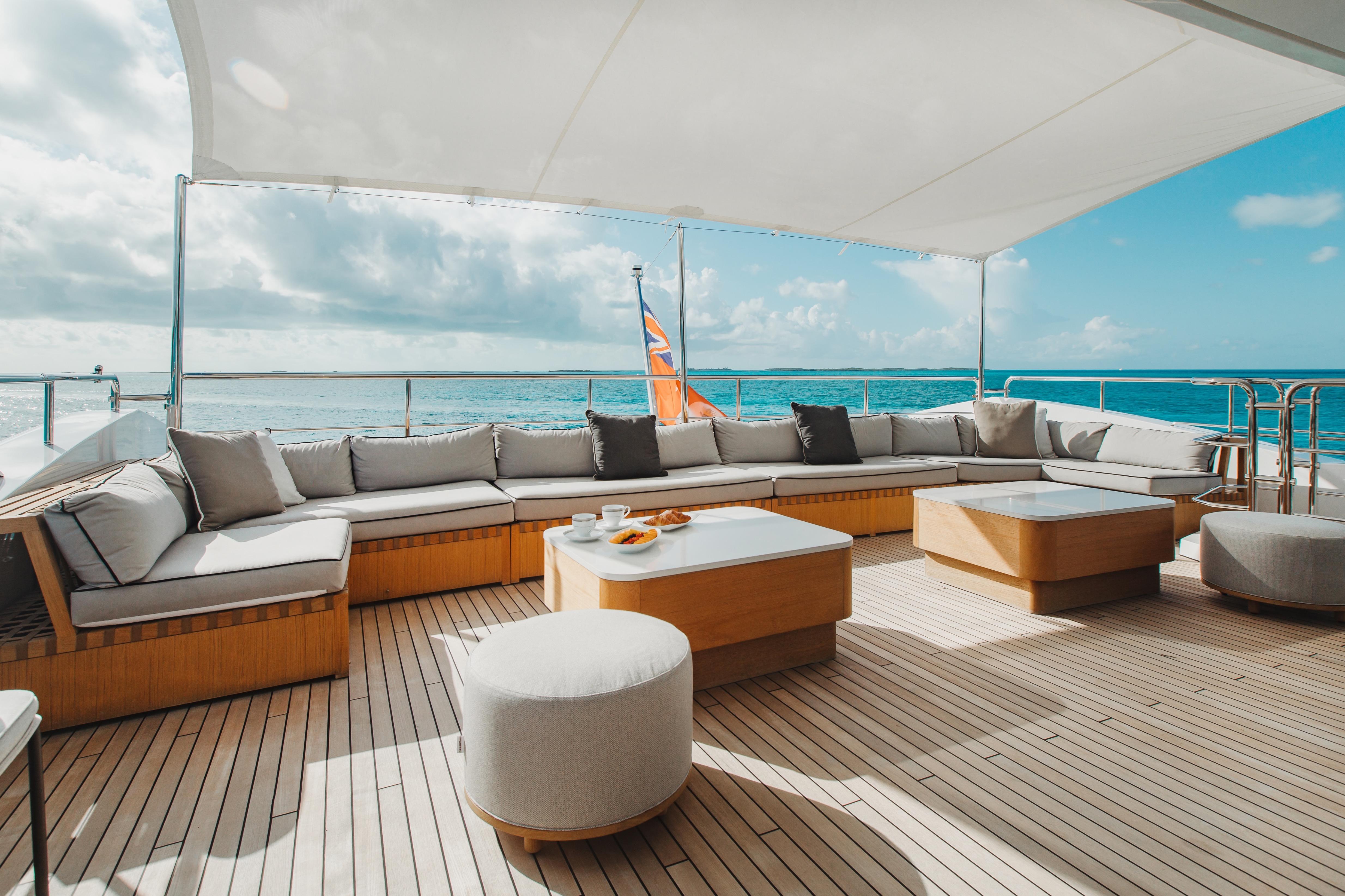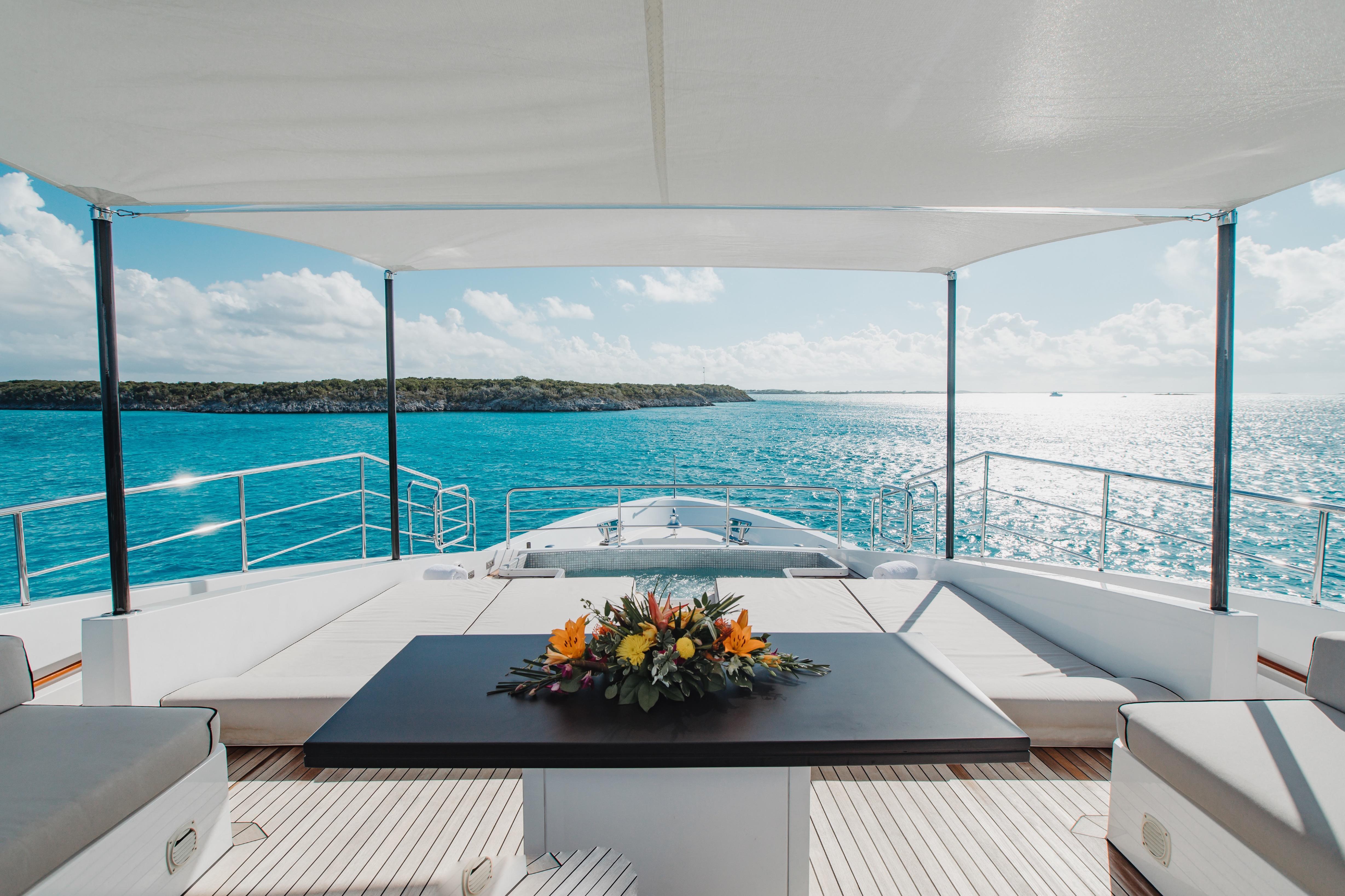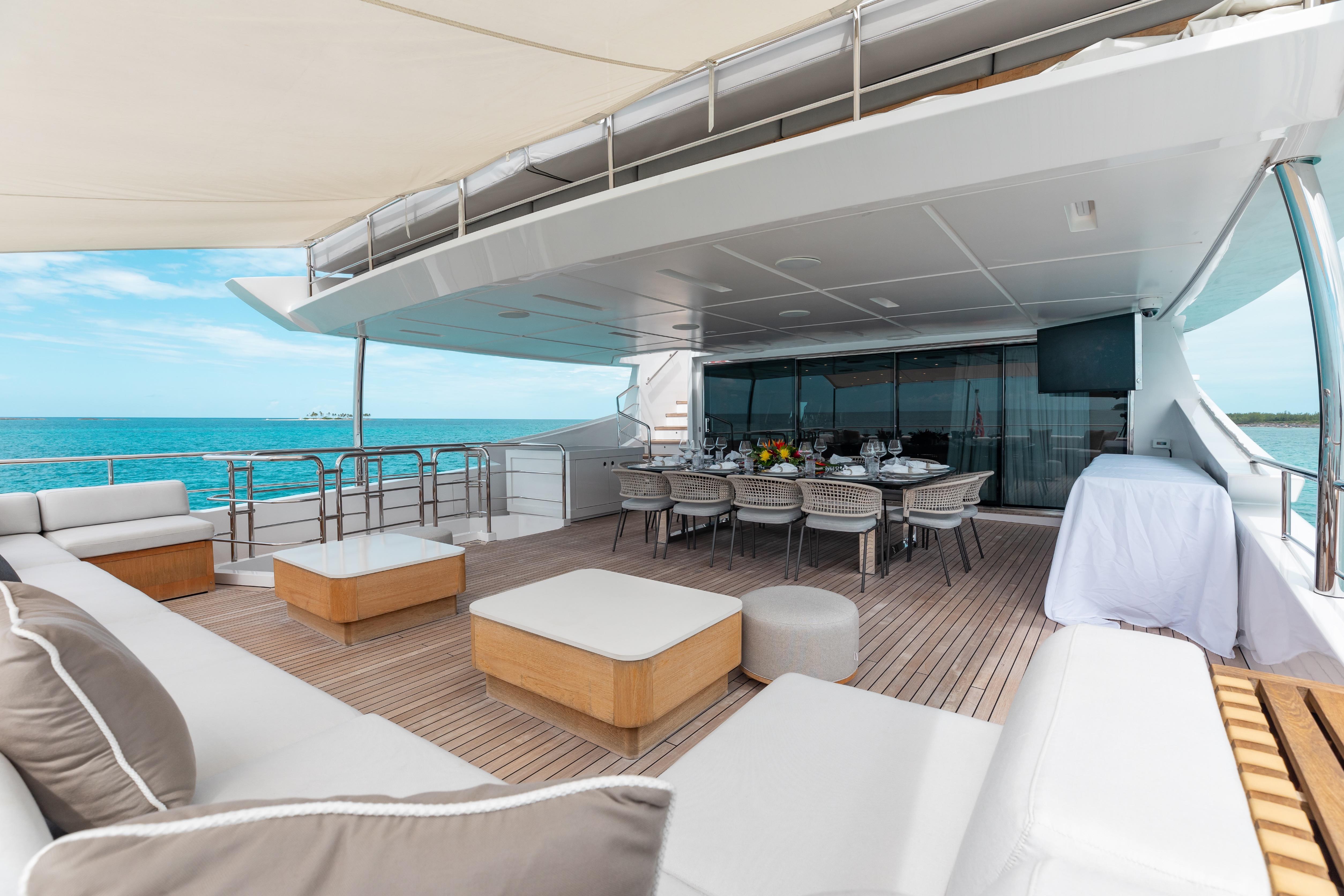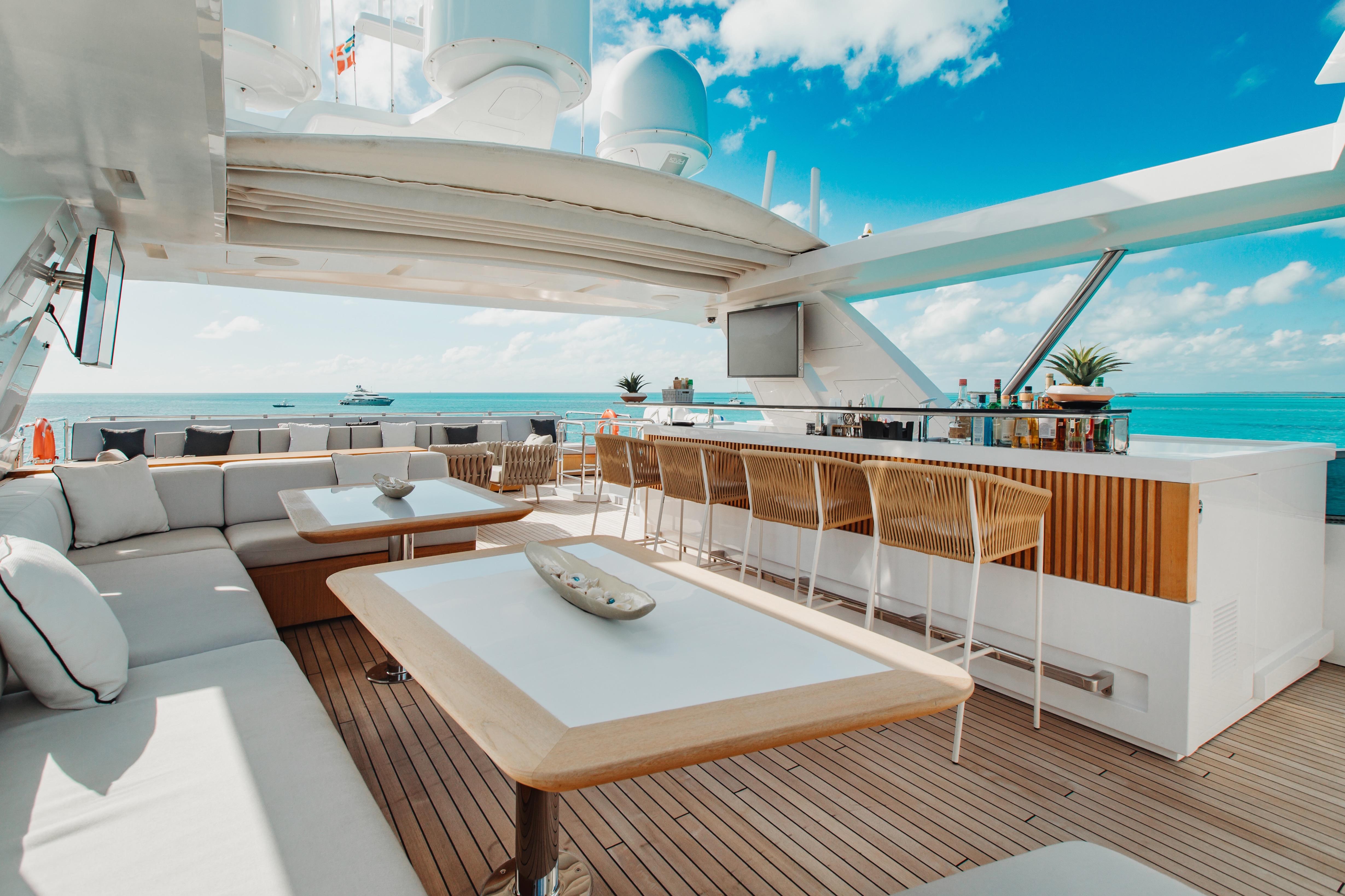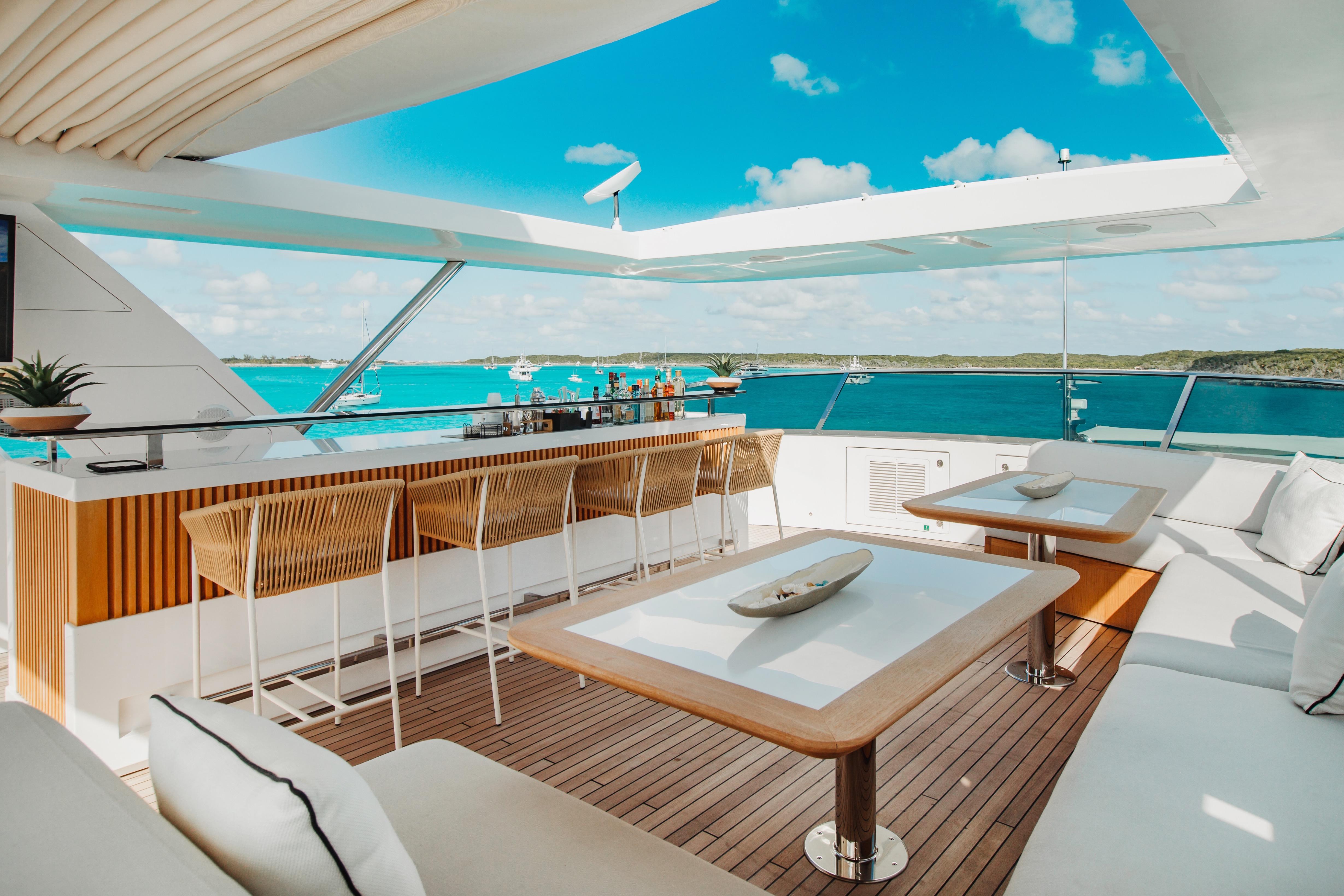 - Beach club at stern with bar, access to water toys and dedicated entertainment space