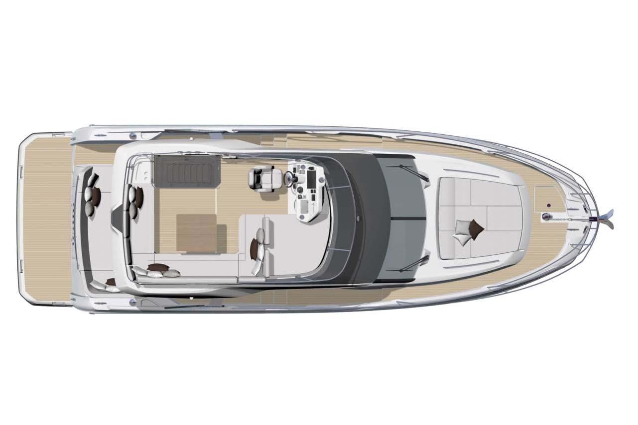 The cockpit itself is generously proportioned for this size class, featuring modular seating with an L- or C-shaped sofa, an extendable table, and optional exterior galley elements like a grill and sink. A hydraulic swim platform lowers for easy water access, tender launching, or lounging at sea level, enhancing the yacht's appeal for beach club-style days.