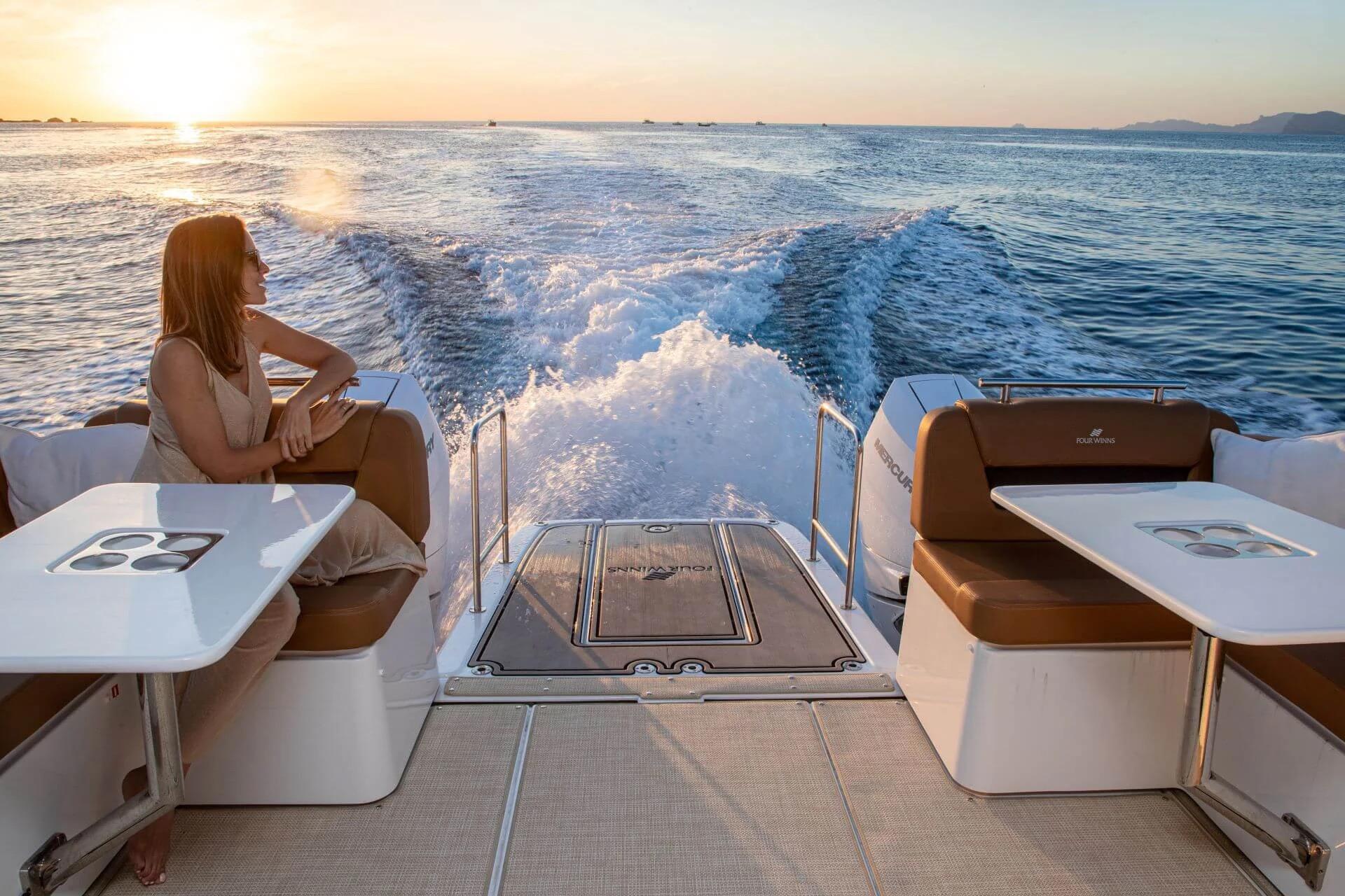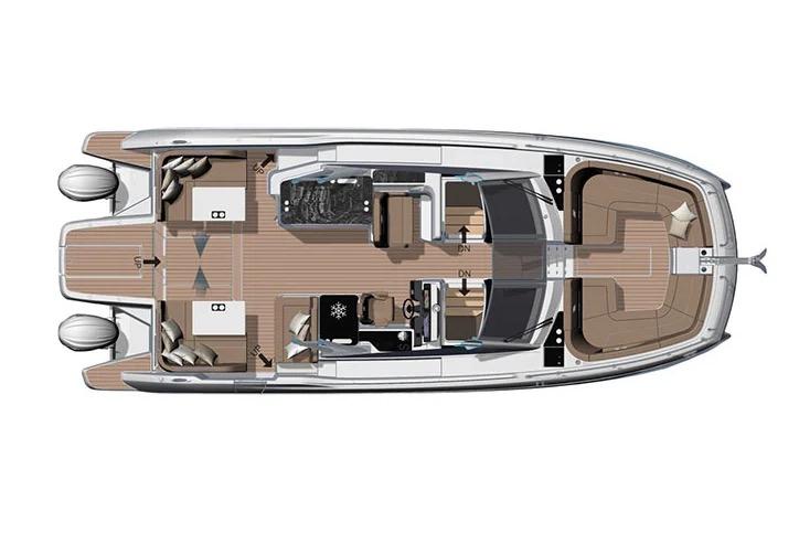 Powered by twin outboard engines (up to 700hp total), the TH38 provides efficient performance, joystick piloting for easy maneuvering, and ample fuel capacity for longer adventures. Premium finishes, customizable color palettes, and thoughtful details throughout highlight Jeanneau's commitment to quality and sophistication.