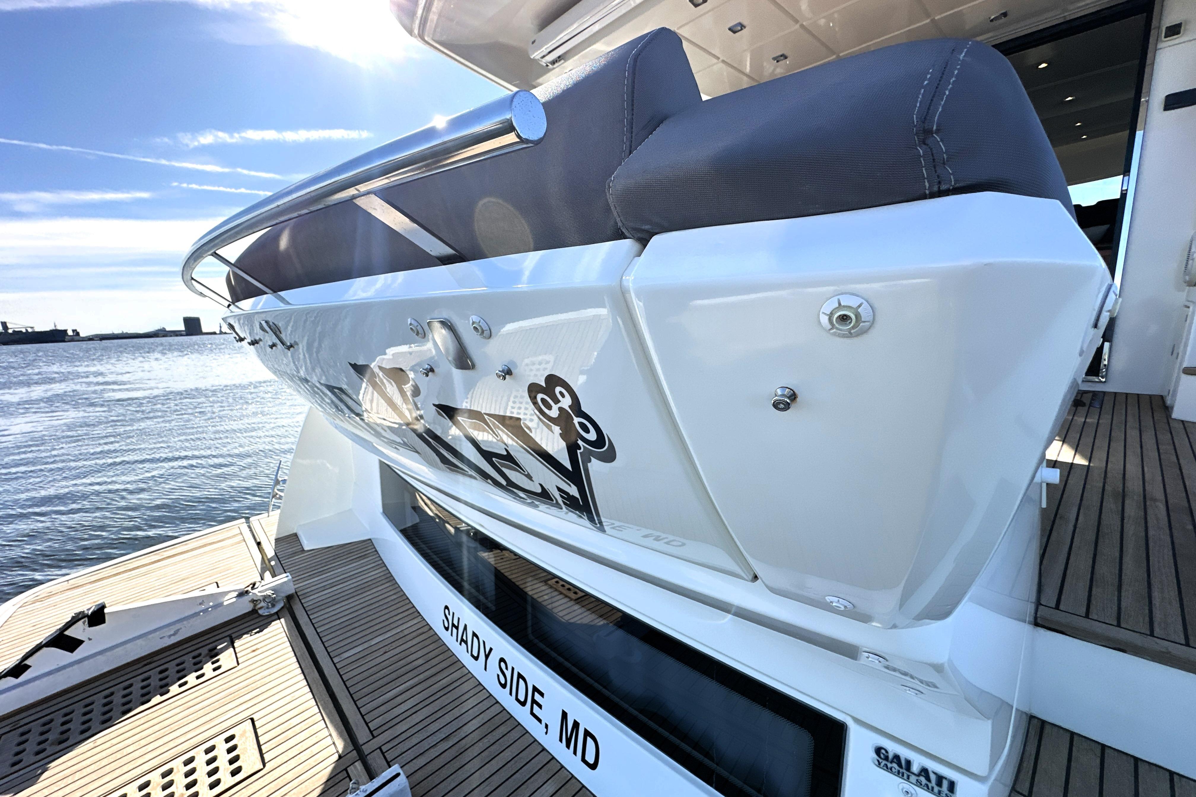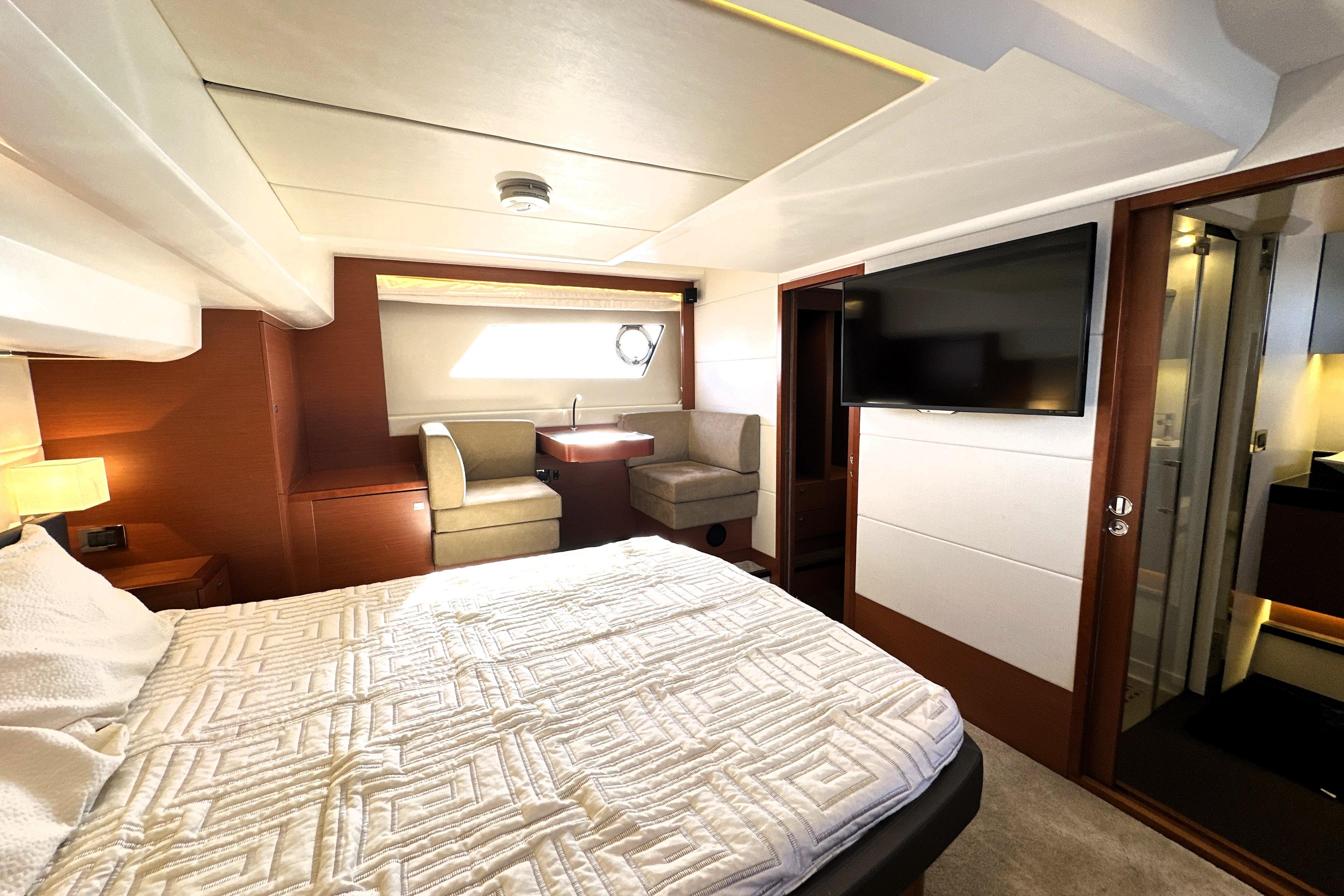 The aft-positioned galley, with direct access to the cockpit, makes entertaining seamless whether indoors or out. Below deck, the yacht offers three spacious staterooms, including a full-beam owner’s suite with en-suite head and full walk-in closet, providing privacy and comfort usually reserved for much larger yachts.